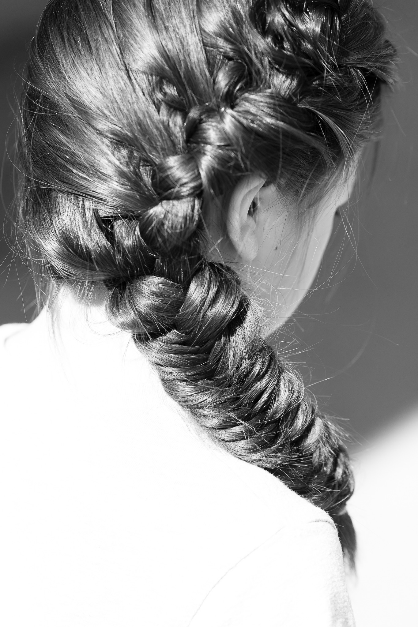 Fullfør fletten og vær oppmerksom på at håret hele tiden skal jobbe med to deler.