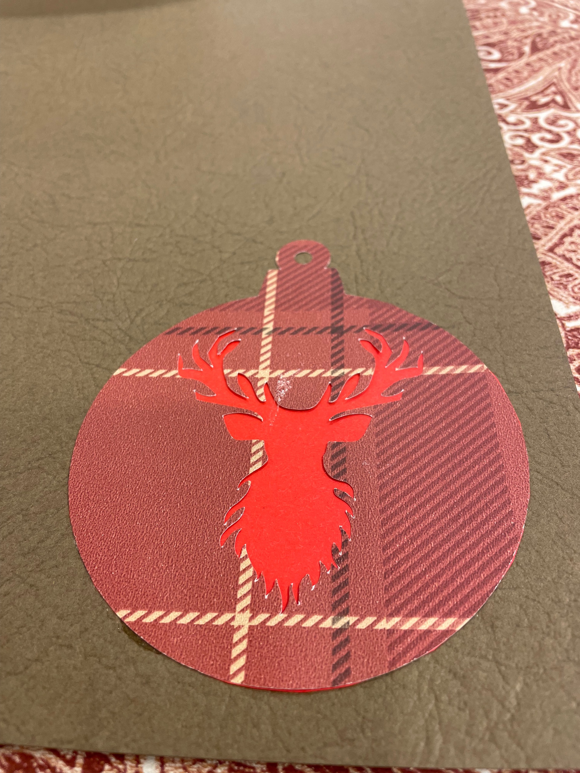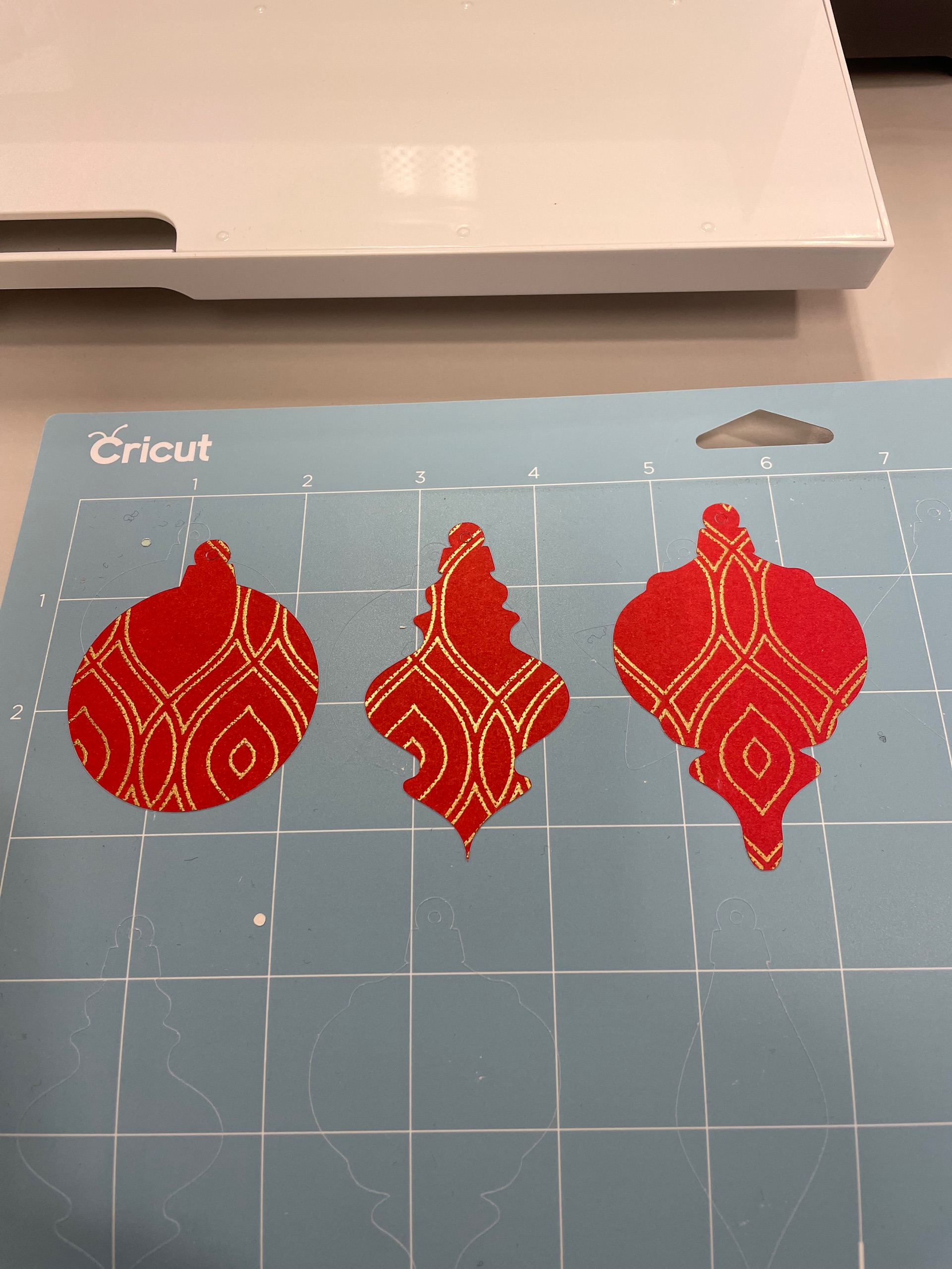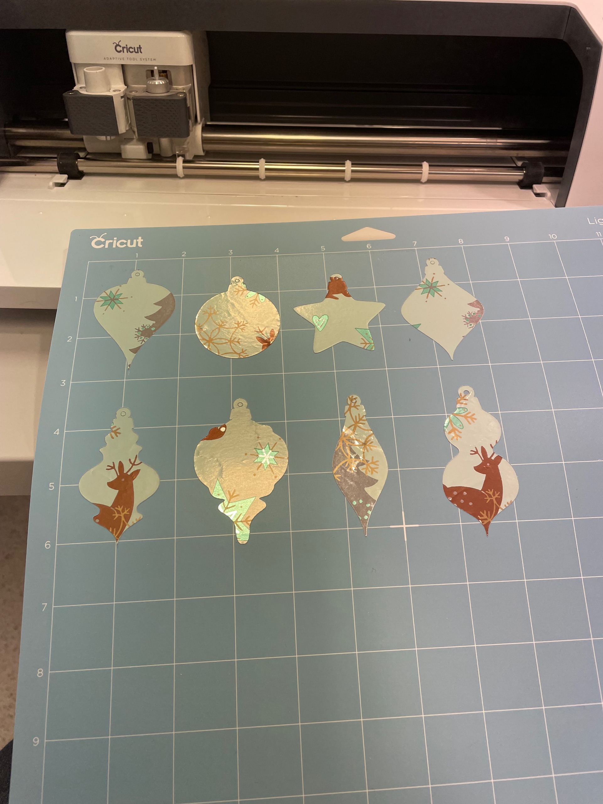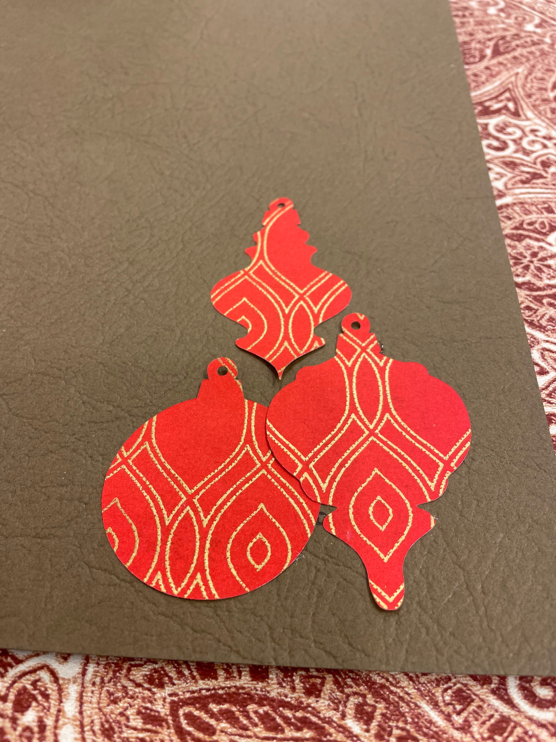 - Du har nå kuttet din egen julekule og det gjenstår å «plukke» vekk overflødig materiale og lime ditt design på en restekartong eller annet materiale du vil bruke til julekort. Vi fant noen gamle brune kort som var perfekt til dette, kanskje har du også noe som kan brukes?