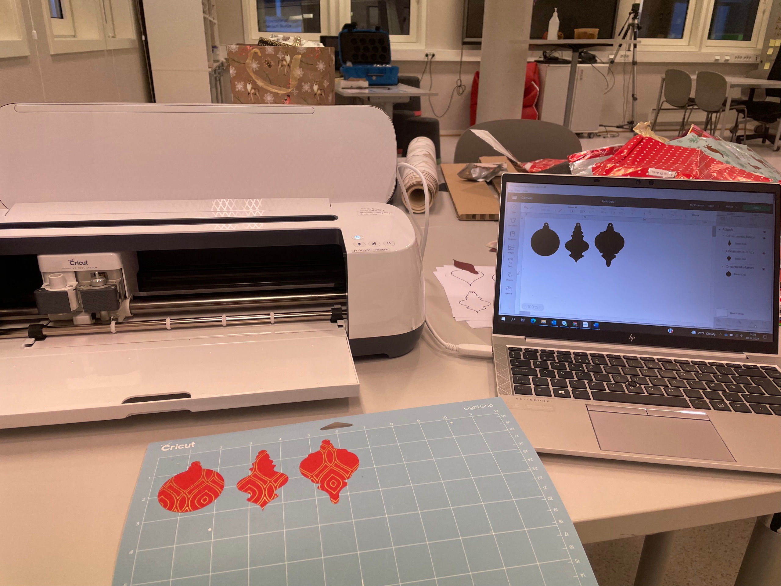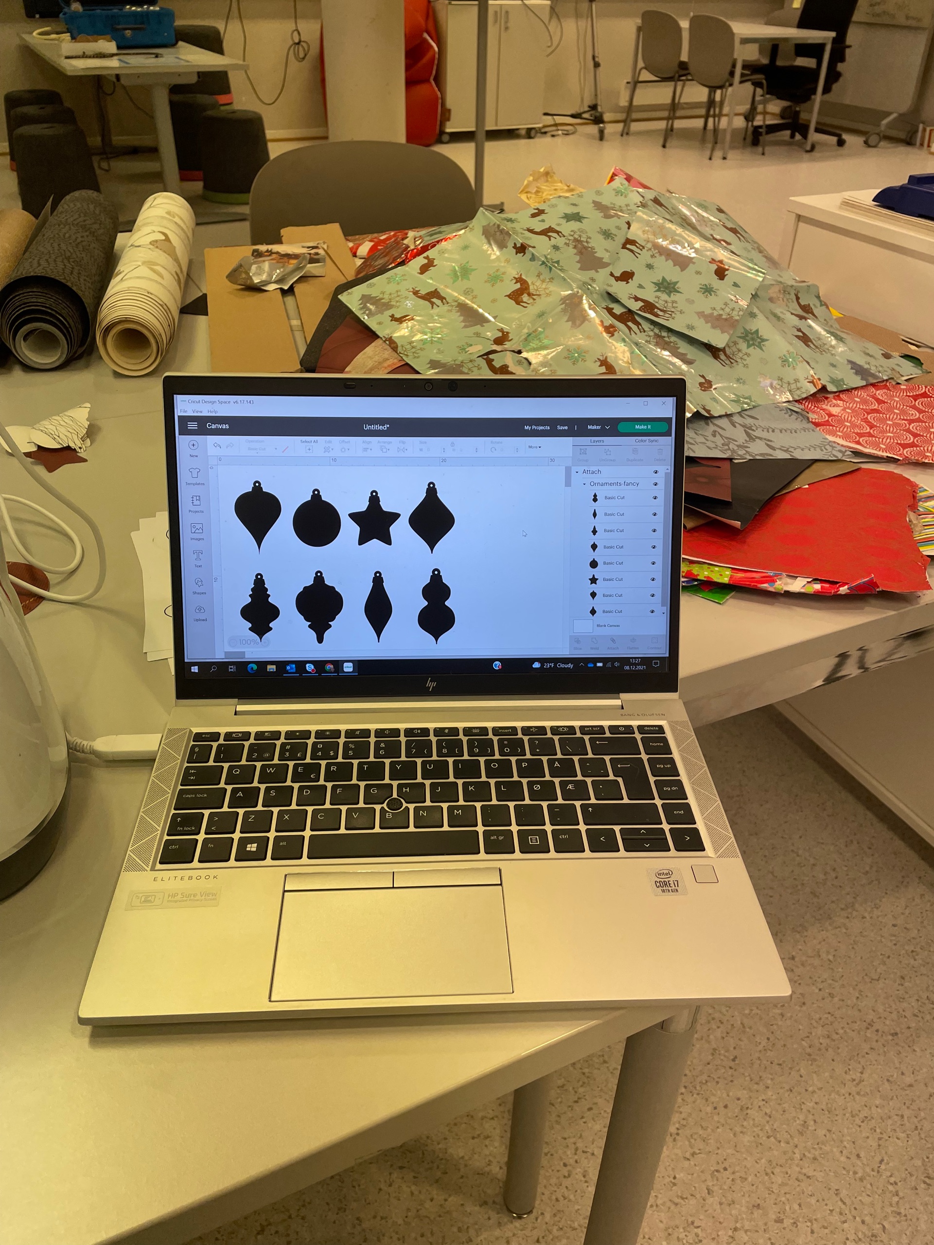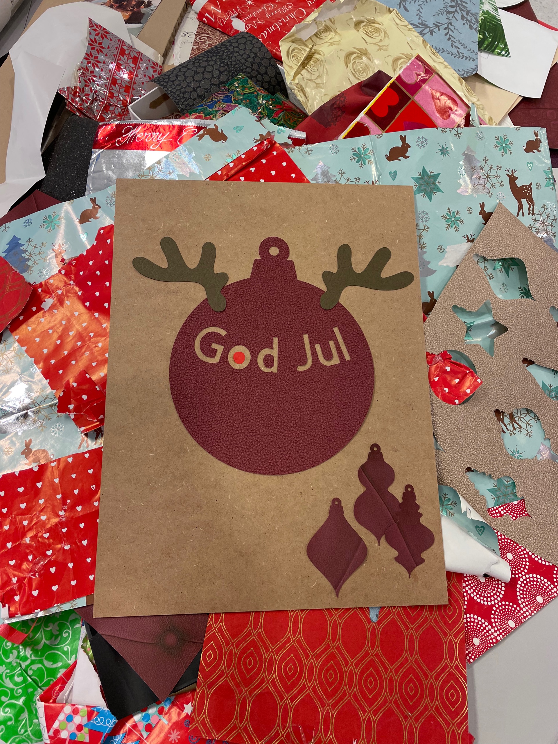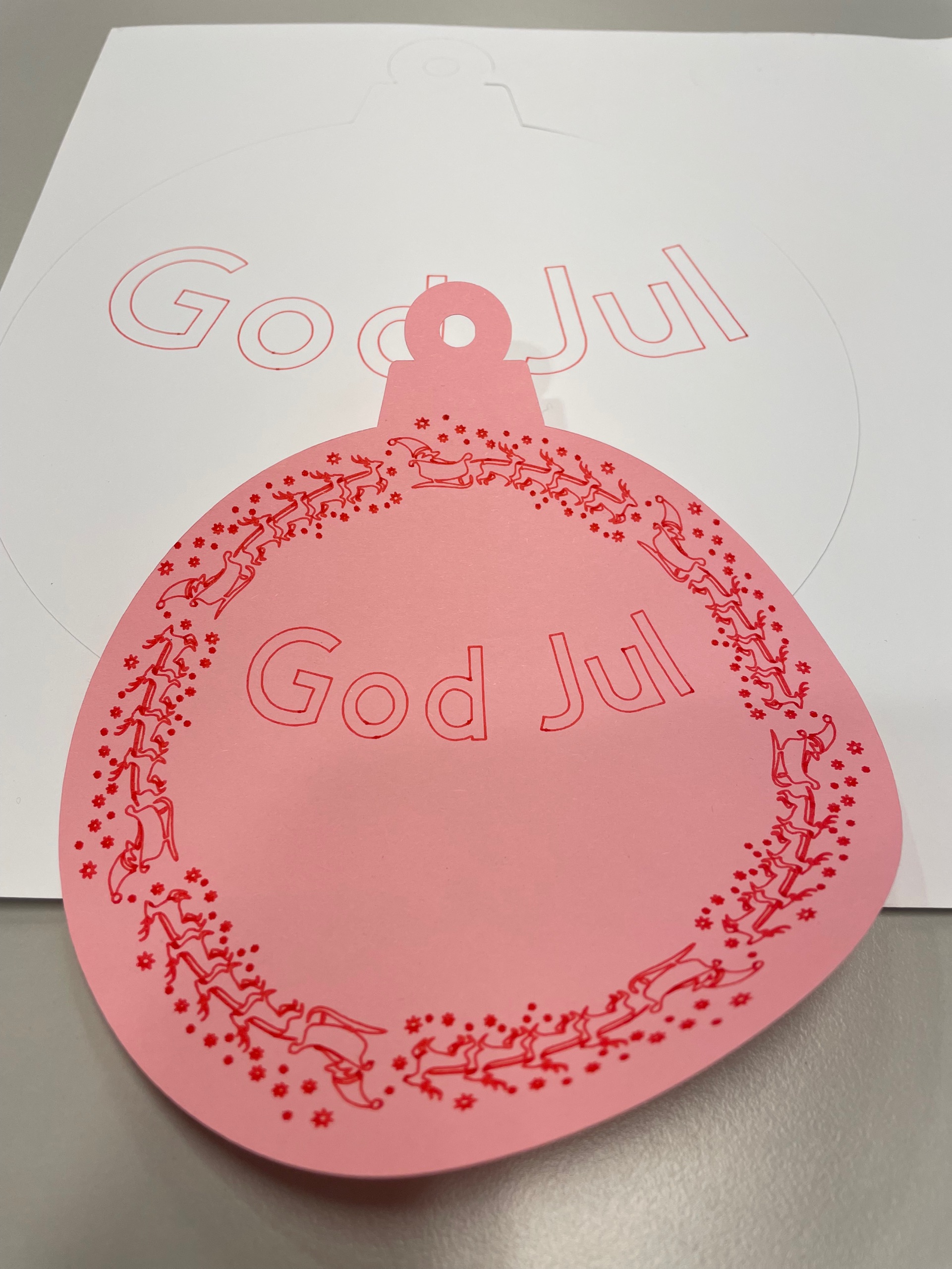 Skaperoppdrag: Lag et design til et julekort med julekule som tema. Det kan være julekule som form, julekule med et motiv eller med tekst. Designet kuttes med en smart kuttemaskin i et gjenbruksmateriale. Kombiner dette med restekartong eller materialer du har tilgjengelig.