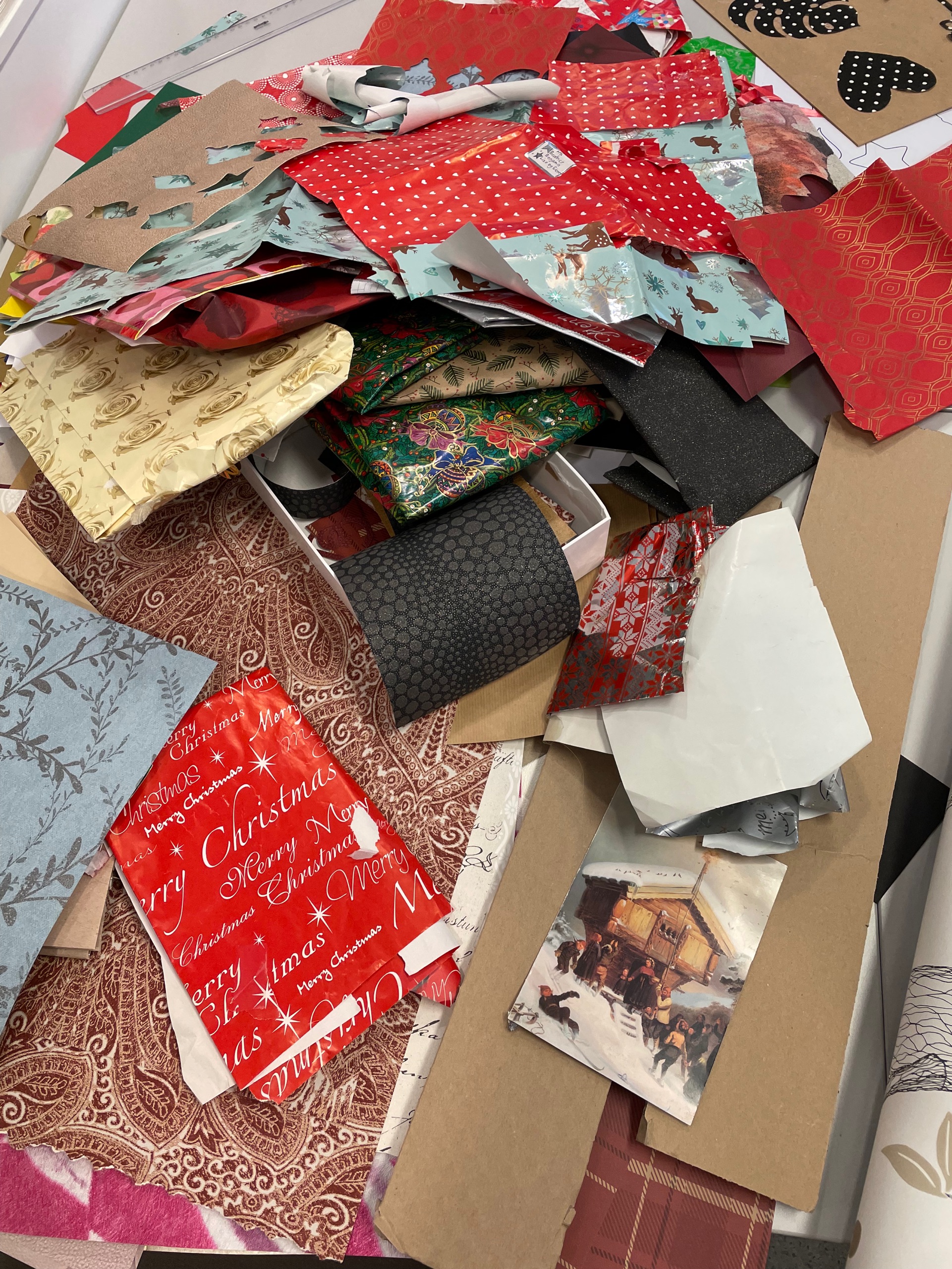 - Gjenbrukspapir slik som brukt julepapir og tapetrester, restekartong