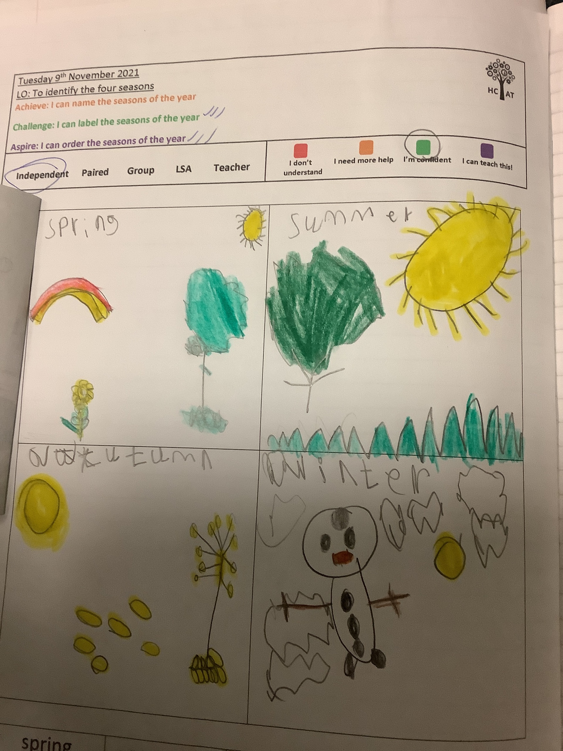 We have explored the seasons this half term, focusing on Autumn and Winter. We have observed the types of weather associated with Autumn and Winter, discussed the changes that occur in nature during the two seasons and compared the amount of daylight we get. We learnt a song about the seasons and it is very catchy!