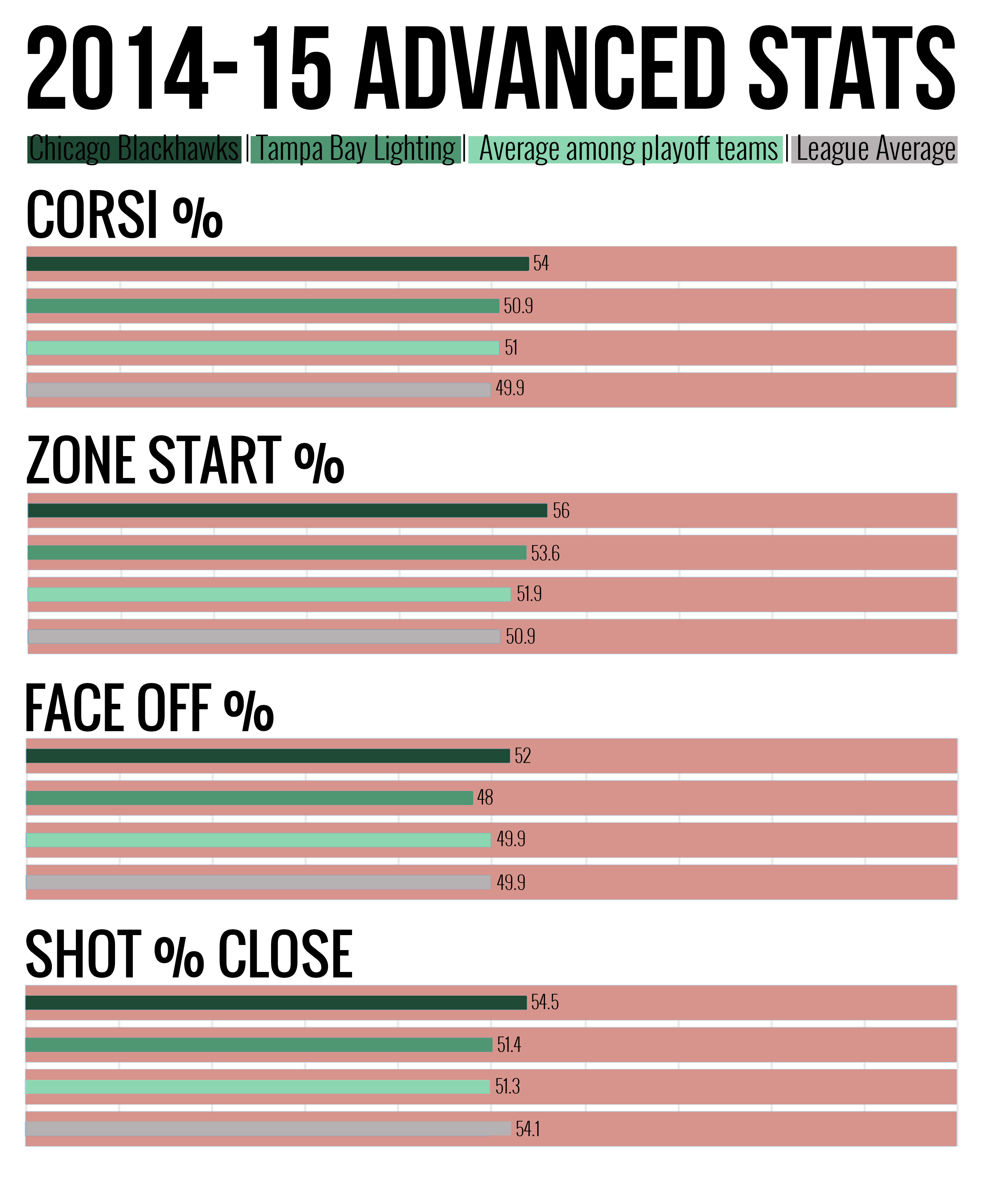 Faceoff (FO%) and offensive zone start percentages (oZS%) are more straight forward. The faceoff percentage tells us how often the team wins a draw. An offensive zone start percentage above 50 means that a team starts the majority of plays in the offensive zone. If a team falls below 50 percent, they start most faceoffs in the defensive zone.