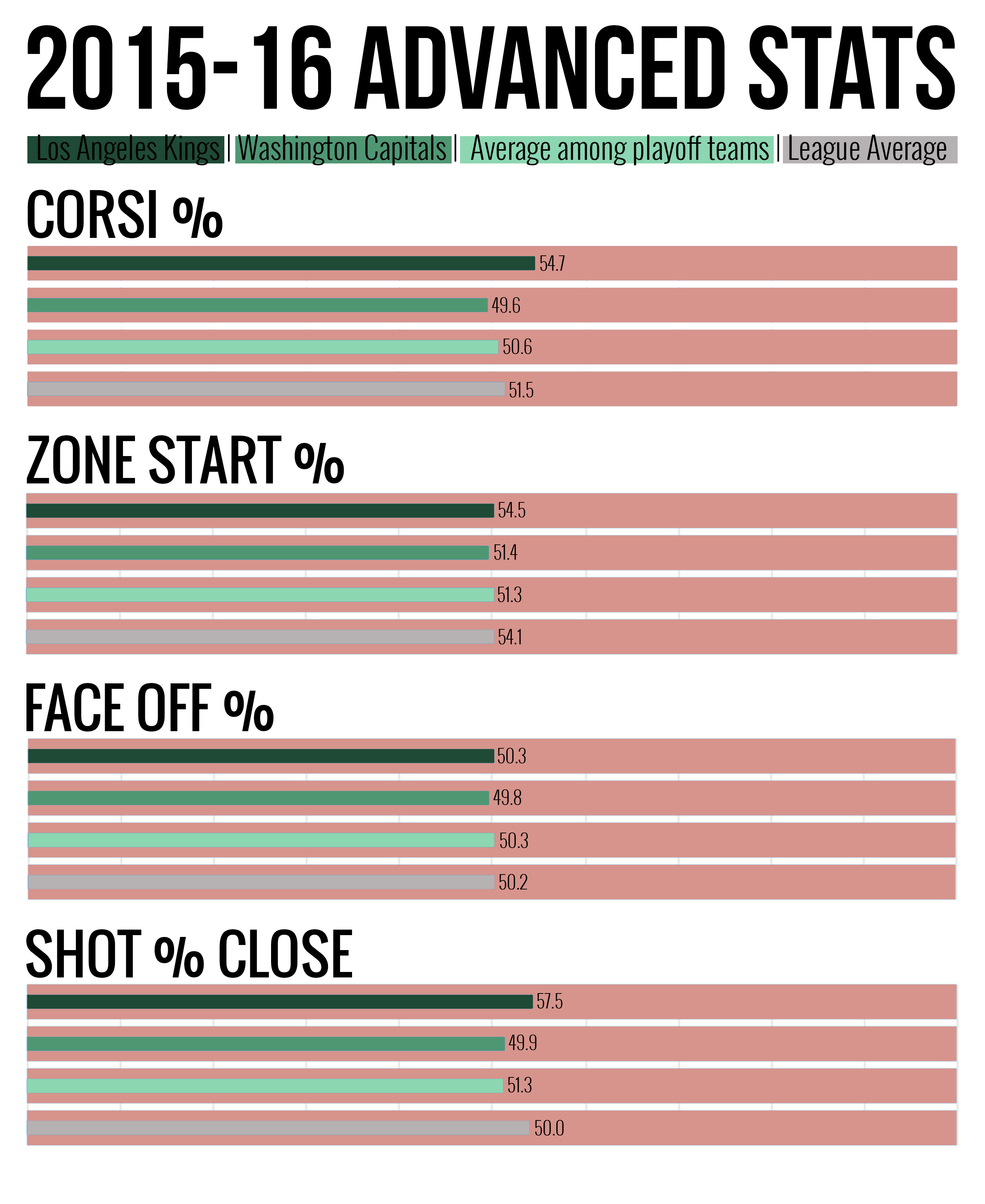 If the Kings continue to perform at their current rate, they stand a good chance of making it to the Stanley Cup Final. Their position is very similar to last year’s Black Hawks. They may not be at the top of the standings with the Washington Capitals, but their advanced performance factors make them an intimidating opponent this postseason.