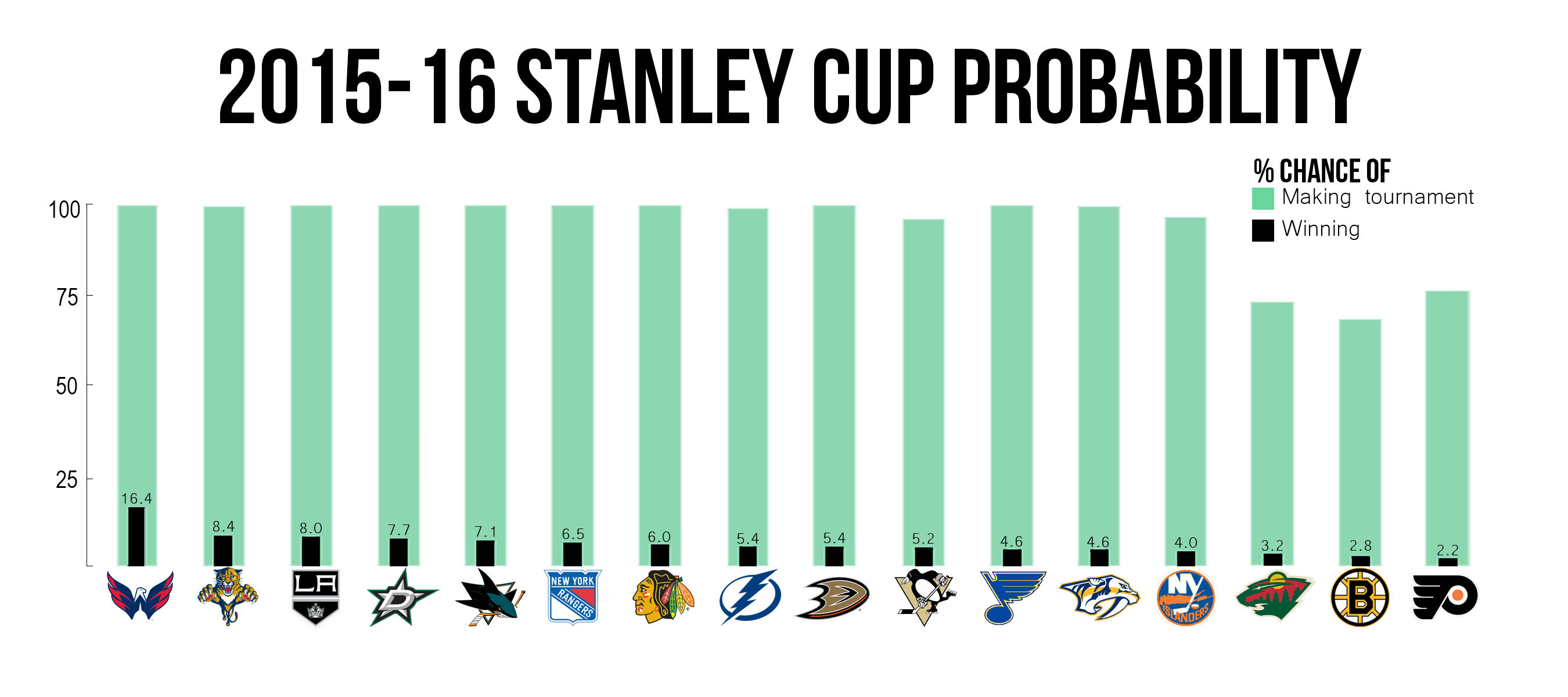With less than ten games left in the 2015-16 season, fans have a good idea of what teams they will be watching come playoffs. Hockey-reference.com calculated the probability that each NHL team will make playoffs and their chances of winning the Stanley Cup. These percentages are based on 1,000 simulations of the remainder of the season, calculated daily.