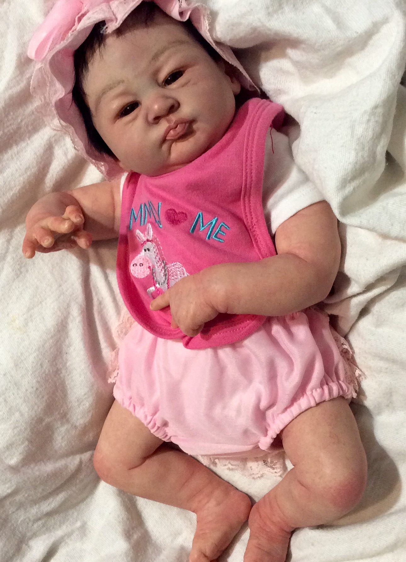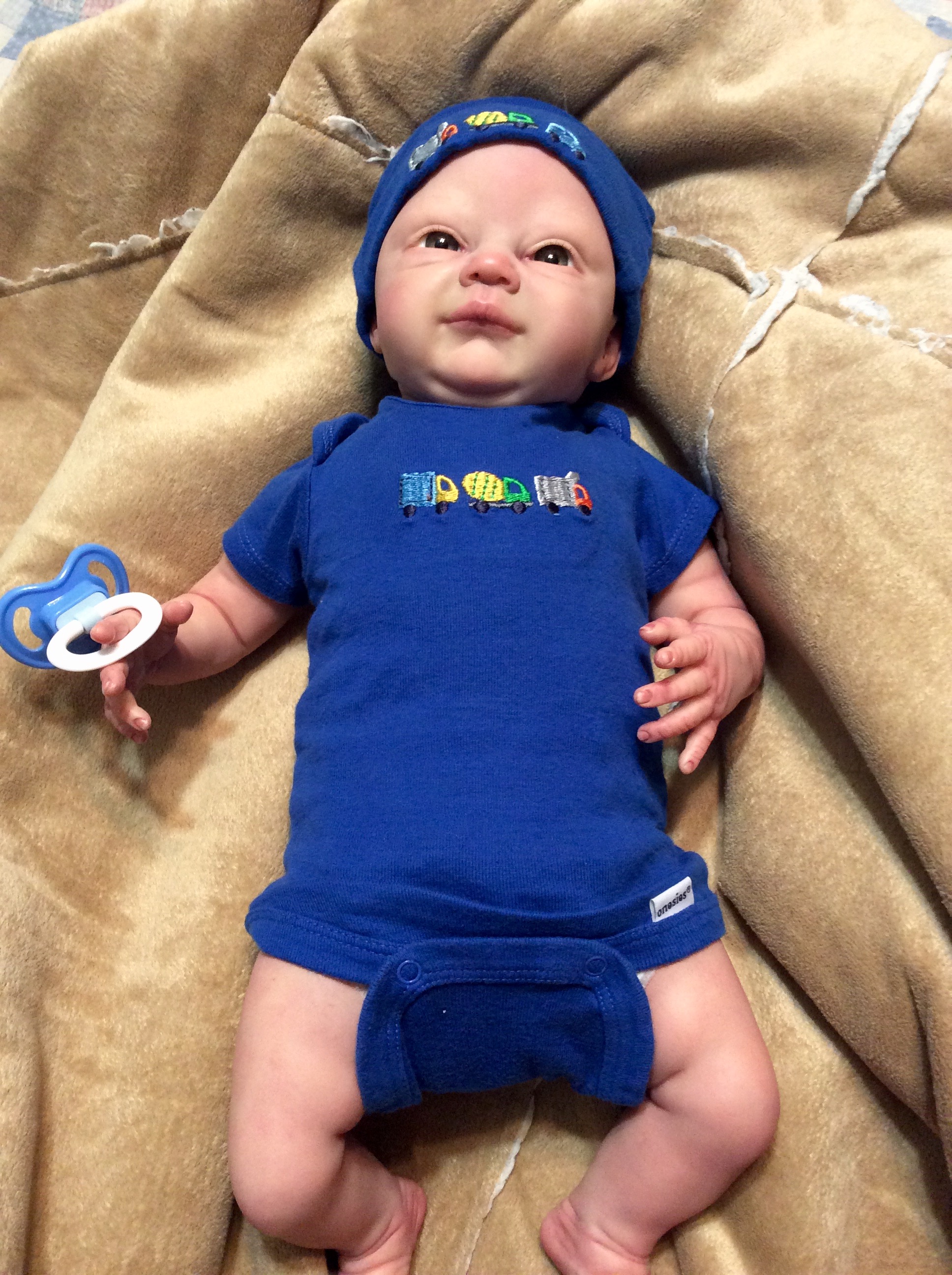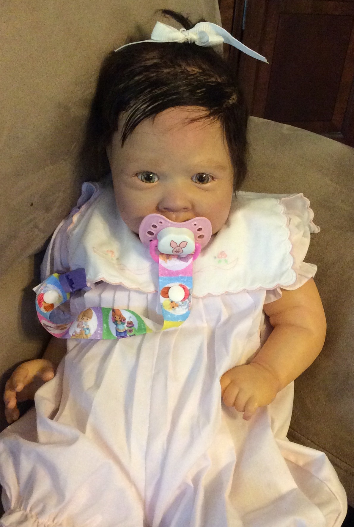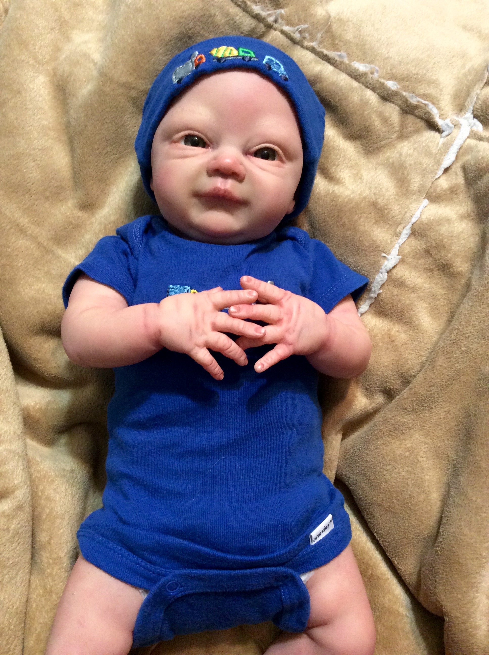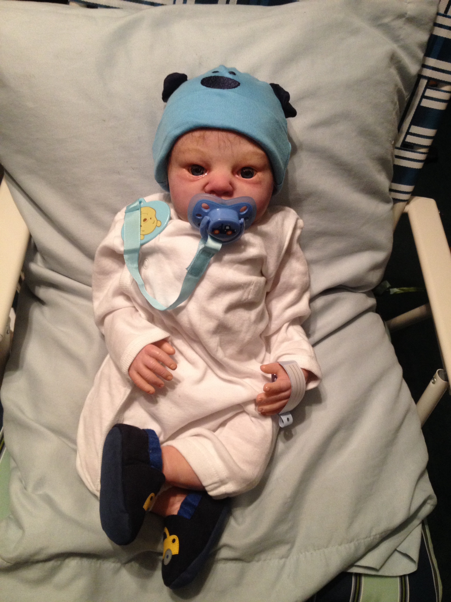 I hope you have enjoyed taking a peek at some of the babies I've "reborned", I have done memorial babies and "look alike babies. I put lots of hours into each one, and I enjoy every minute of it. These are a soft vinyl that I have painted with Genesis heat set paints, using several transparent layers for added realism. They are weighted with micro glass beads for a real baby feel, opened nostrils, magnetic pacifiers & for those with hair, it has been micro rooted with needles placing about two hairs at a time, then sealed.