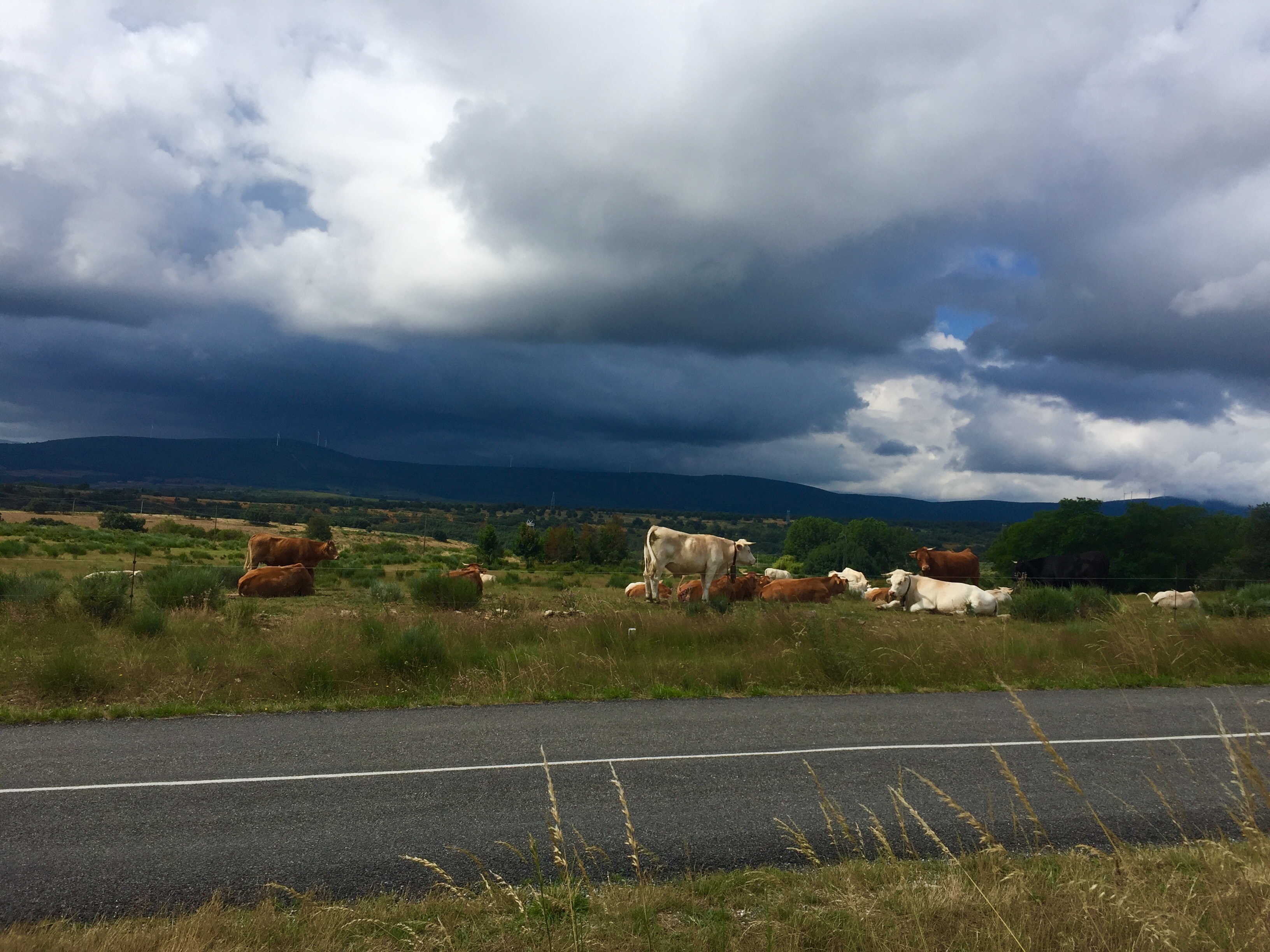 Uvejr på vej, det bulder og brager i bjergerne. Køerne virker uforstyrret af det.