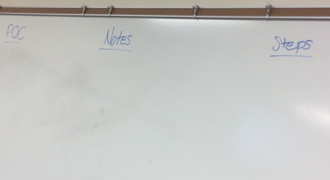 The whiteboard is split up into three sections, POC, Notes, and Steps