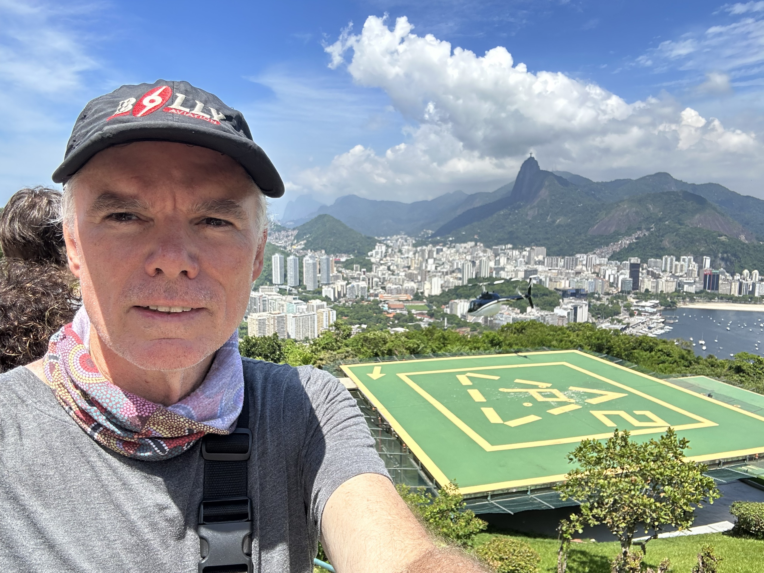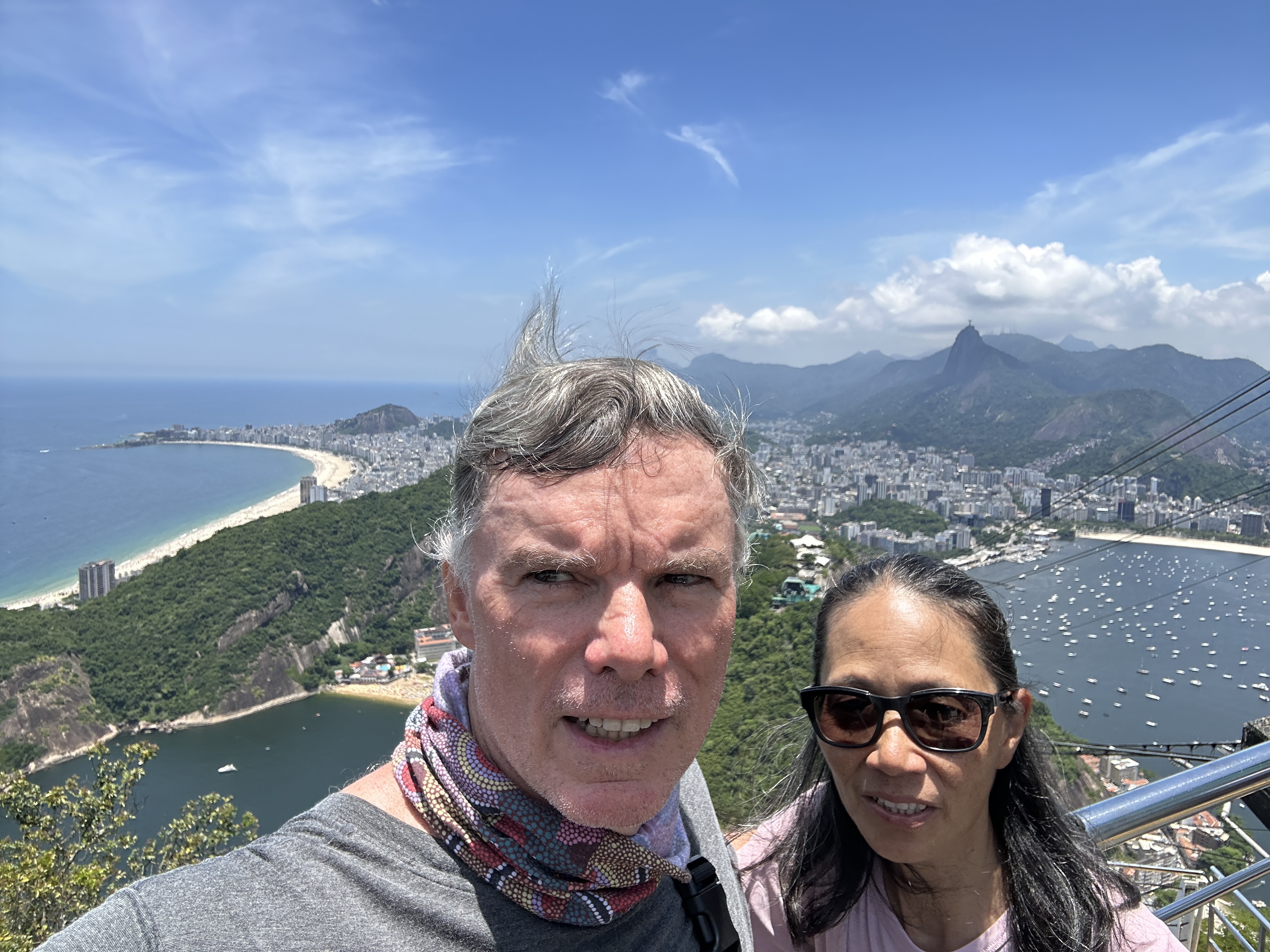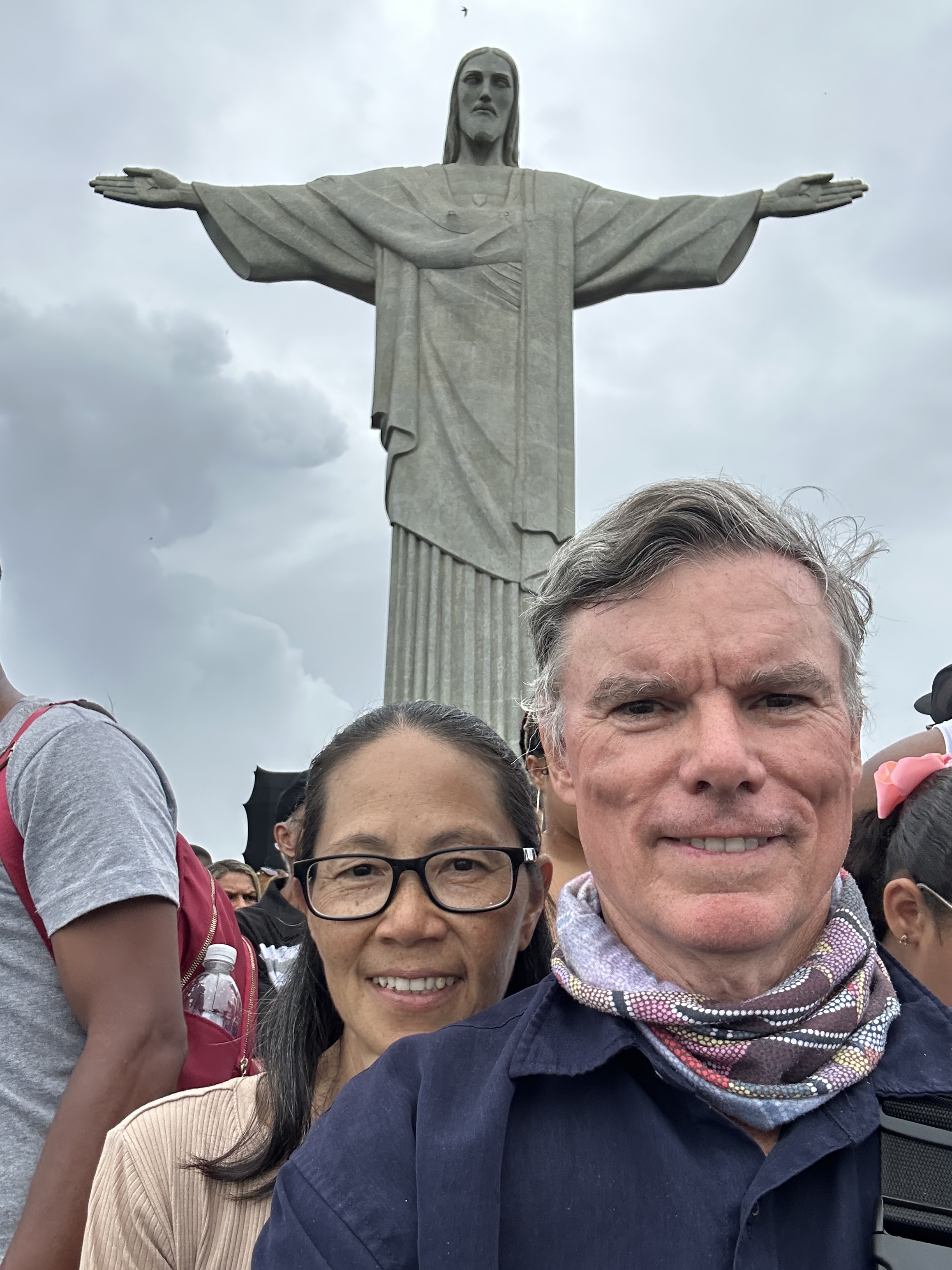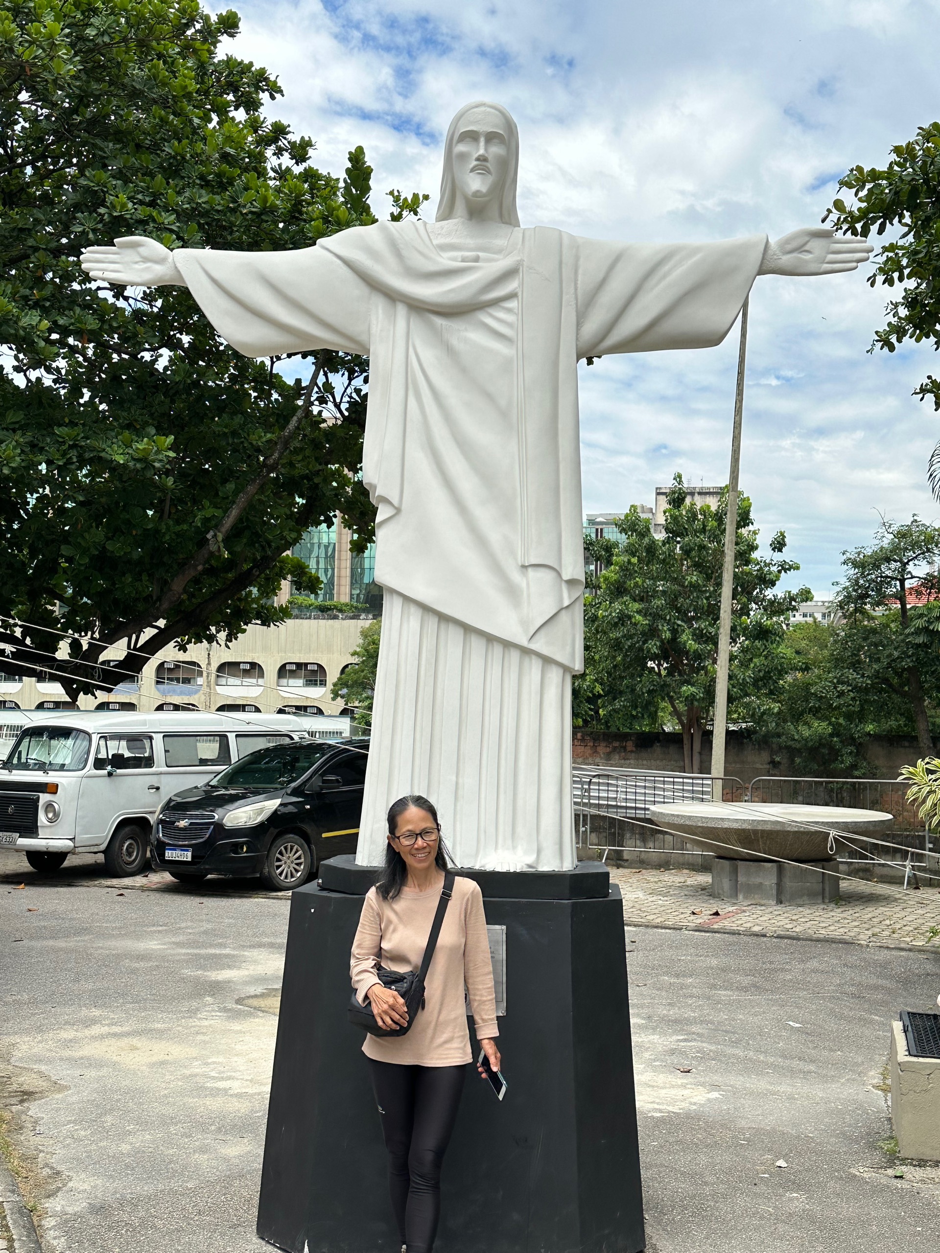 Copacabana beach on the left and the Christ the Redeemer statue above Helen’s head.