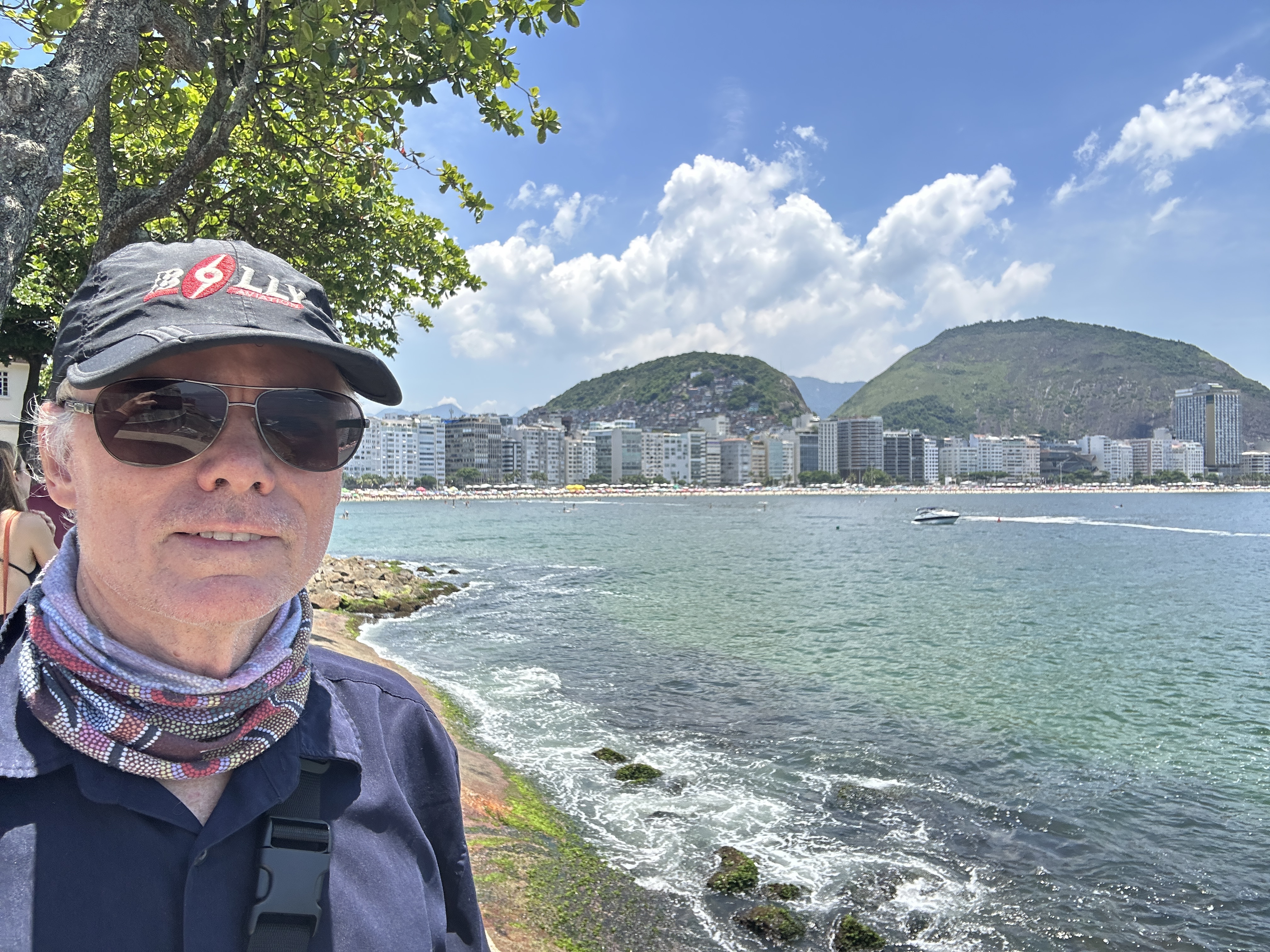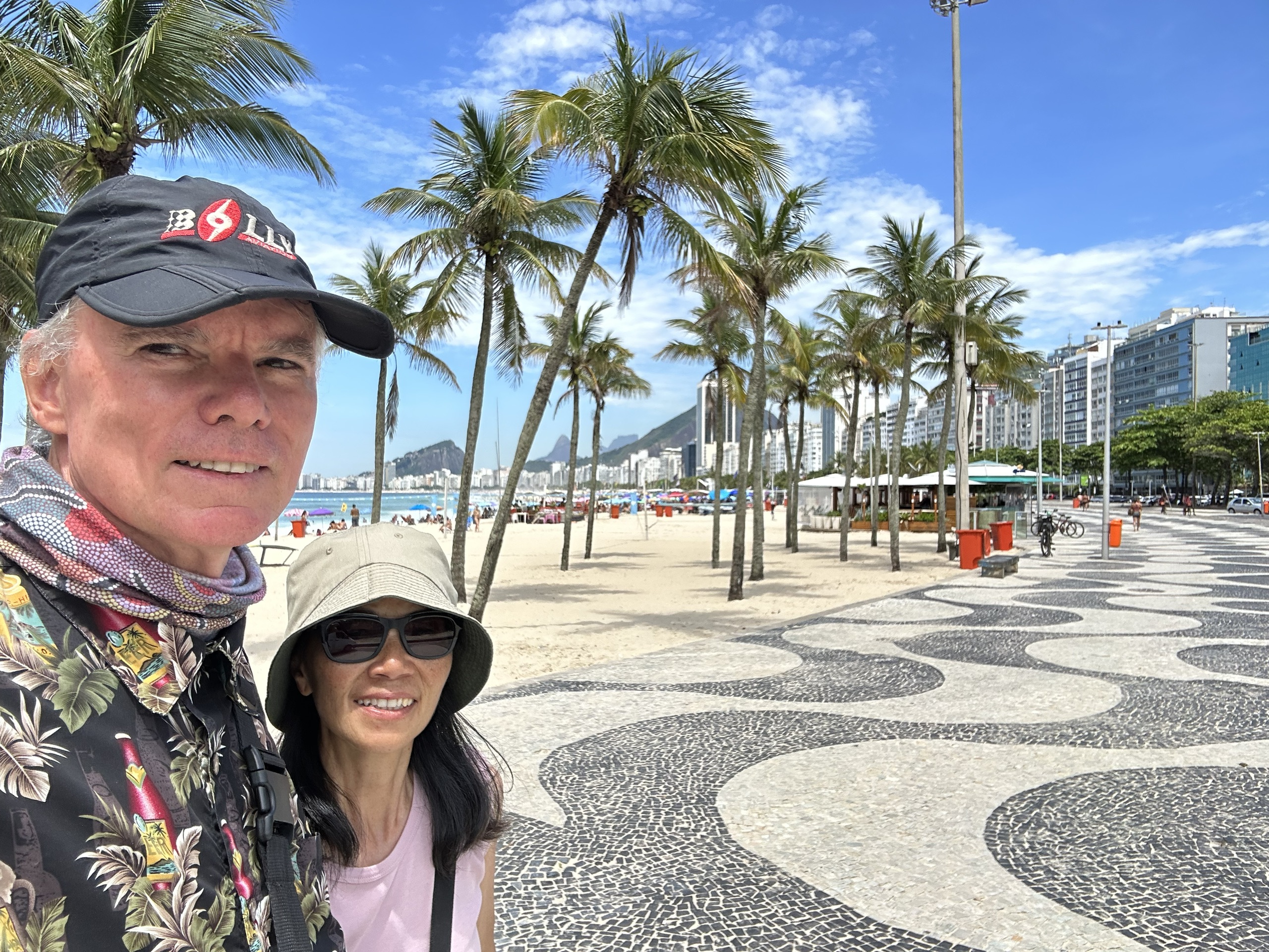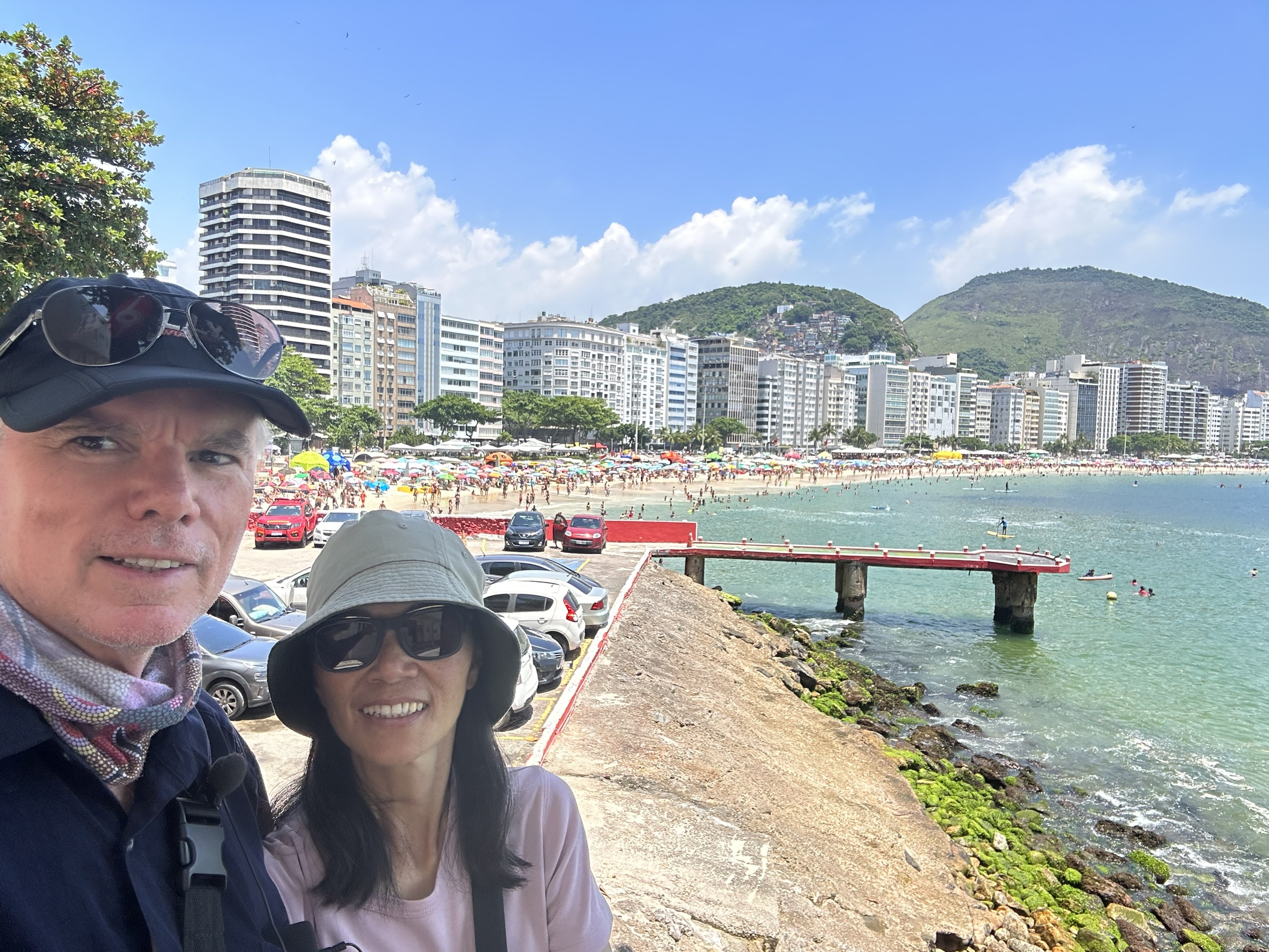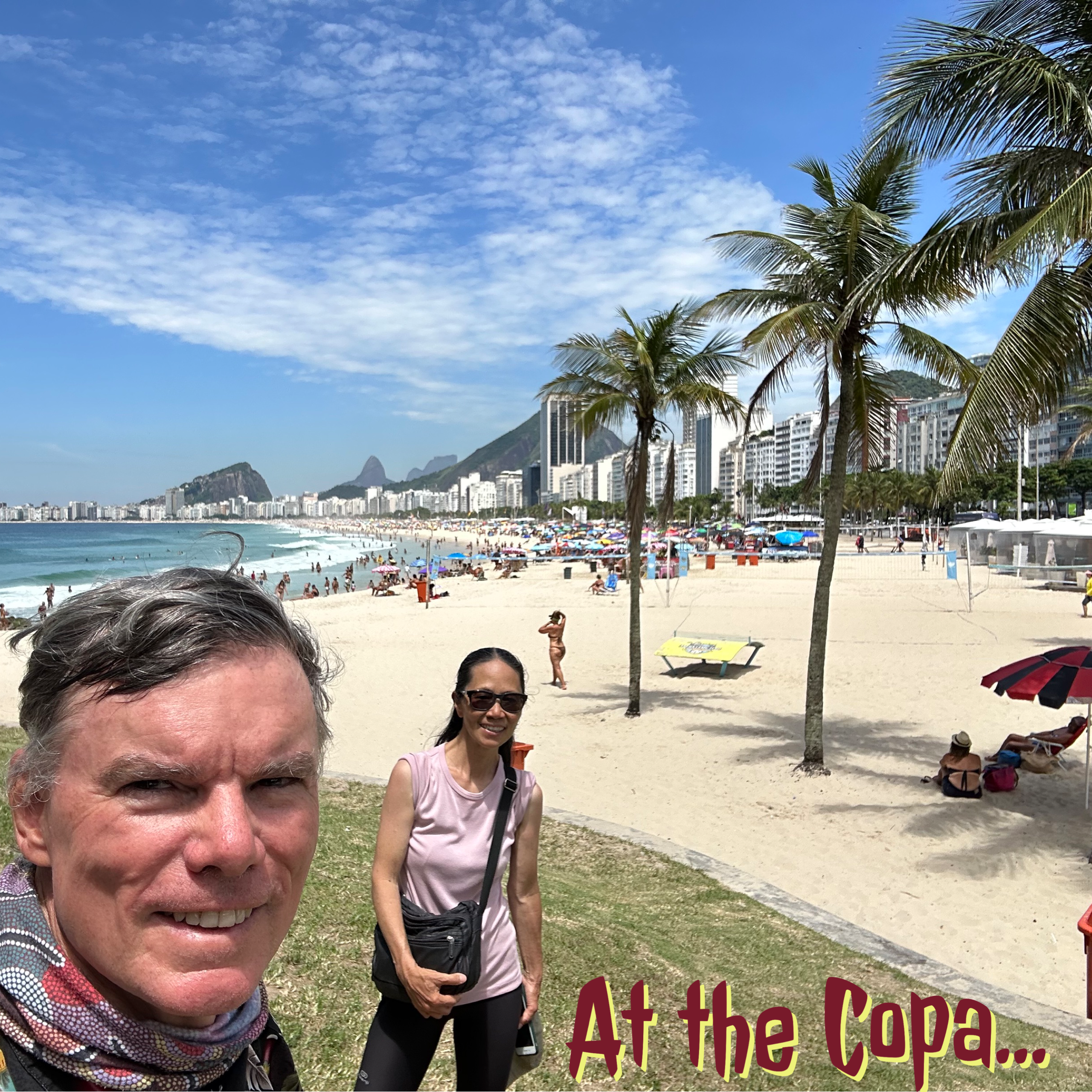 Copacabana beach on the left and the Christ the Redeemer statue above Helen’s head.