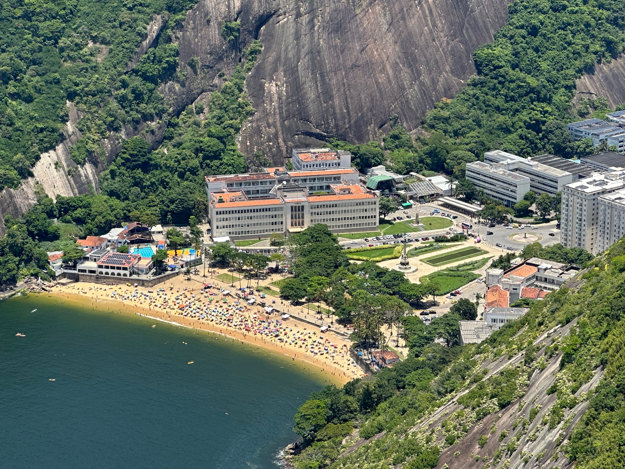 Copacabana beach - the long one and the smaller beach is next to the start of the cable car. Both are packed with people, chairs and umbrellas.