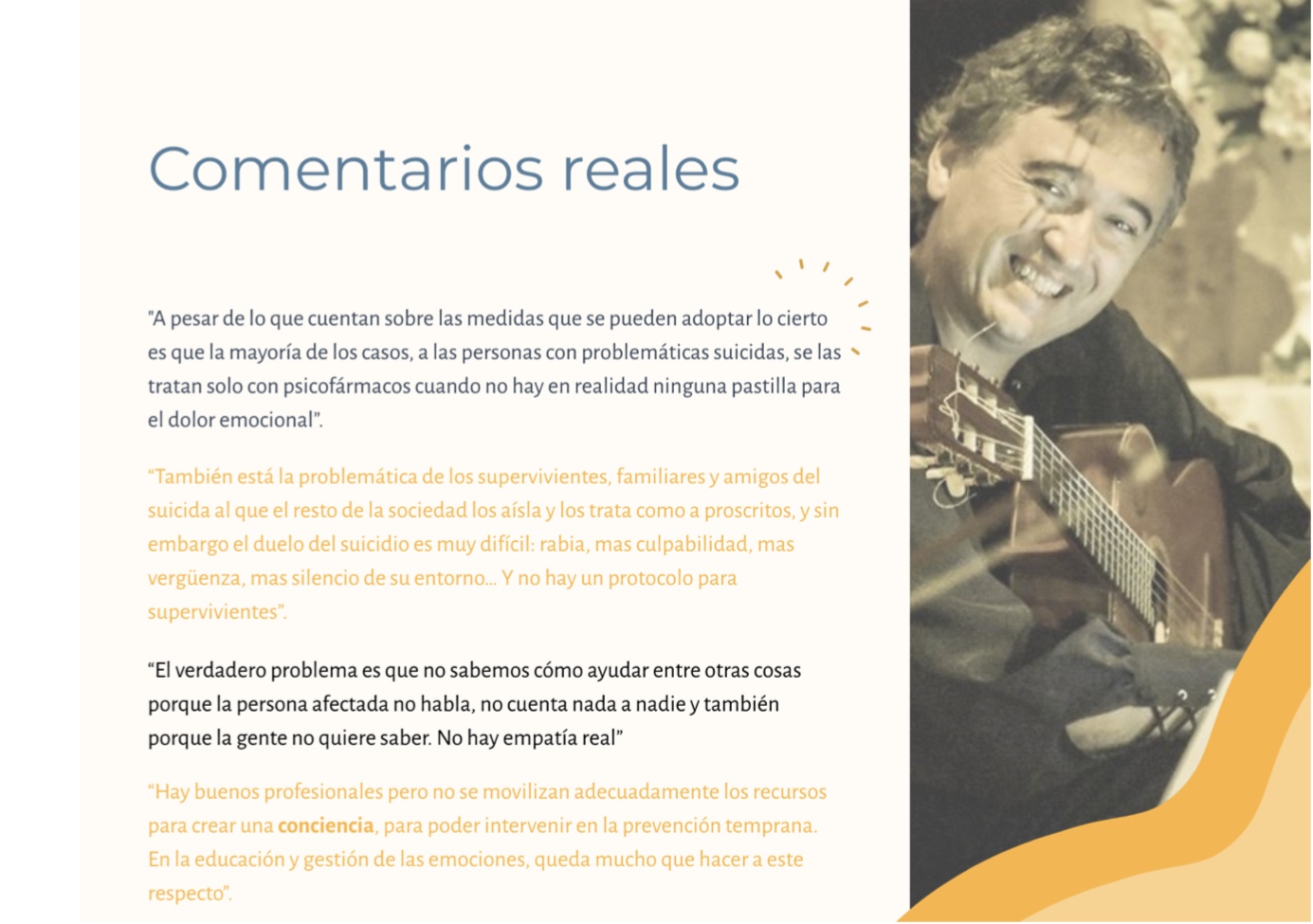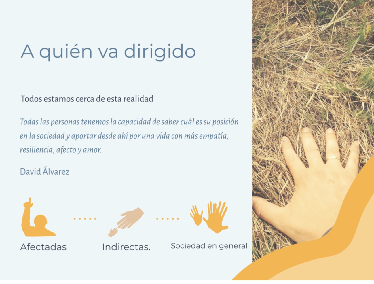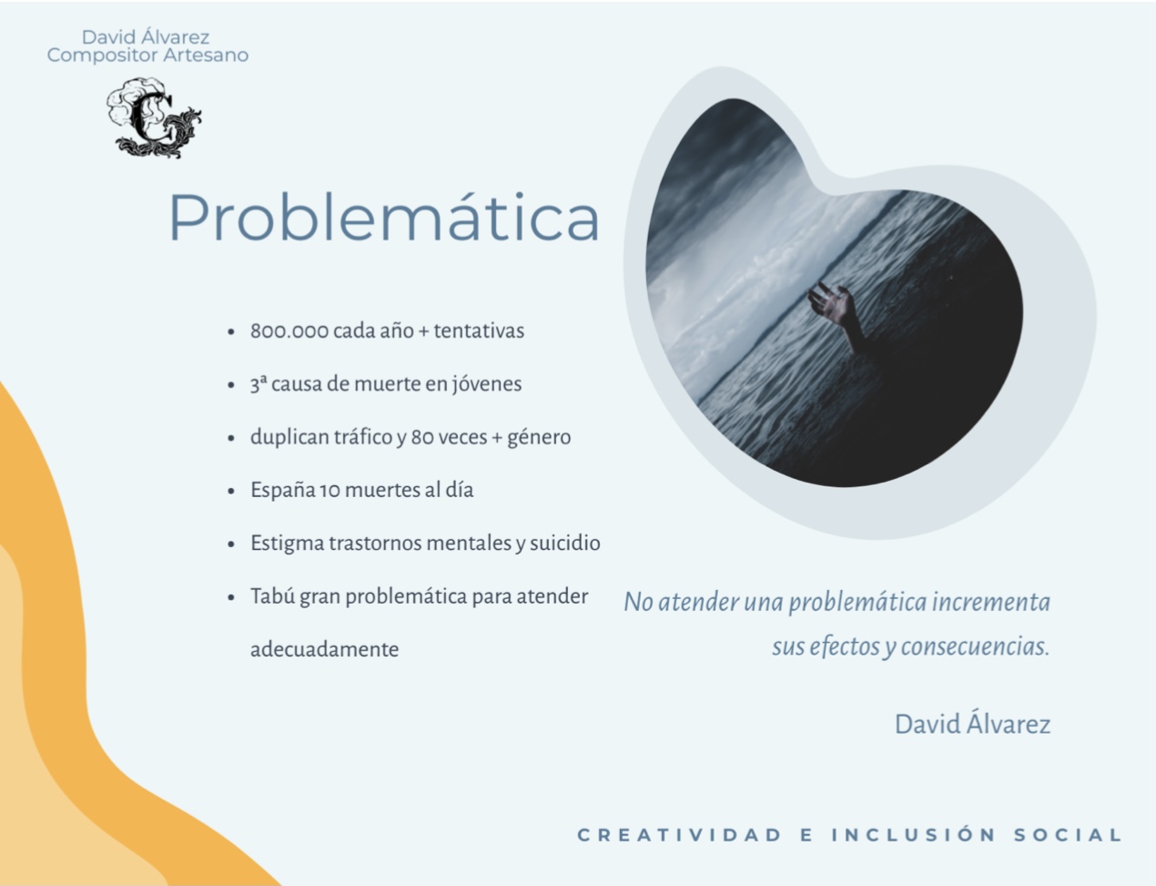 Este proyecto pone la mirada sobre un tema tan difícil, que muchas veces es soslayado por nuestra sociedad. Creo que es de suma importancia entender el suicidio como un problema de salud pública, y para ello, concienciar su existencia y hacerlo visible con sensibilidad, creatividad, empatía y respeto, tal como humildemente propone David Álvarez.