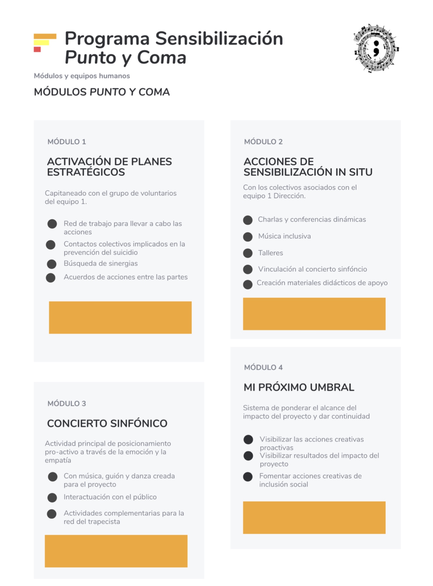 Punto y Coma es un proyecto tejido en red y tejedor de redes de apoyo y sensibilización, es un proyecto necesario para que puedan romperse barreras de soledad, vergüenza y culpa; y que a su vez es motor de cambio de una sociedad que está dando la espalda a los que más sufren. (…)