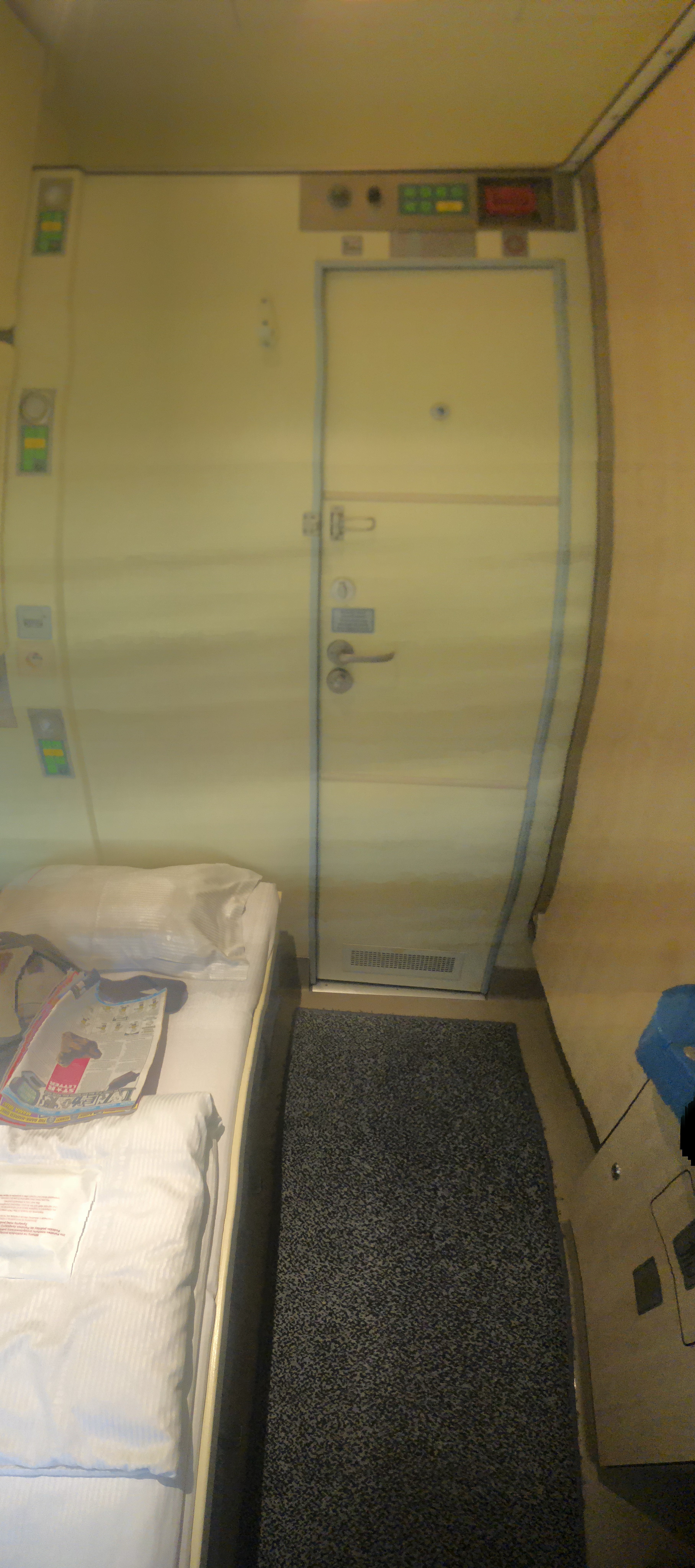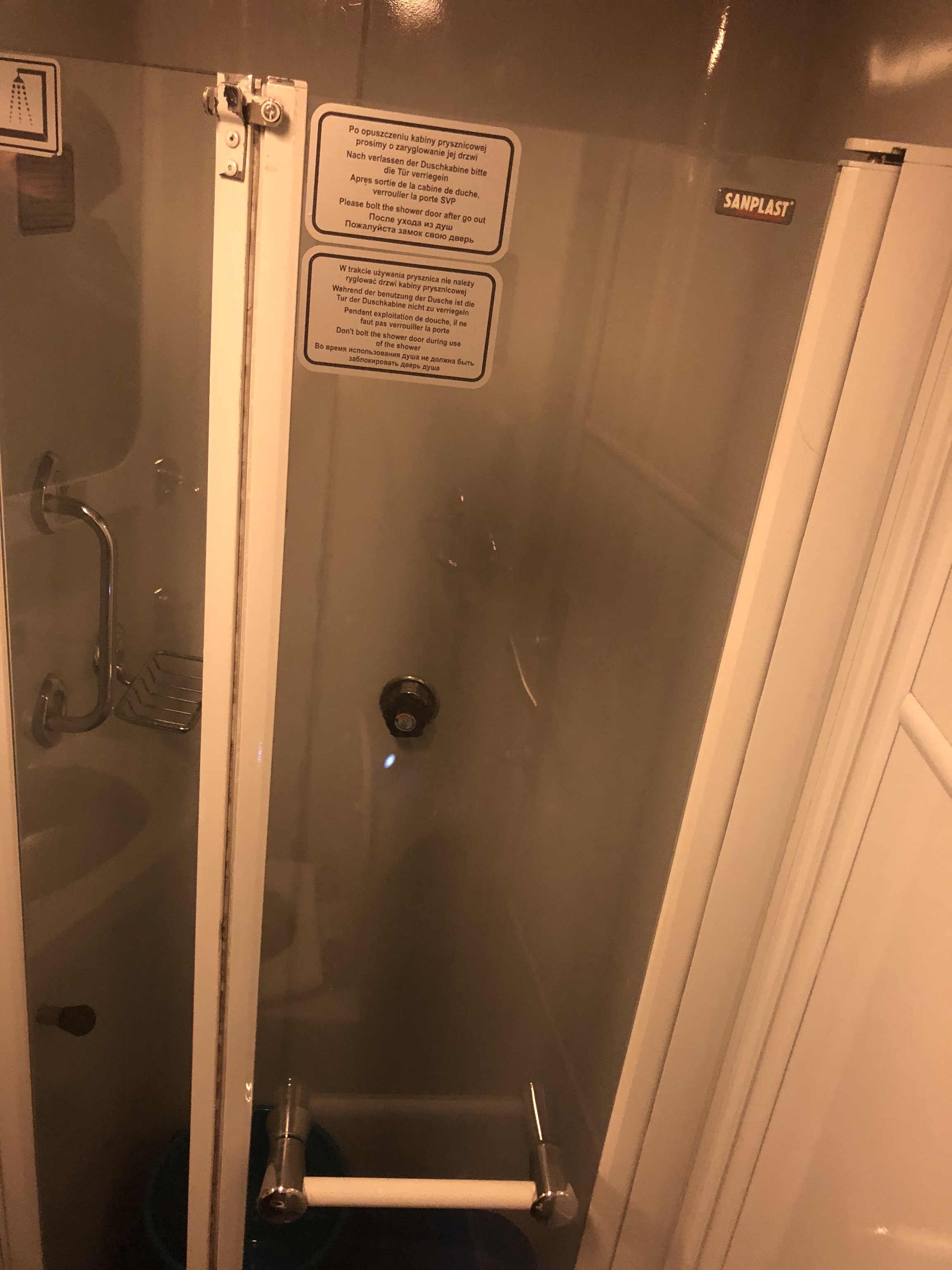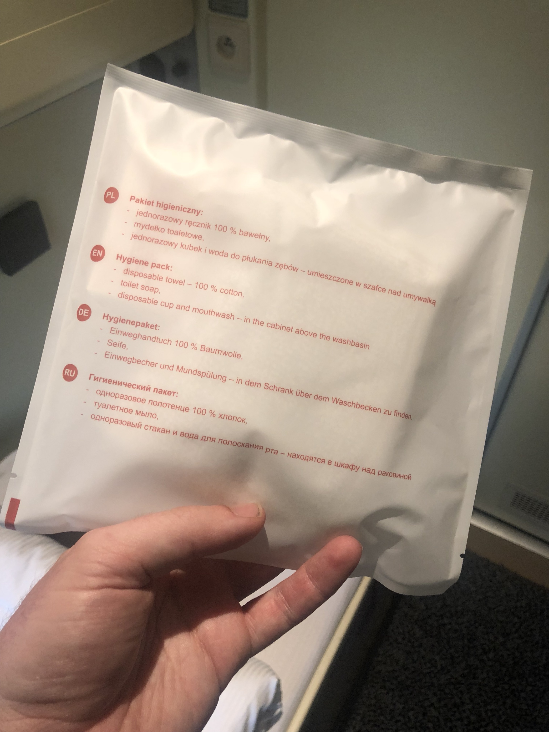 Hello, first class sleeper train to Prague. What's going on here then? Oh, we seem to have virtually all the cabins in an entire carriage and all but one are single beds with sinks that double as desks; the lone double has en-suite facilities. At the end of the carriage is a loo with a shower. We have amenity kits - amenity kits! - and free soft drinks. This is fucking ace!