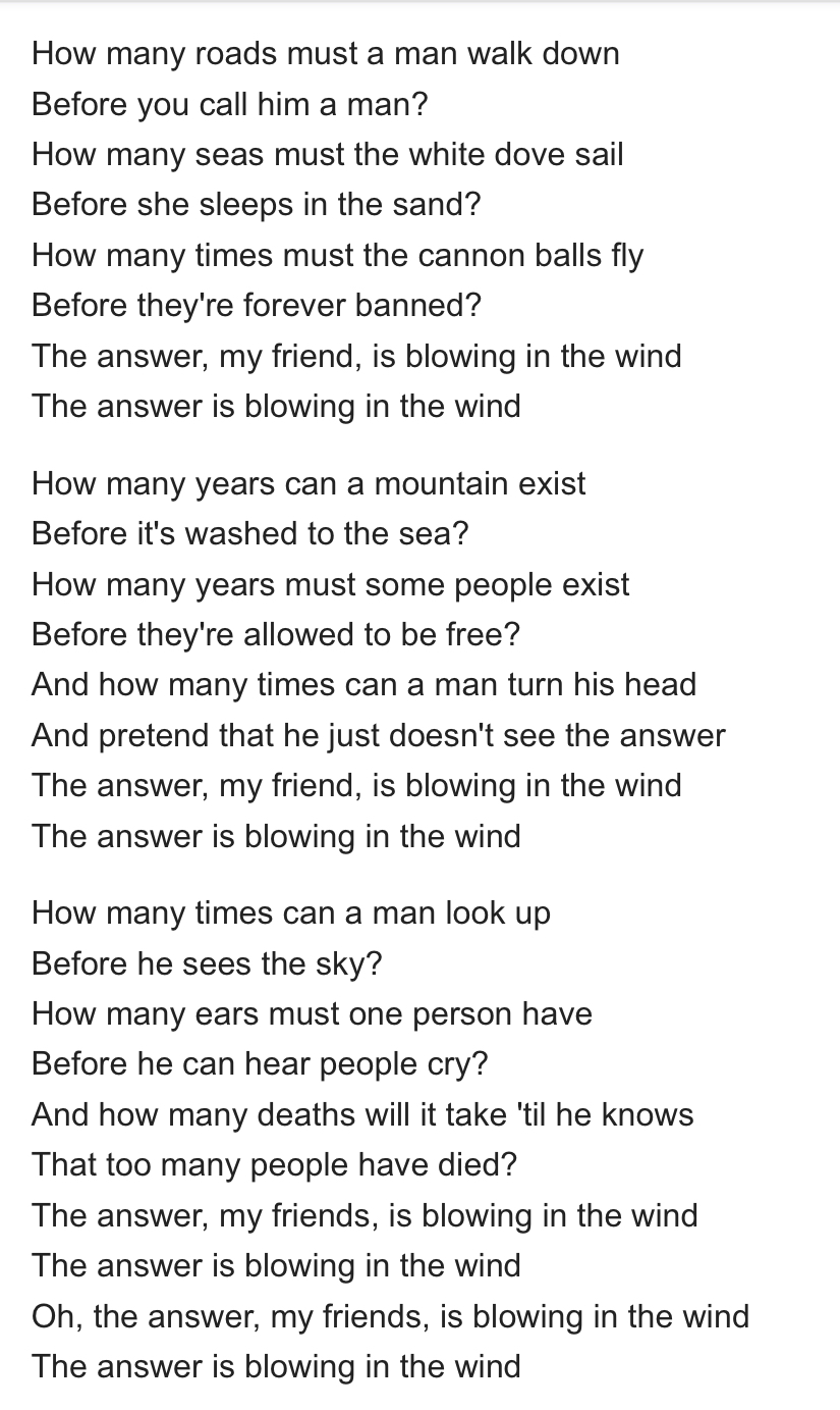 Questa canzone, rappresenta secondo me, come una donna possa lottare per i diritti civili. Se penso ad alcune donne che ho messo in questa presentazione, al loro esempio e alle loro scelte, mi sembra che cantino insieme a Joan Baez. Quando canta la sua disapprovazione per la guerra, canta anche il desiderio di libertà di tutte le donne del passato e l’uguaglianza dei diritti per tutti.