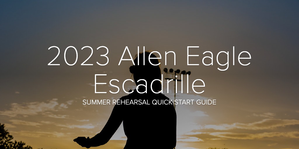 Band students should arrive by 6:30am and enter the Allen HS PAC entrance with their four required forms, instruments, music (in flip folders with lyres), dressed appropriately with water, and other required items. Unfortunately, Music & Arts will not be in the PAC; please order accessories or rent a marching instrument from Music & Arts (not required - this is if you do not want to bring your professional instrument to the field). Prior to entering the band hall, you will turn in your forms at a check-in table. We will start at 7:00am in the band hall. Lunch is scheduled 11am-12:15pm. Students can bring lunch and eat on campus, parents can deliver lunch, or can leave campus. Rehearsals resume at 12:15pm. We will dismiss from the Band Hall at 3:30pm. See links below for everything you need to know about Summer Band 2023.