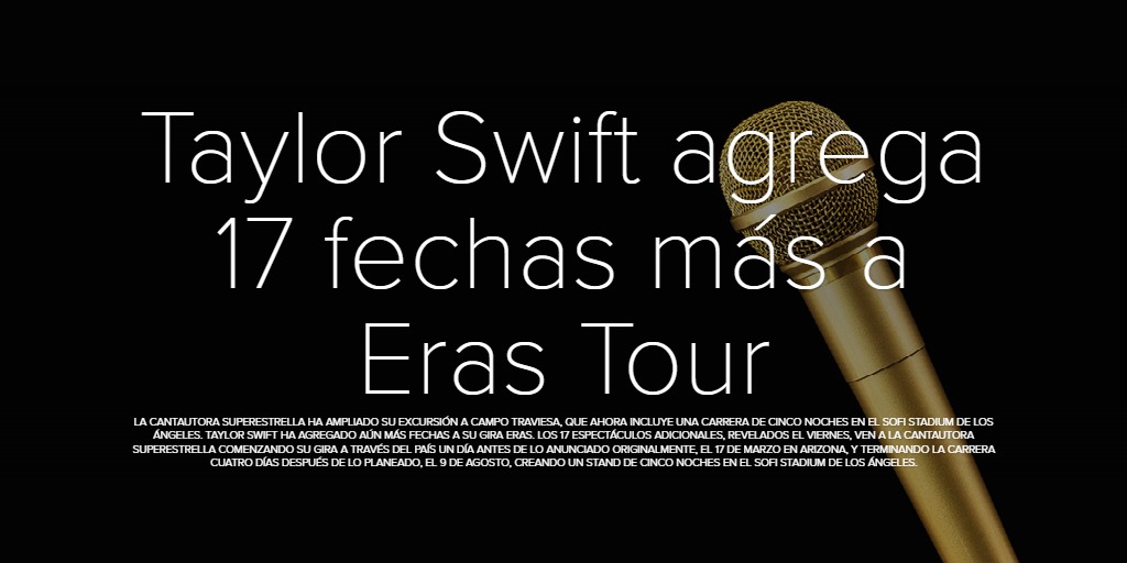Taylor Swift agrega 17 fechas más a Eras Tour La cantautora superestrella ha ampliado su excursión a campo traviesa, que ahora incluye una carrera de cinco noches en el SoFi Stadium de Los Ángeles. Taylor Swift ha agregado aún más fechas a su gira Eras. Los 17 espectáculos adicionales, revelados el viernes, ven a la cantautora superestrella comenzando su gira a través del país un día antes de lo anunciado originalmente, el 17 de marzo en Arizona, y terminando la carrera cuatro días después de lo planeado, el 9 de agosto, creando un Stand de cinco noches en el SoFi Stadium de Los Ángeles.