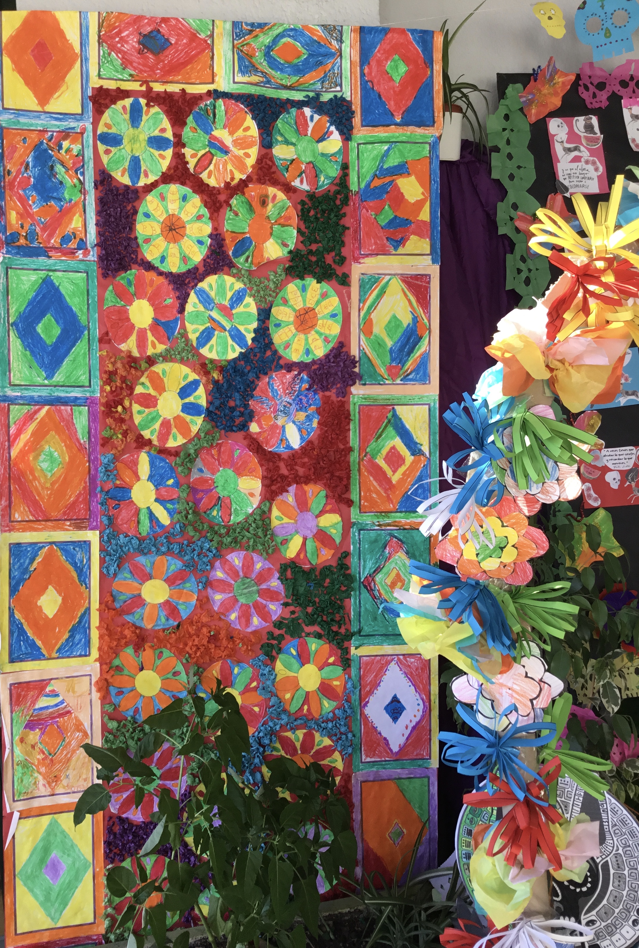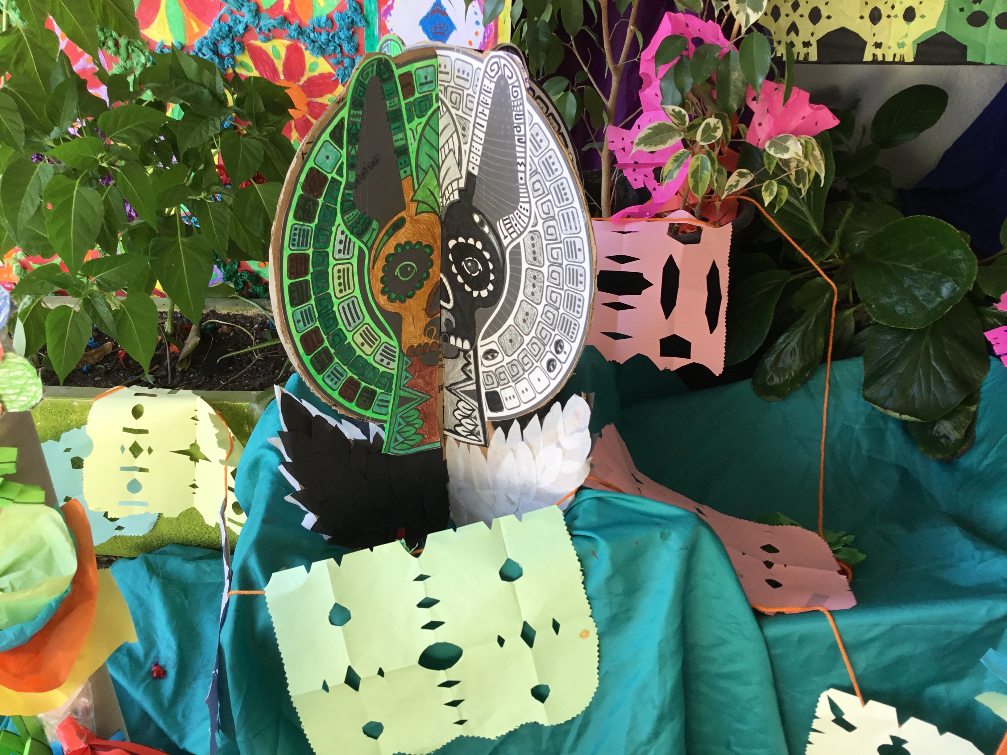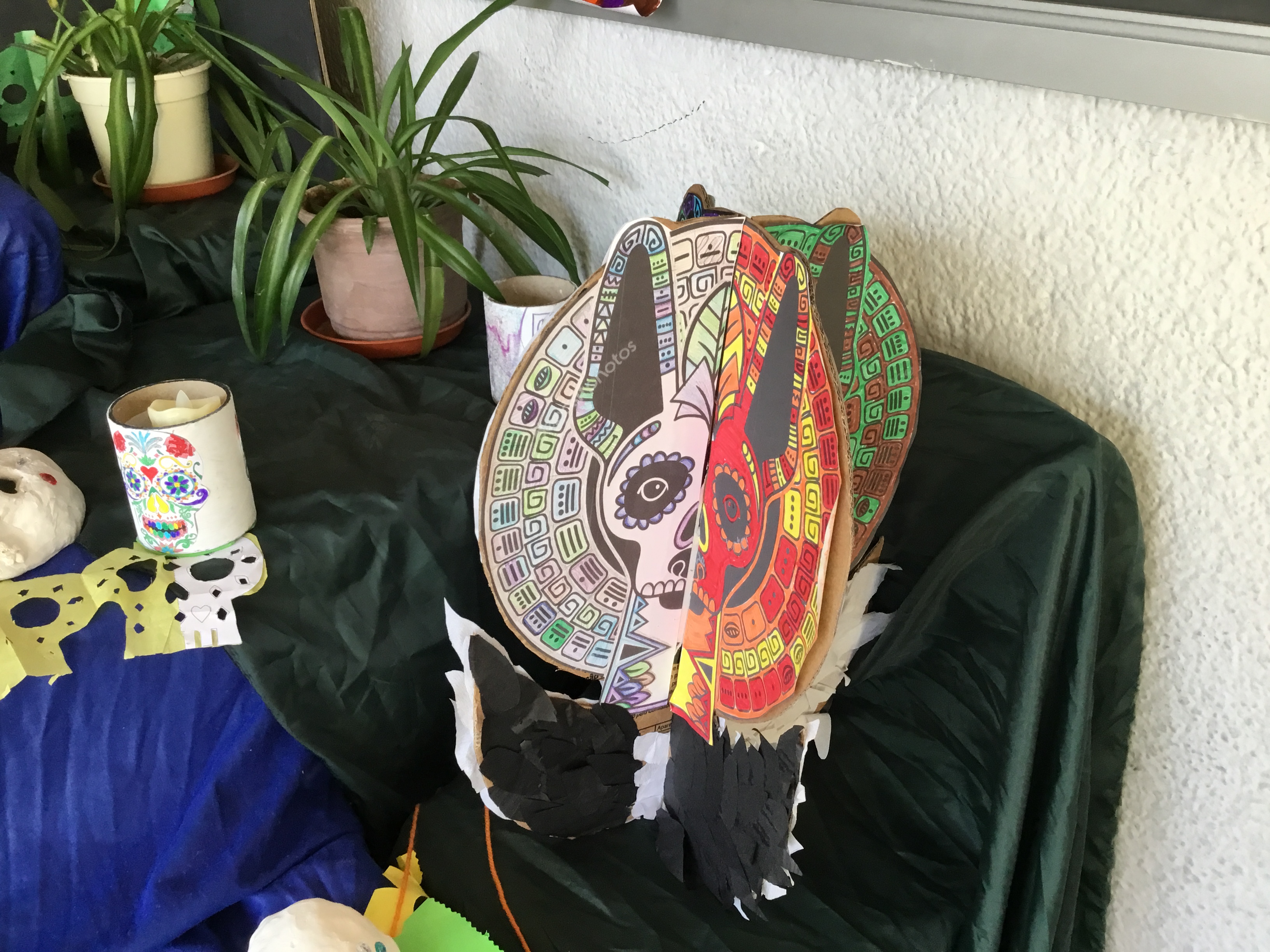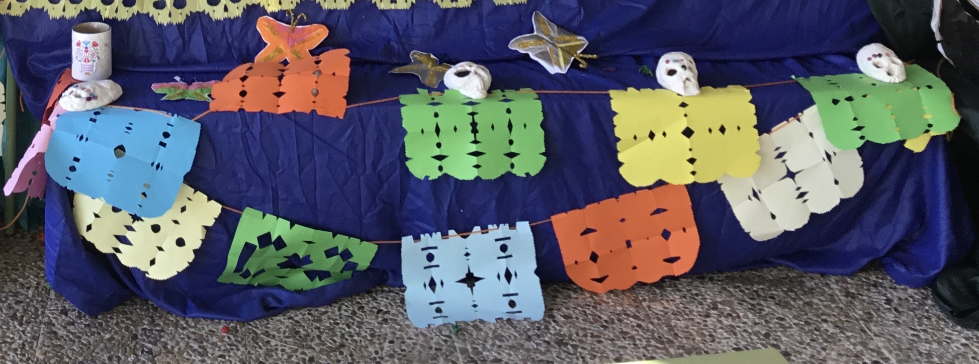 Tapete de Huamantla, Cempasúchil : Arco de flores, Guirnalda de papel picado, Tzompantli: hilera de cráneos, Velas y veladores, Mariposas, Izcuintle (perrito), cráneos...han llenado nuestro porche de entrada