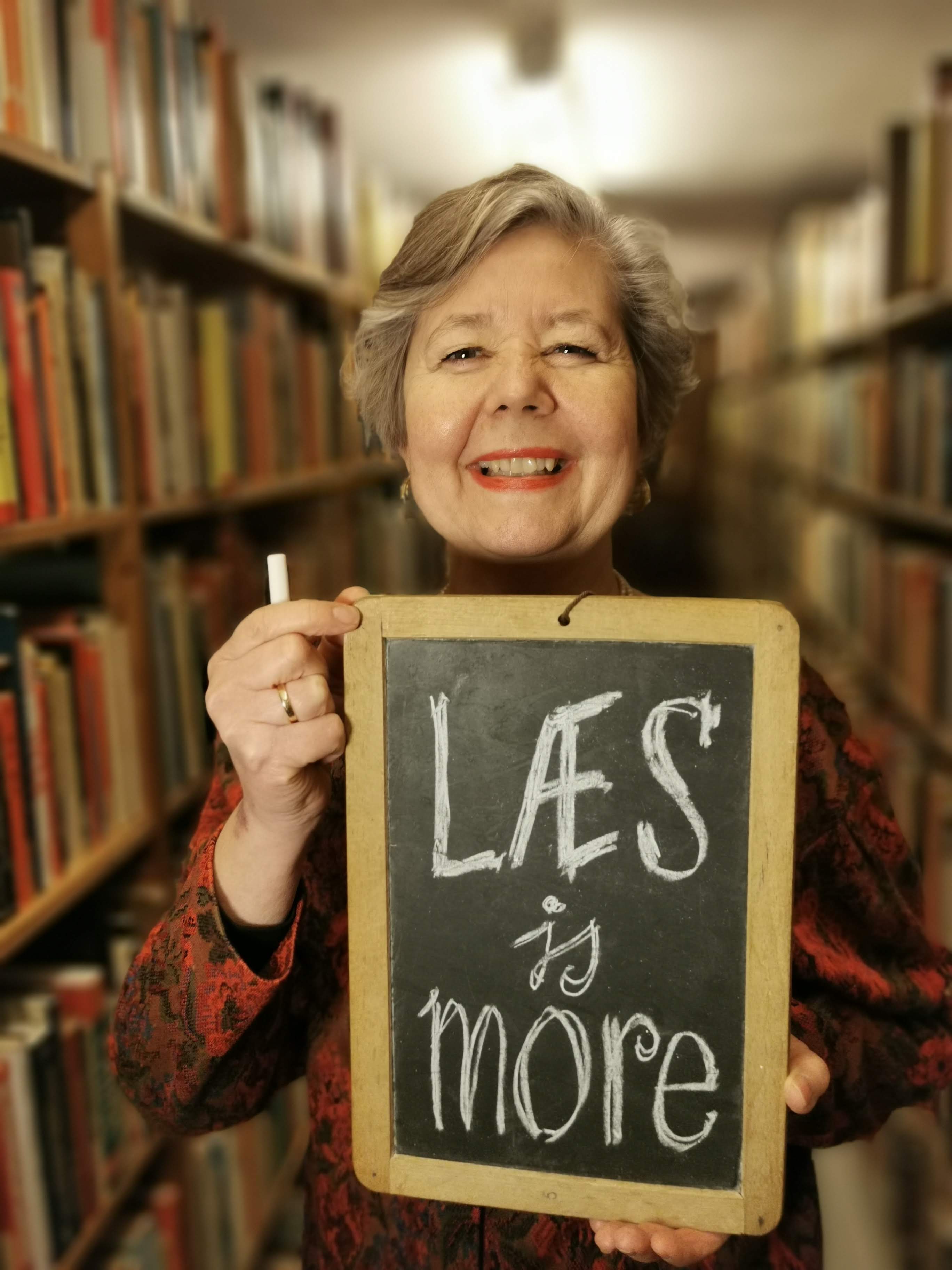Vi fik vendt forskellige muligheder og fandt frem til hvordan vi kunne peppe hende og dét image op. Resultatet blev nye profilbilleder, der bedre fortæller hendes historie. Billederne fik vi taget i Paludan Antikvariats dybe kælder, der bare siger BØGER!