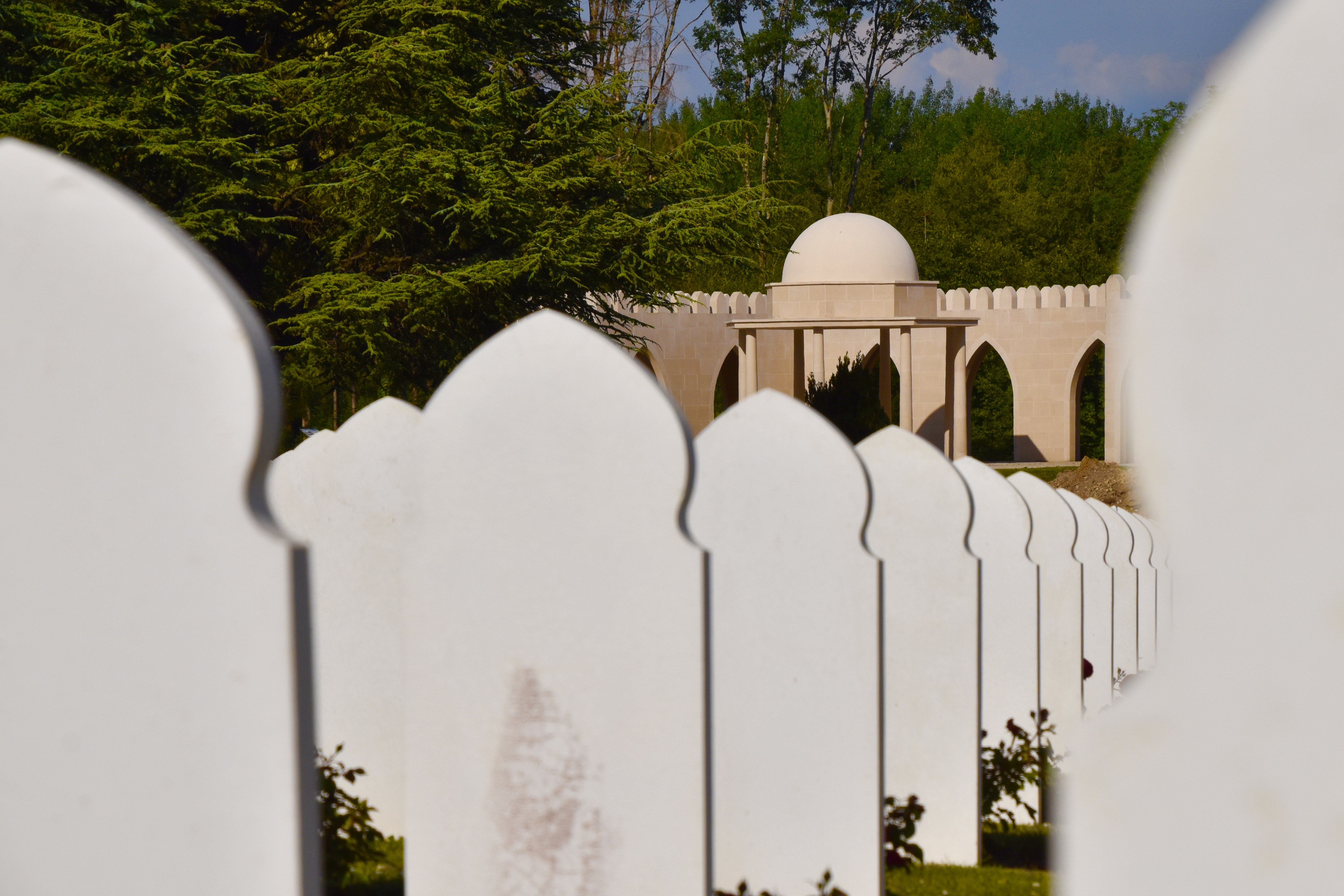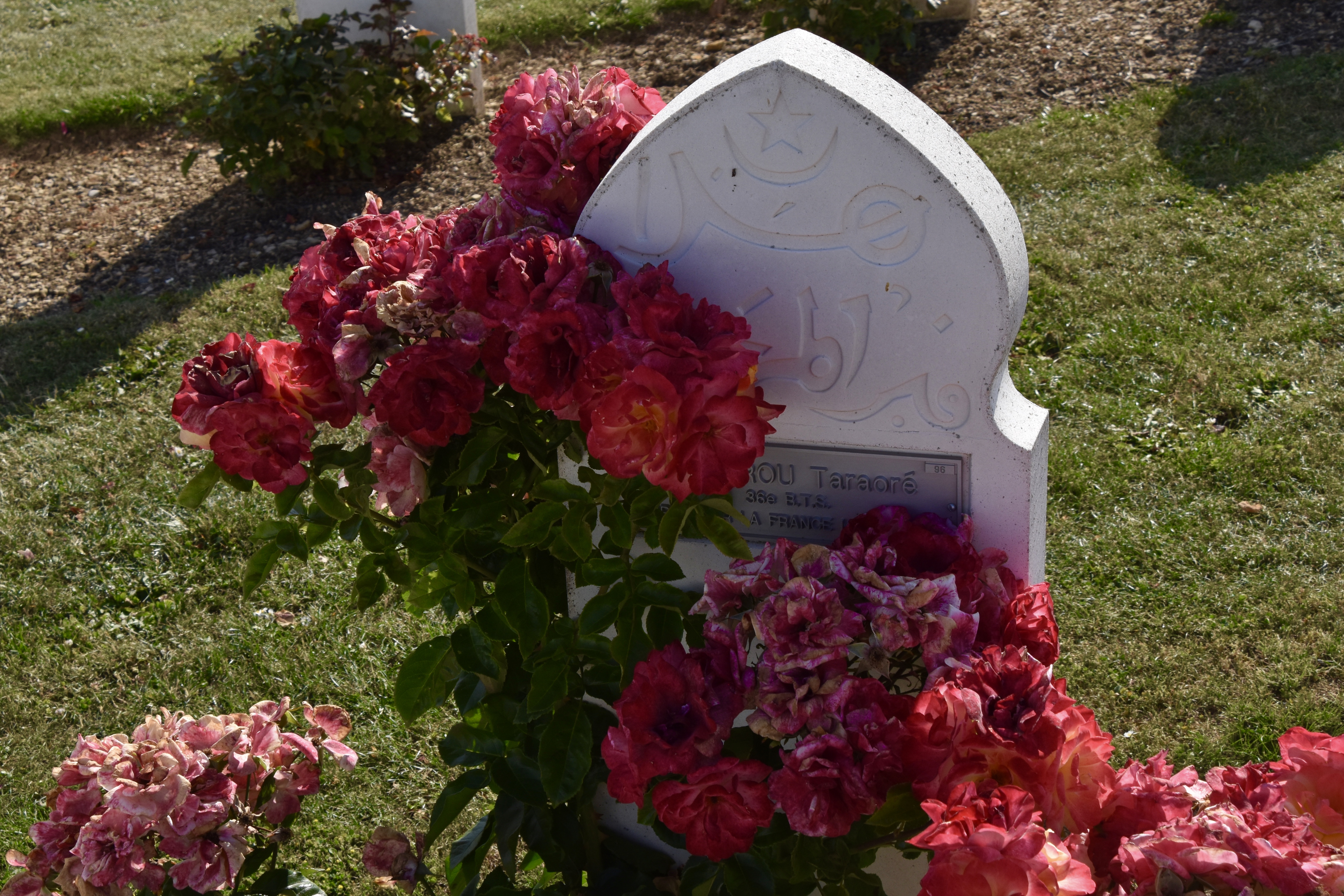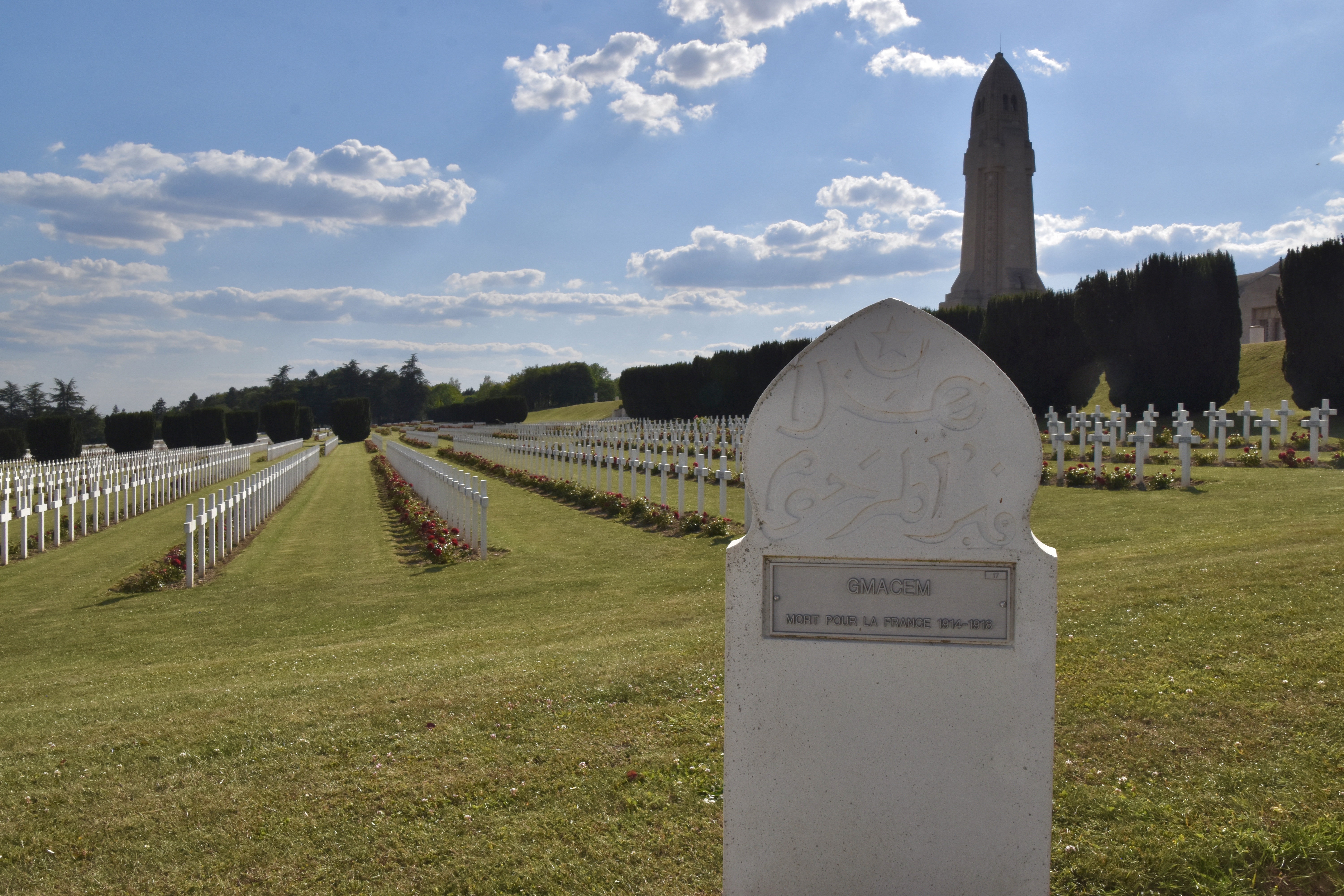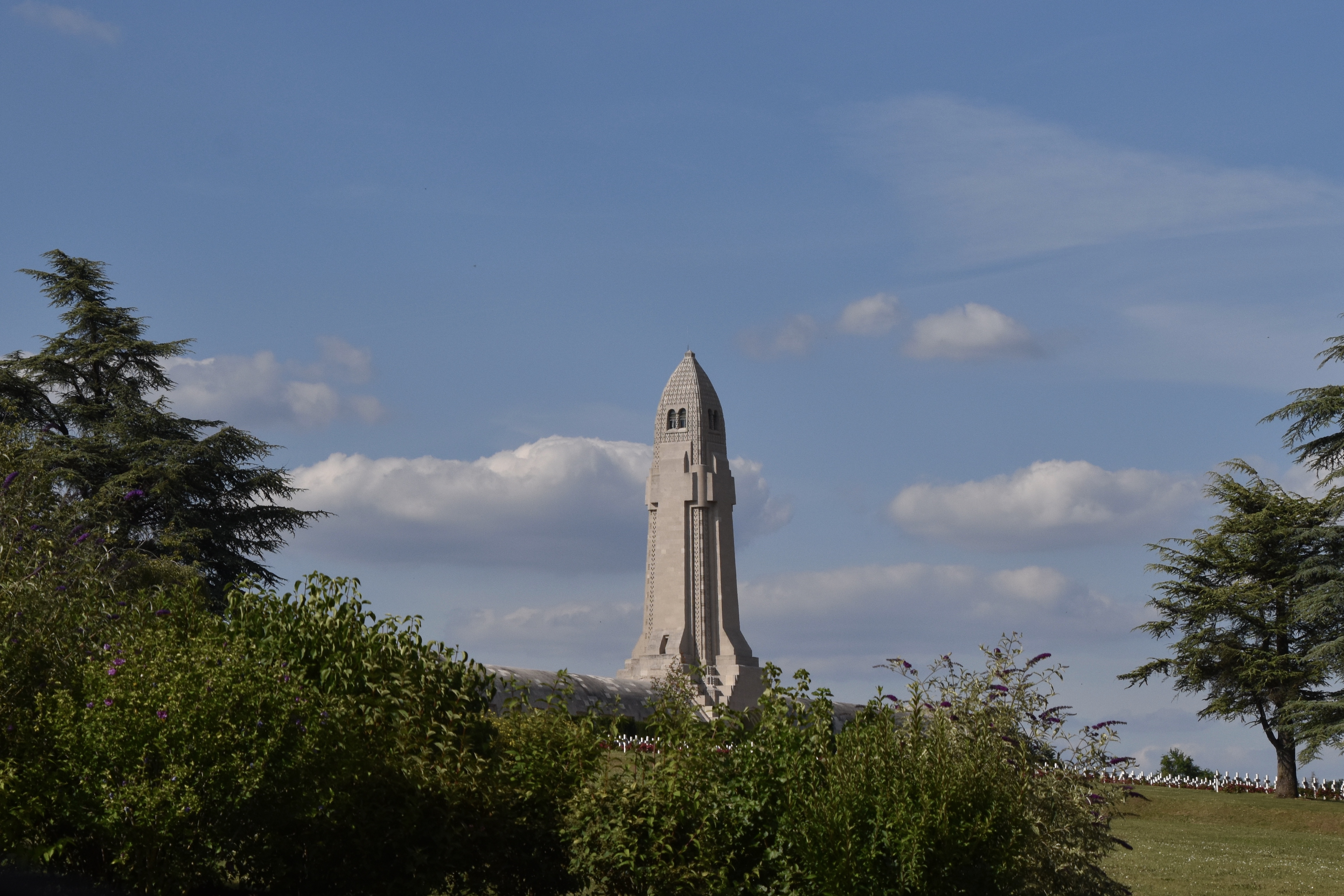 L’Ossuaire de Douaumont face à l’immense cimetière fleuri du rosier de Verdun, créé en 1918, tombé dans l’oubli puis dont la culture a été relancée en 2012 par un lycée horticole.