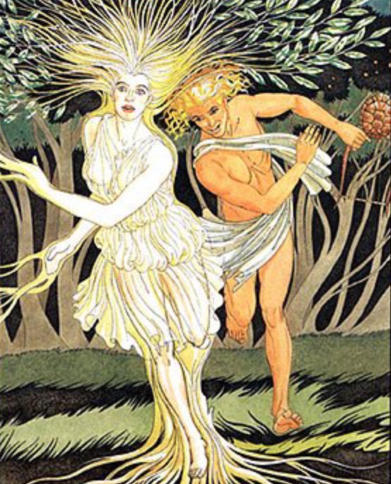 The Laurel Tree became one of Apollo's sacred symbols, through his first love, Daphne, whom was the daughter of the Titaness Gaea, and Peneus, god of rivers. It was said that Eros (Cupid), had shot Apollo with an arrow that would make him fall in love with the first person he'd see, who had been Daphne. When Apollo fell for Daphne, Eros then shot a led tipped arrow at Daphne, making her dispise love. Even after Daphne rejected Apollo, he hadn't given up. Daphne ended up fleeing from Apollo after her rejection, and so he went into pursuit after her. Eventually, Apollo caught Daphne, and held her in his arms. Daphne; filled with despair, made a wish to her mother Gaea, which was to disappear off the face of the earth, or to be safe from Apollo's grasp. Gaea had granted her this wish, and transformed Daphne into the Laurel Tree. Apollo became sad after her transformation, and placed Laurel Leaves into his hair. Thus is how, the Laurel Wreath became one of Apollo's sacred symbols.