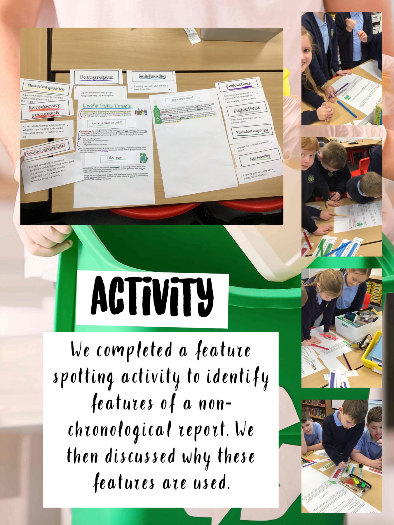 Our first unit of writing was a non-chronological report on the importance of ‘Reduce, Reuse, Recycle’. We looked at using facts instead of opinions and we focussed on including a wide range of technical language in our reports too.