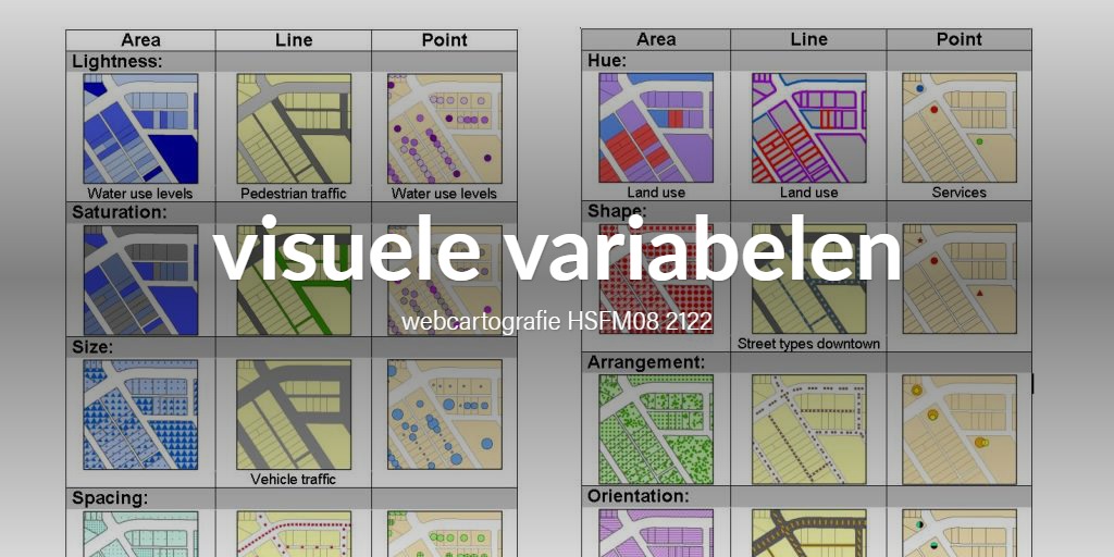 - toon hierin visueel en textueel minimaal 8 visuele variabelen (zie boek en hierboven)