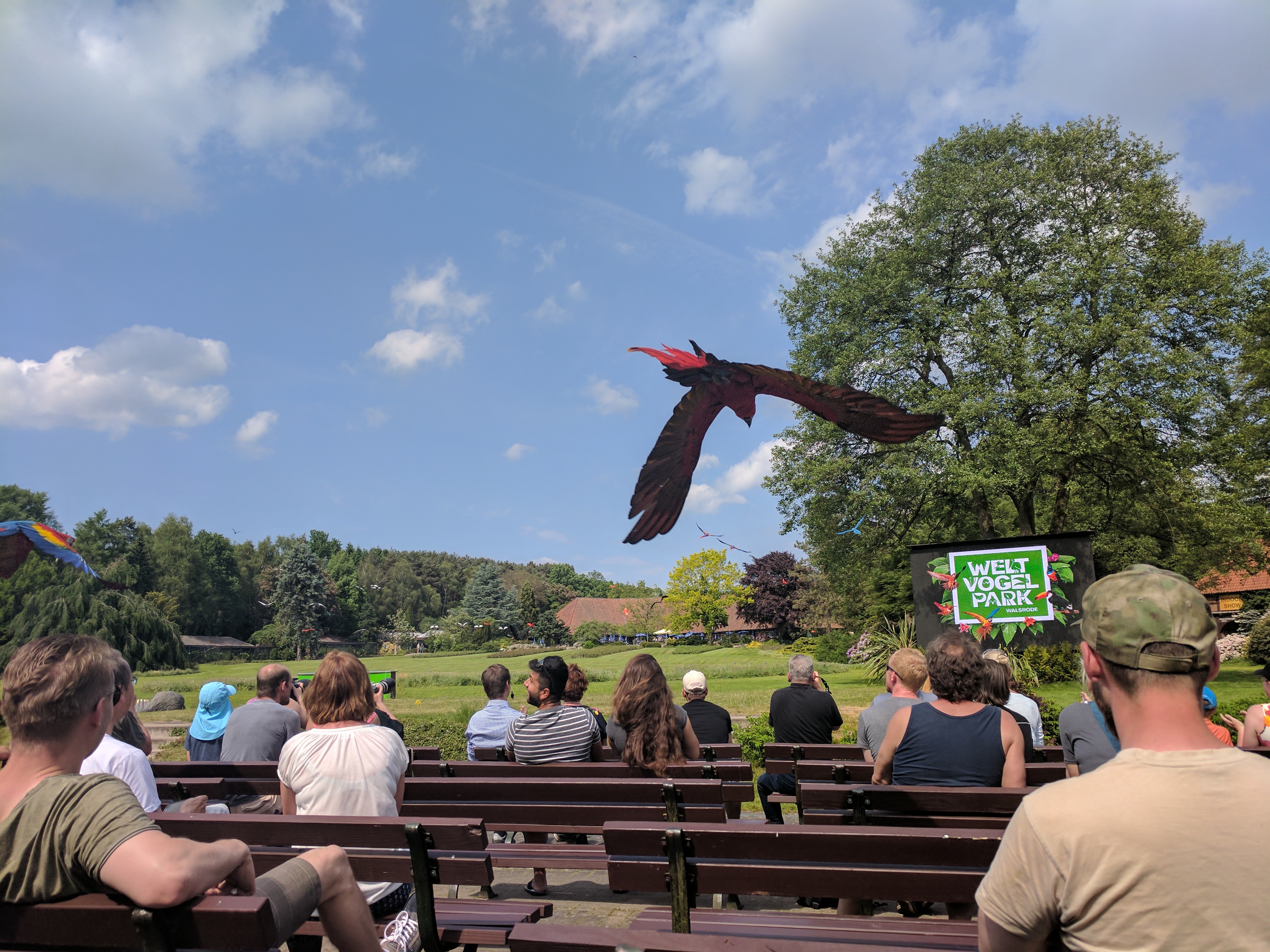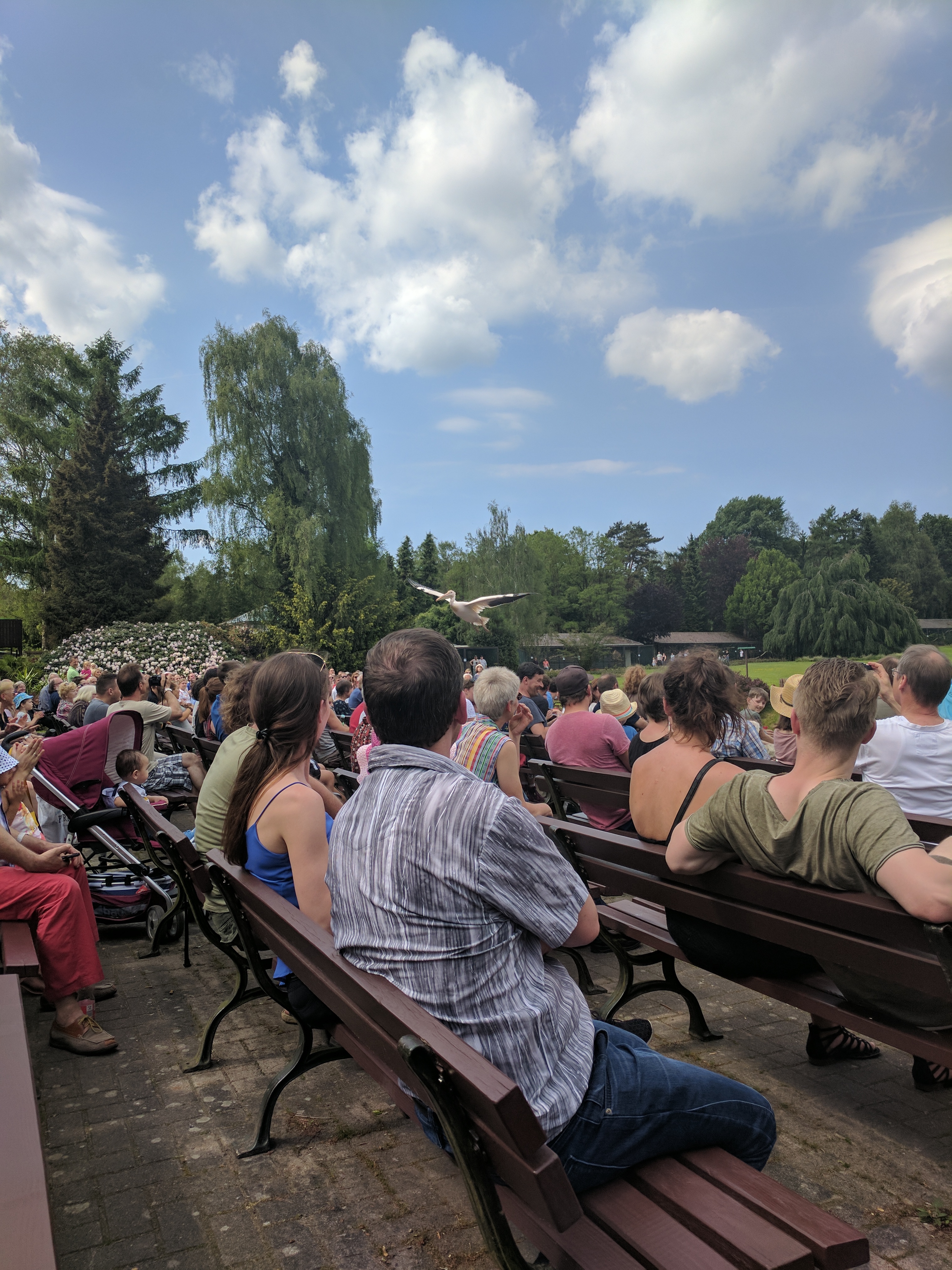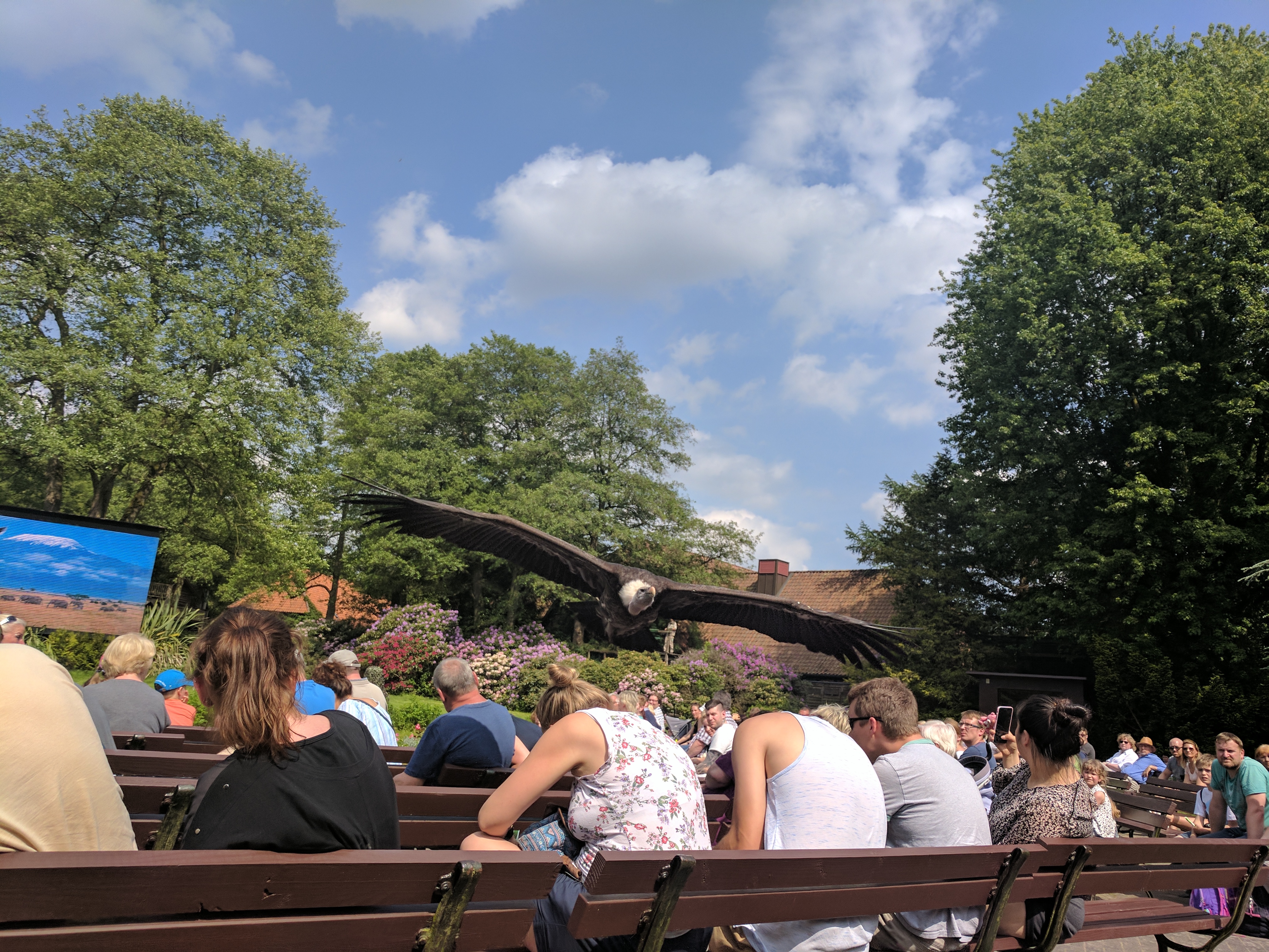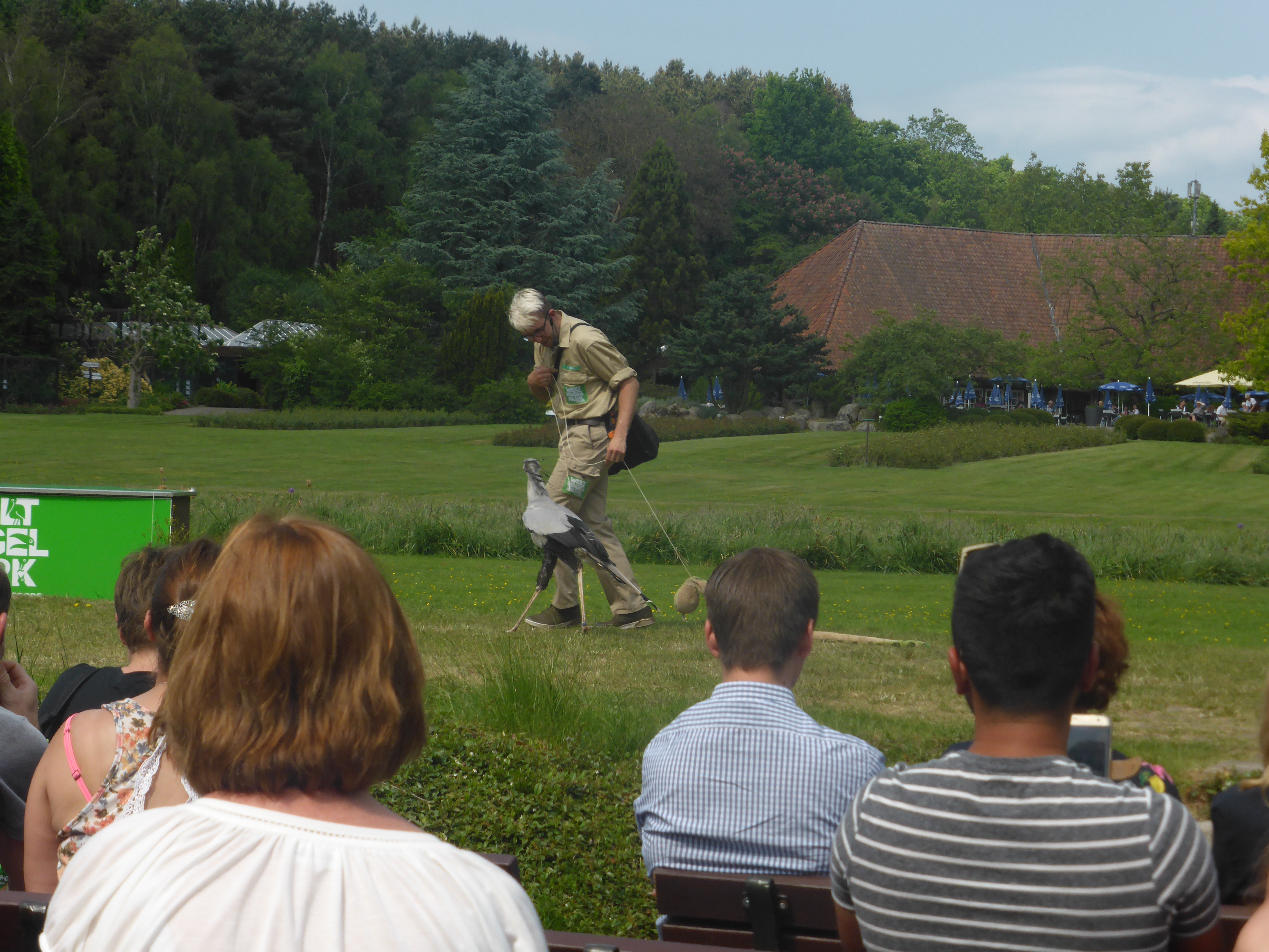 Anyway, it was almost time for the flight show by now. A quick look at some birds of paradise and then we took our seats in the outdoor arena, listening to panpipe covers of Michael Jackson's Earth Song before the show started. It was entirely in German, and started with a brief video depicting a flight in a small plane over top of Walsrode, which crashes due to a bird in the cockpit chewing through some rather important cables. This did not do much for Helen's current fear of flying.