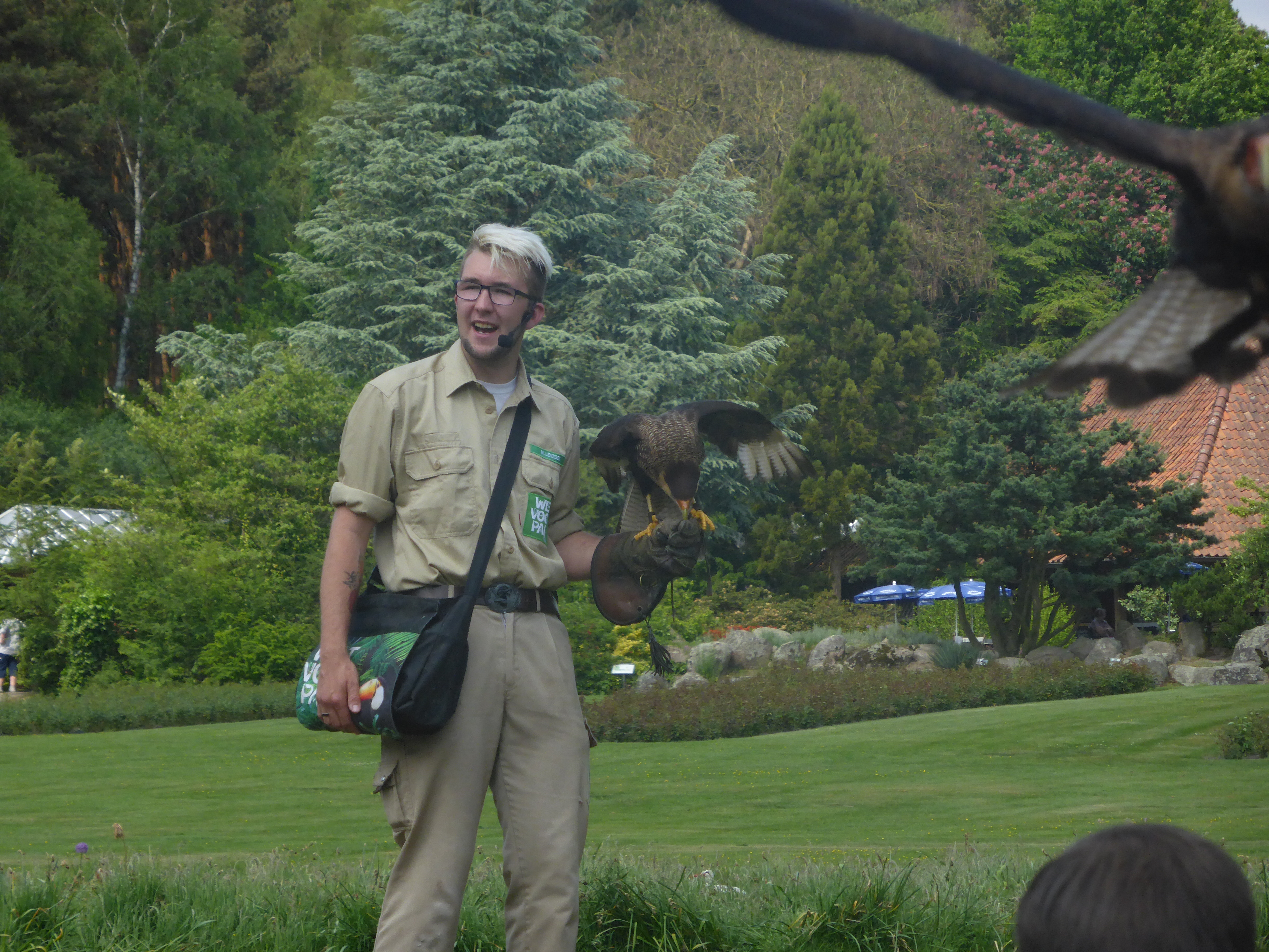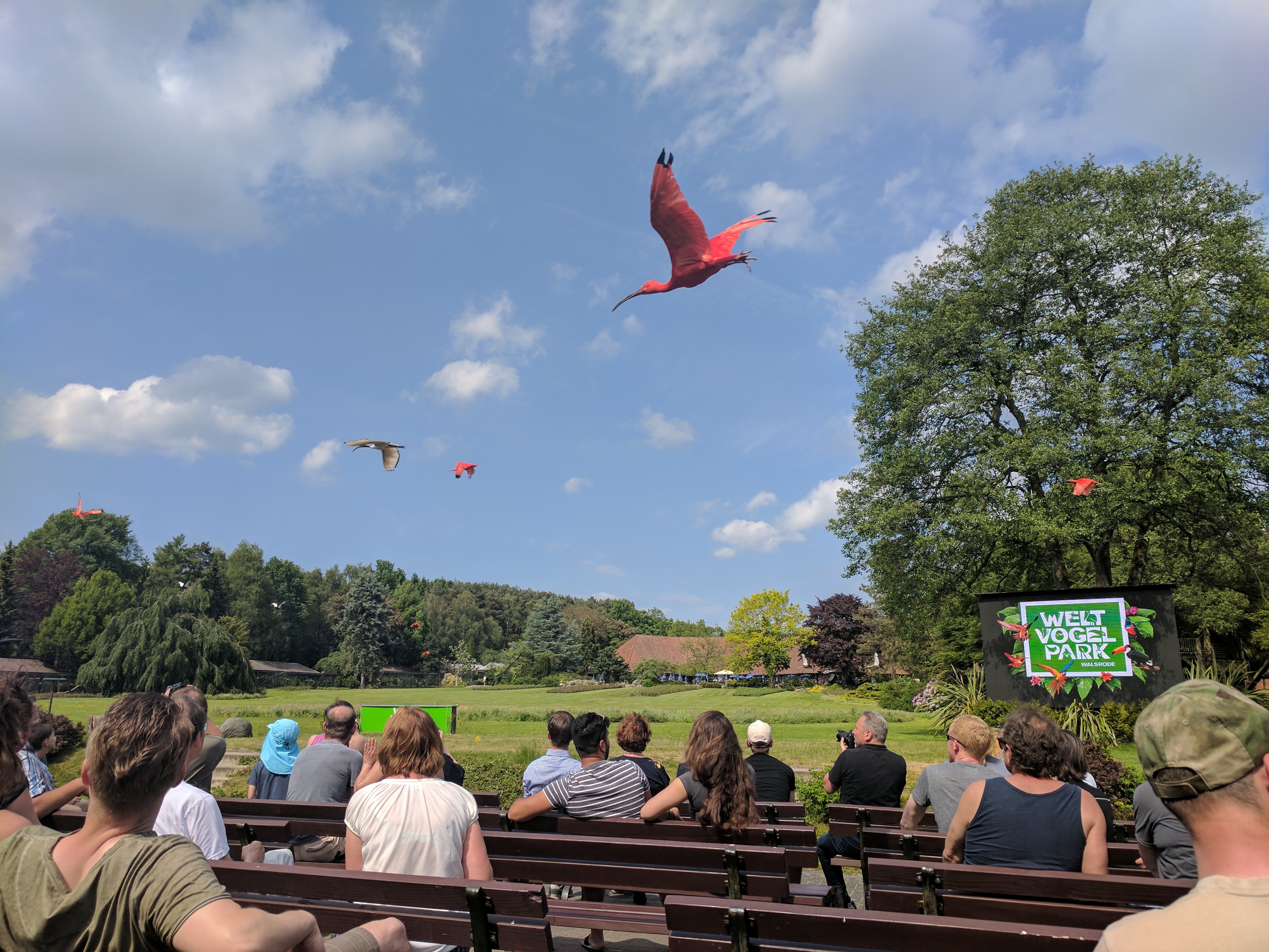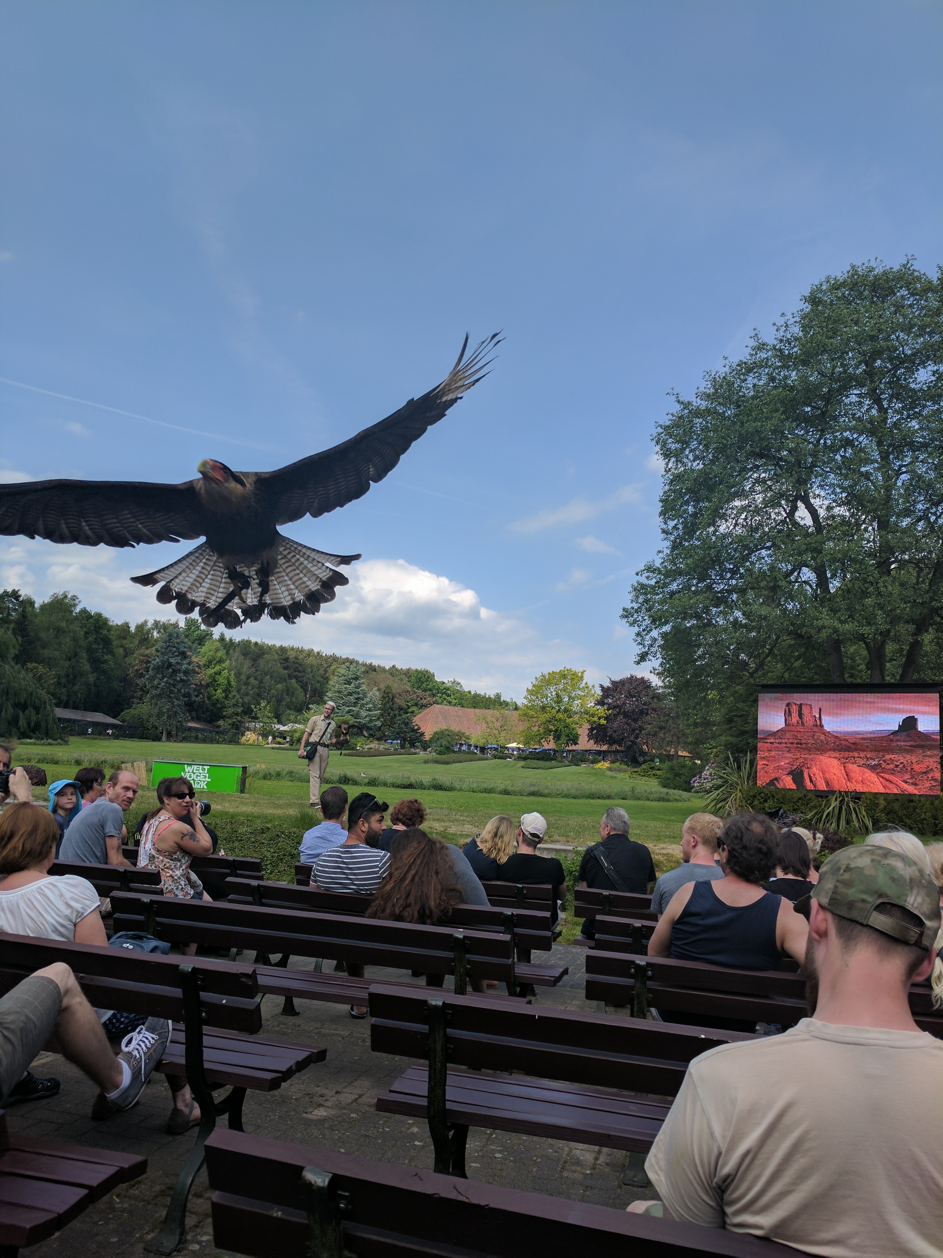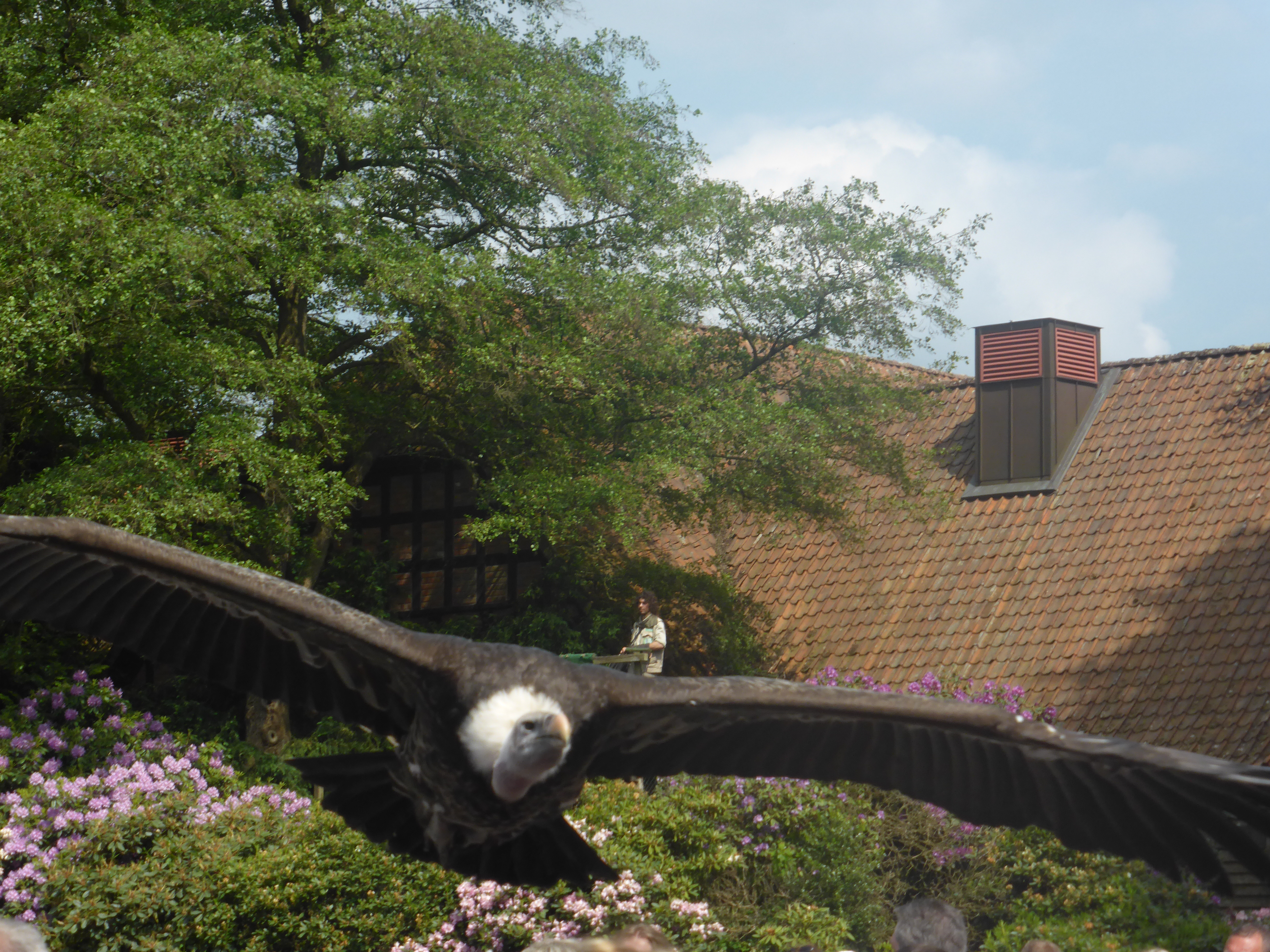 Anyway, it was almost time for the flight show by now. A quick look at some birds of paradise and then we took our seats in the outdoor arena, listening to panpipe covers of Michael Jackson's Earth Song before the show started. It was entirely in German, and started with a brief video depicting a flight in a small plane over top of Walsrode, which crashes due to a bird in the cockpit chewing through some rather important cables. This did not do much for Helen's current fear of flying.