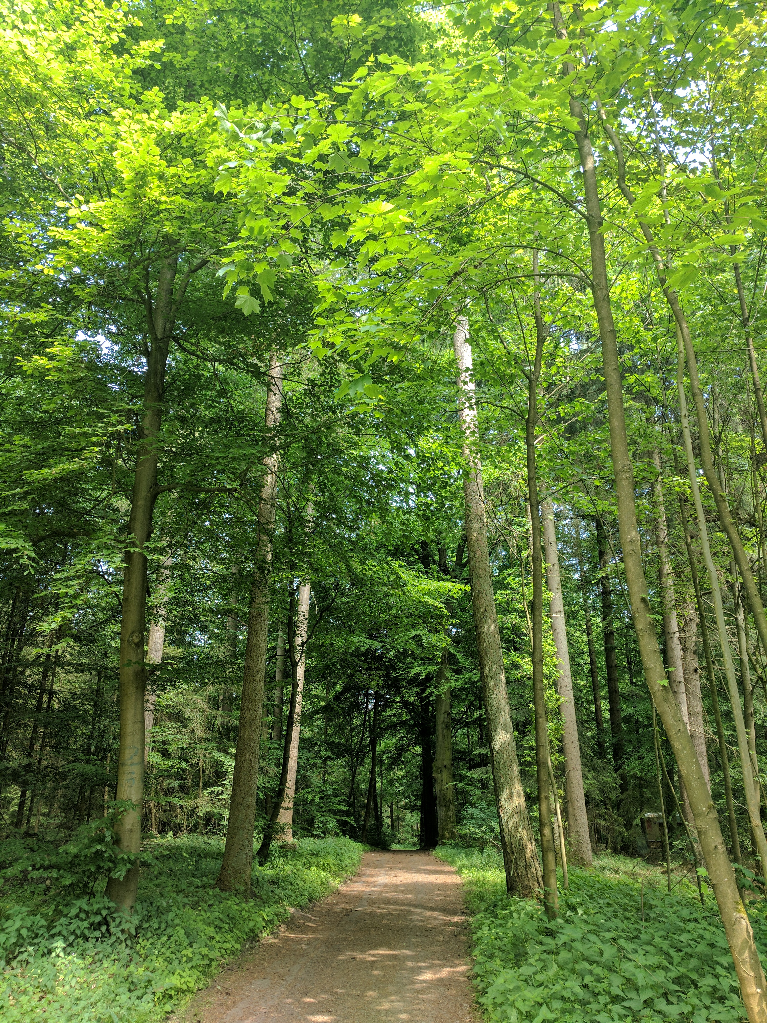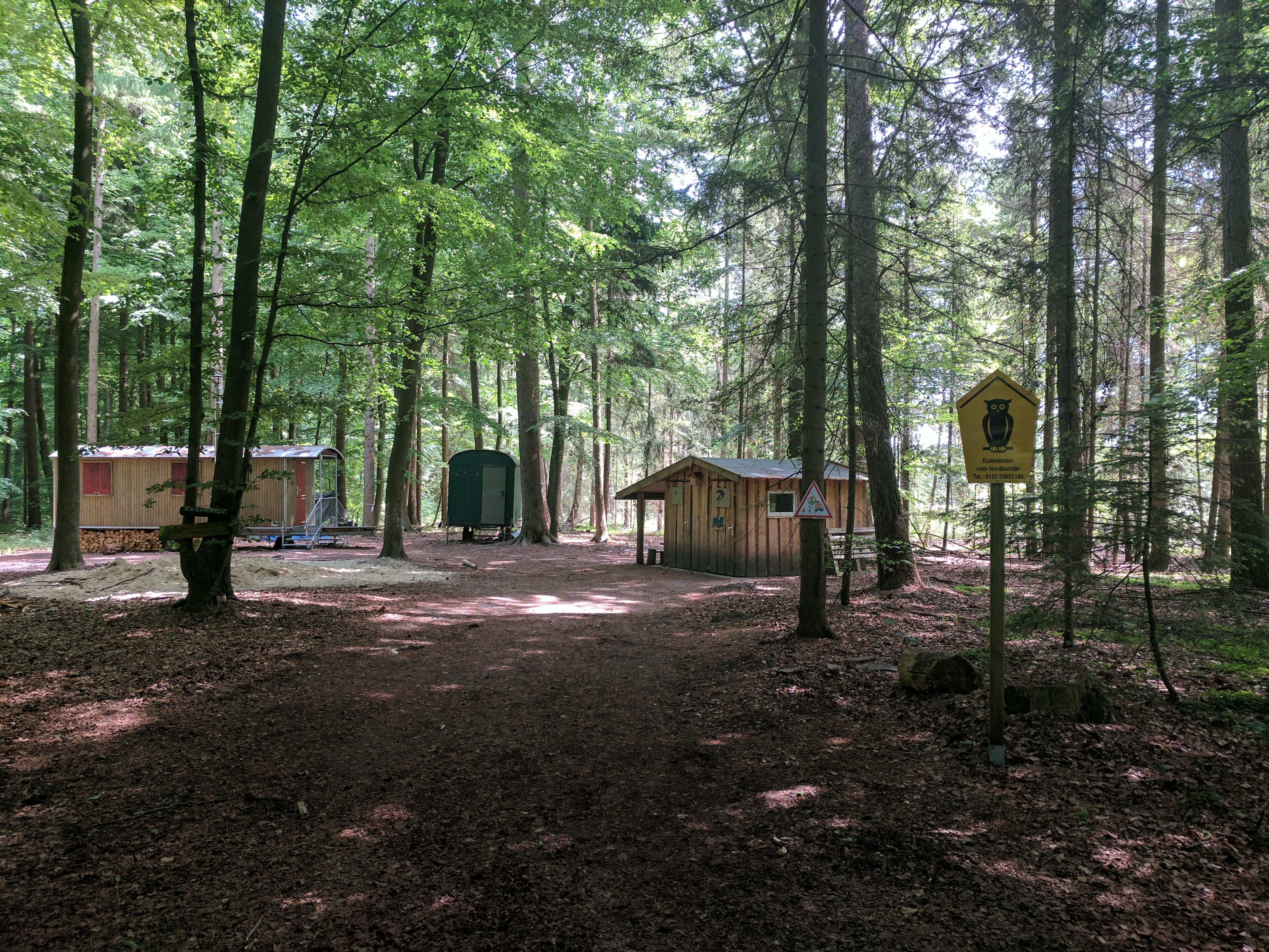 Eventually the road finishes and turns into a path through a forest. There are two people out running, and no-one else. Soon we stumble across a weird, and deserted (of course) clearing with cabins in and a sign saying something about young owls. Don't really know what's going on there, it all feels a bit Freitag das 13th to me.