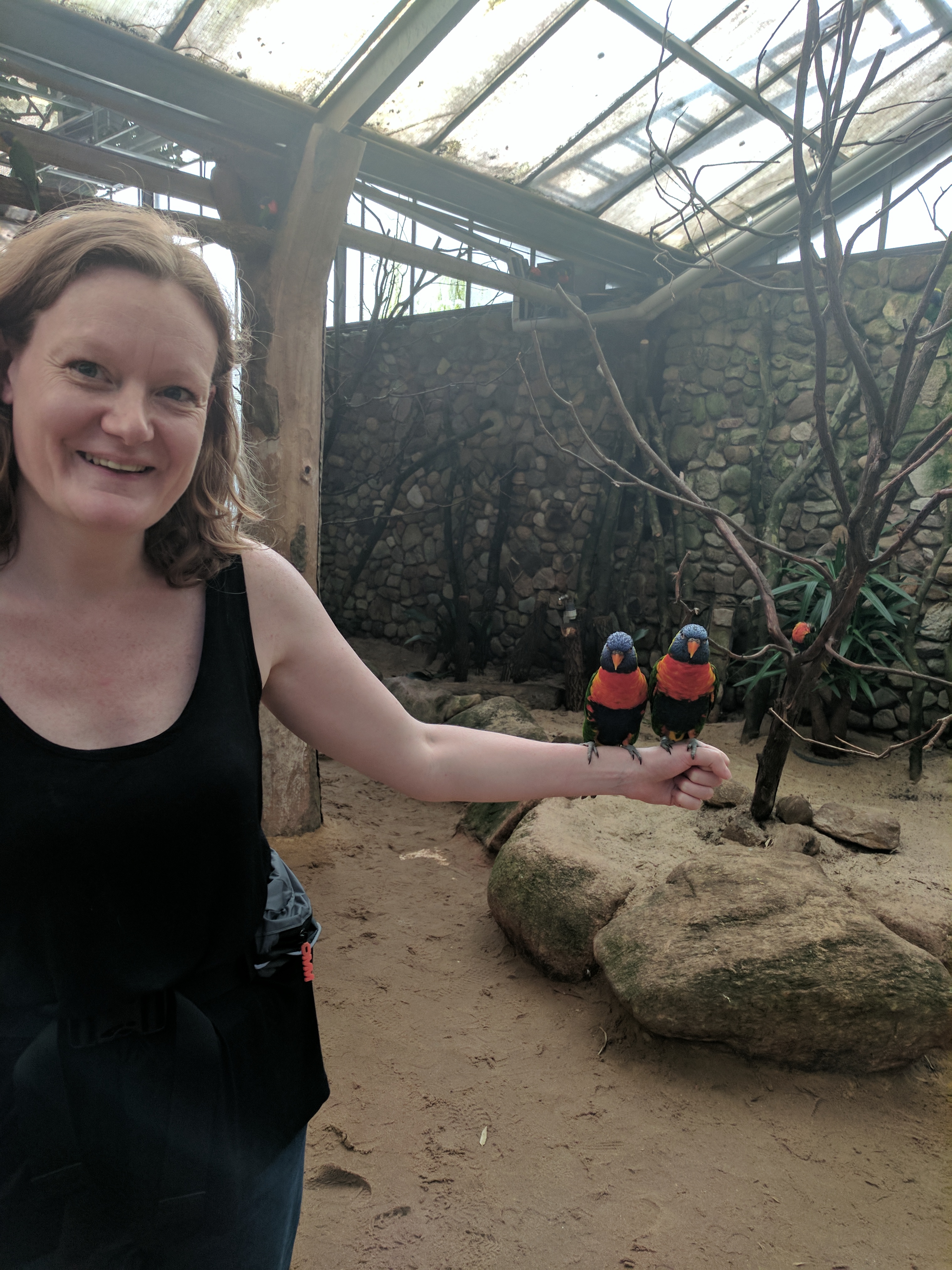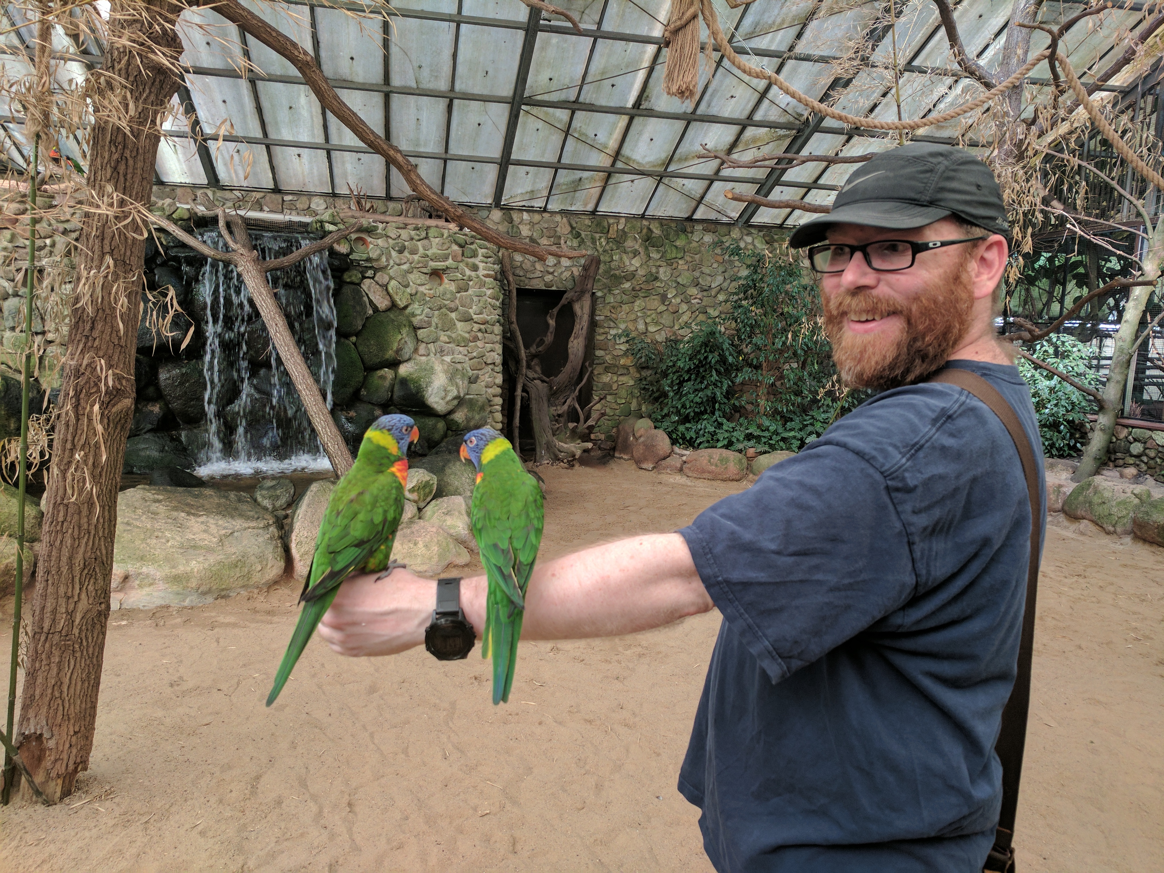 There was a large greenhouse full of waterborne birds, including a fake beach with waves for some of the sea birds. Also a room full of lories(?), in which I was getting close to taking a photo of two on a branch when Helen said "Darren, look behind you".
