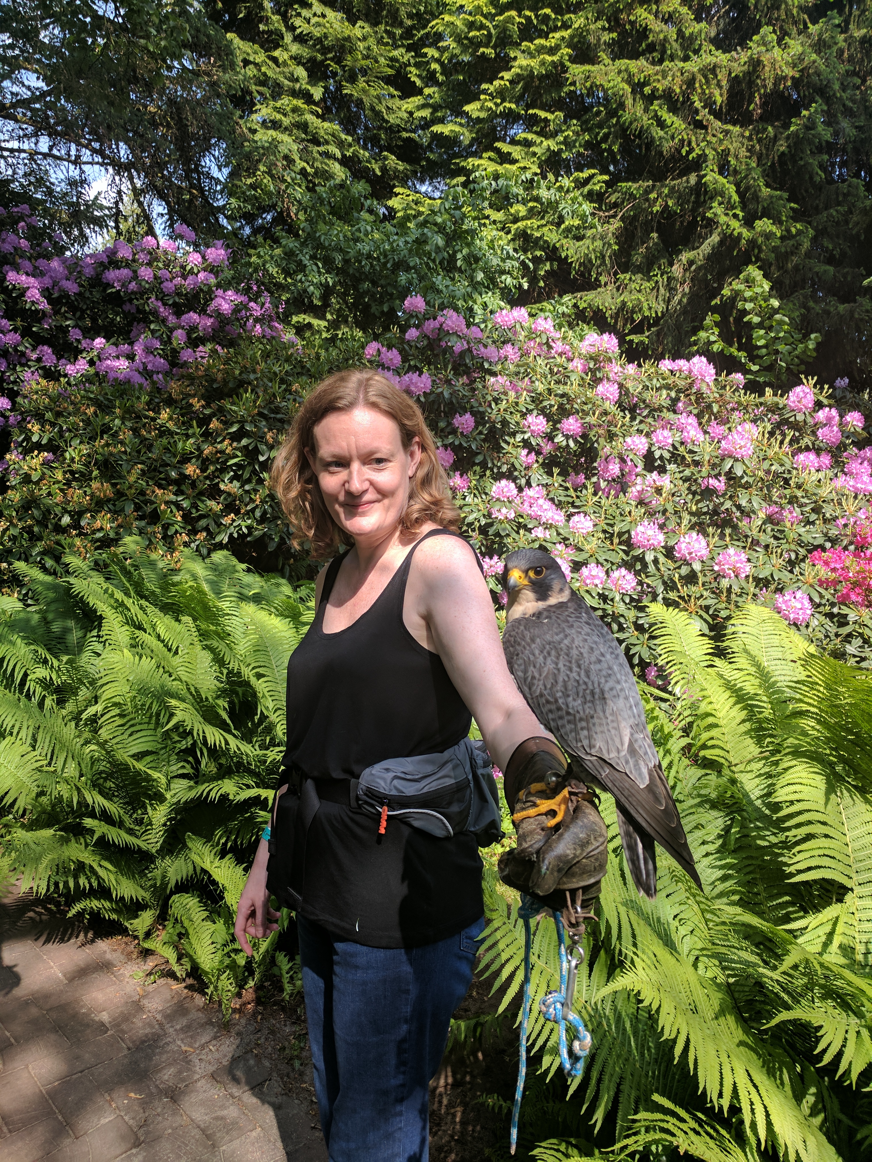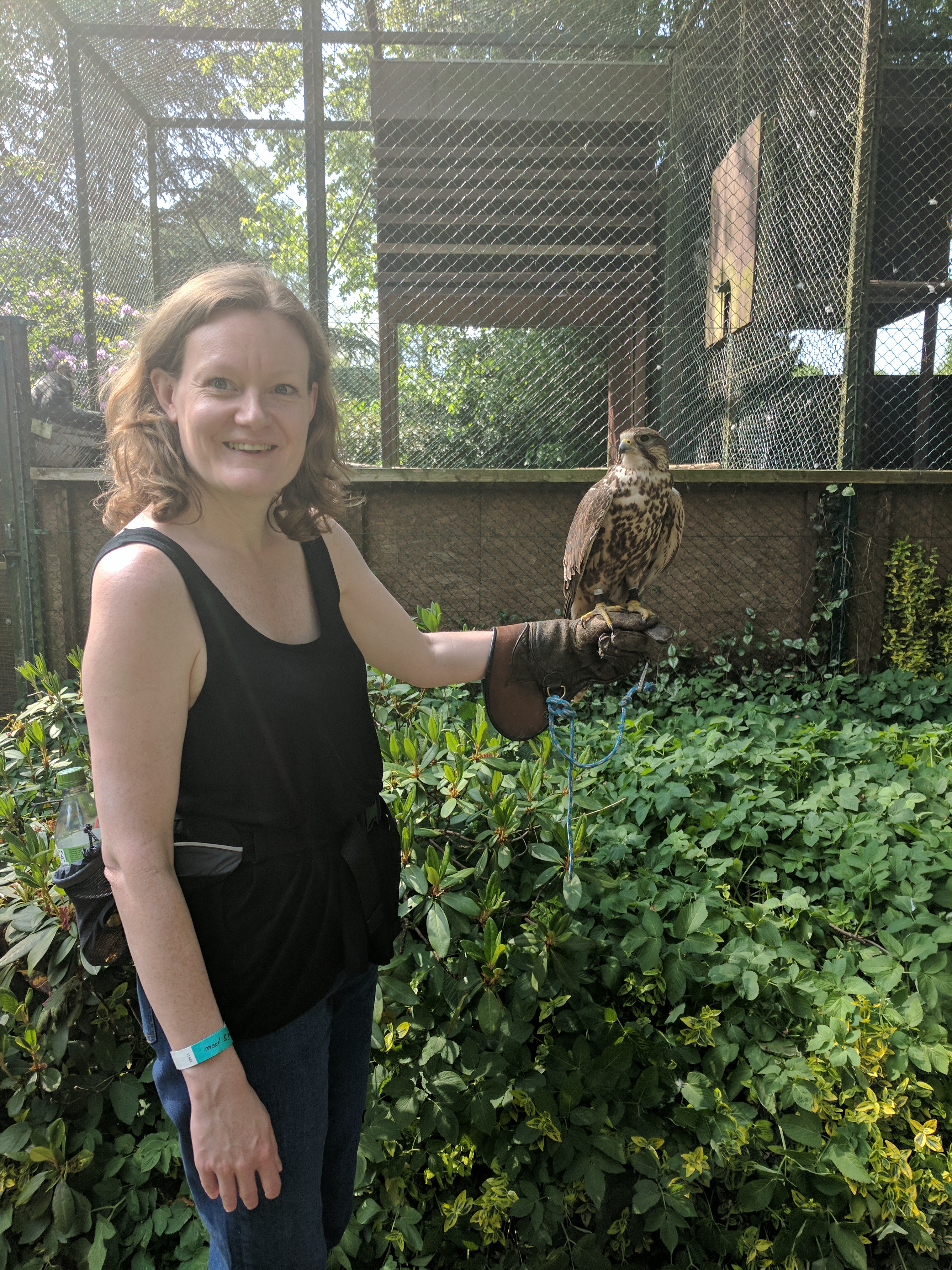 I'd bought a "meet & greet with owls" session, see. Helen really does have a thing about owls so I thought getting up close and personal with them at the world's biggest bird park might be a thing she'd enjoy. But first, we were shown the birds of prey. Here, put this glove on and hold a falcon, will you?