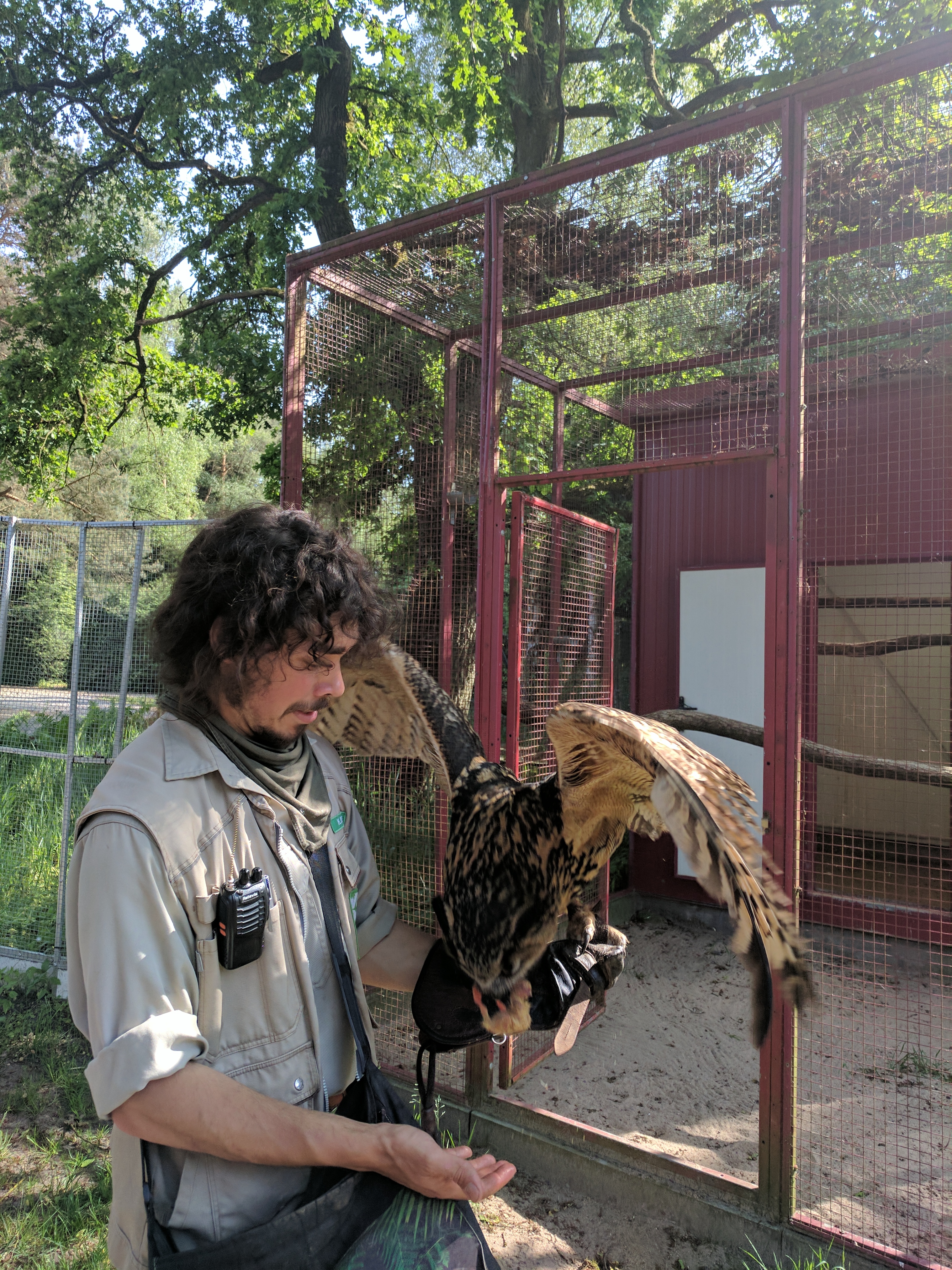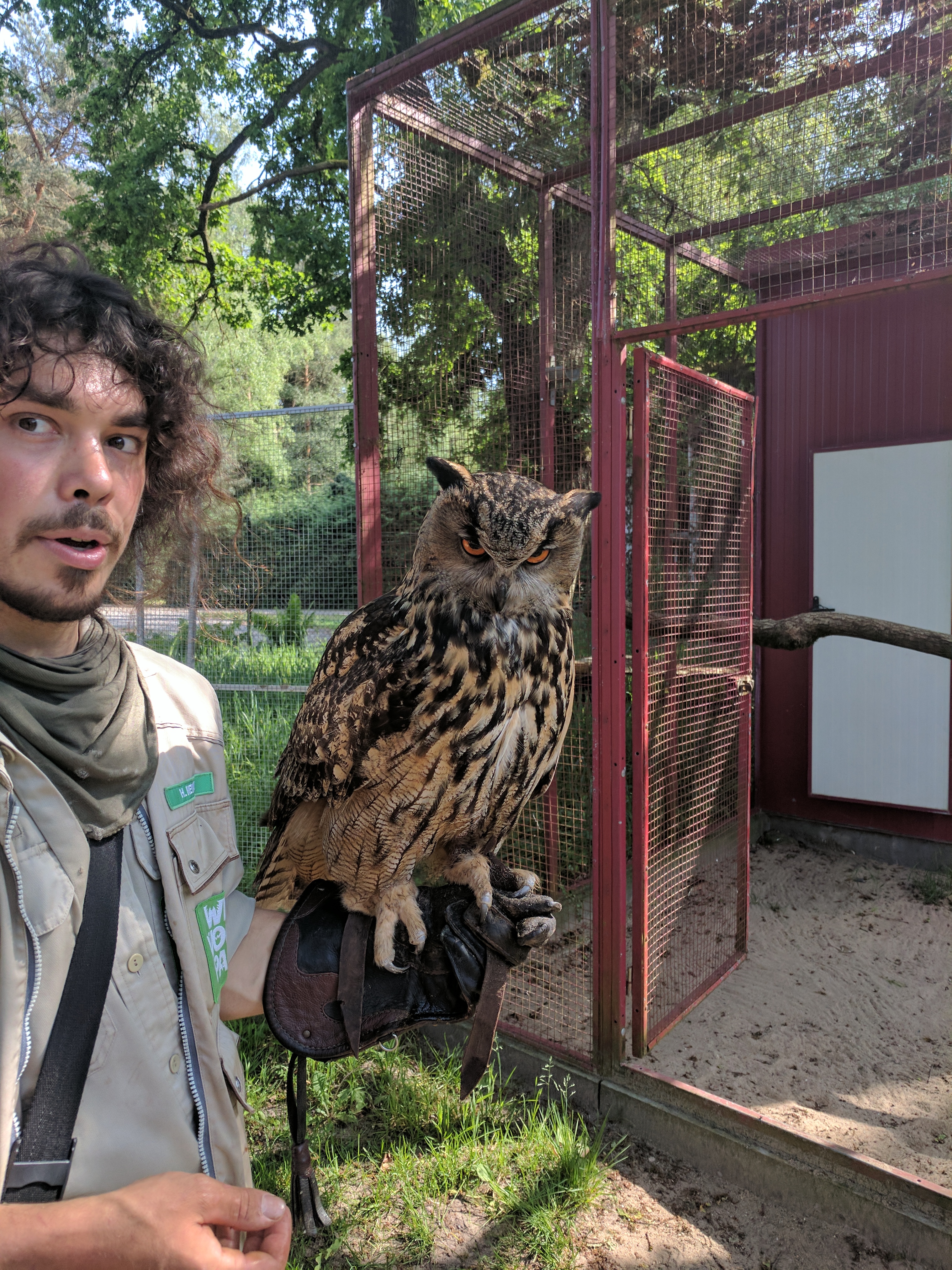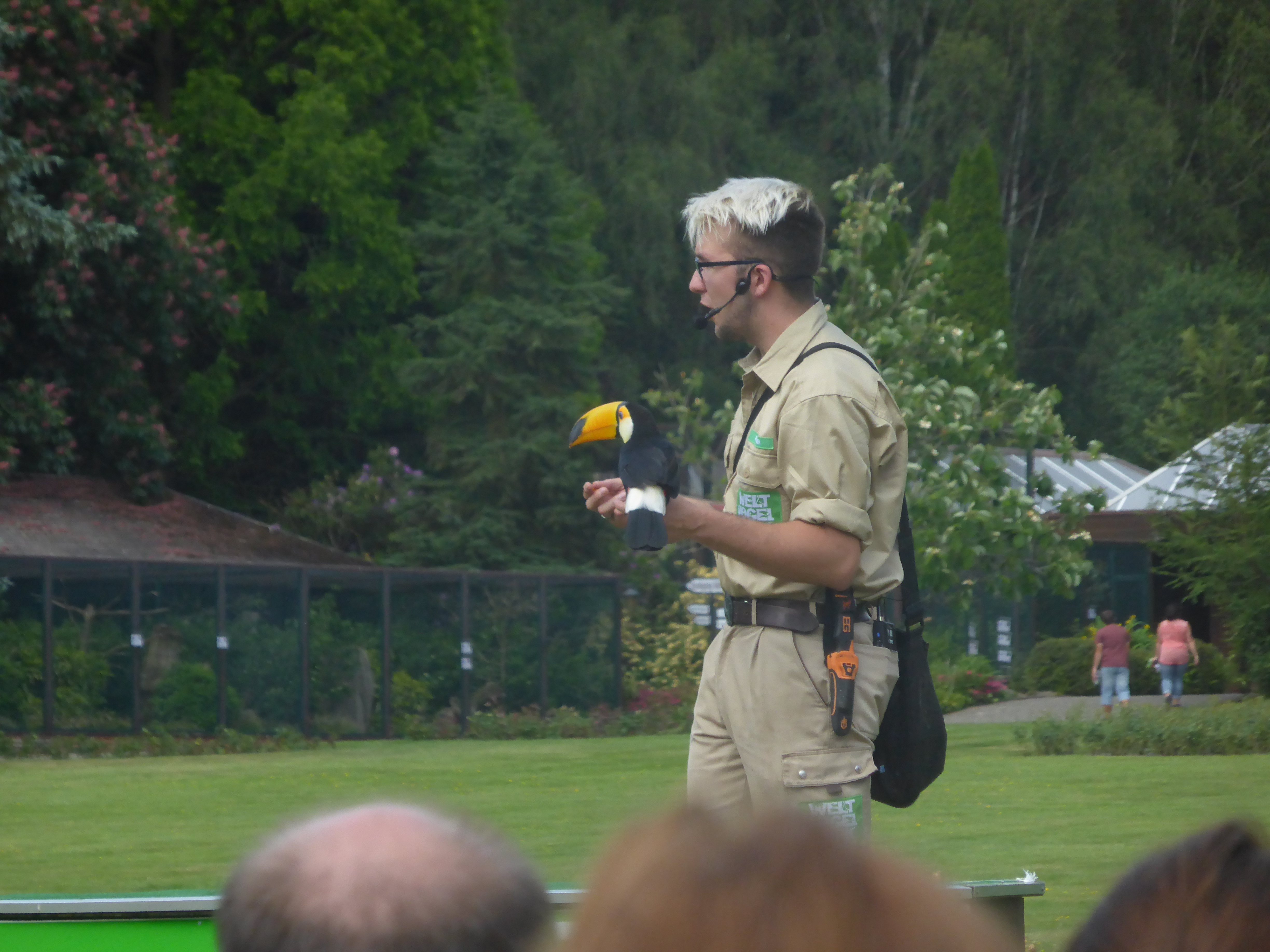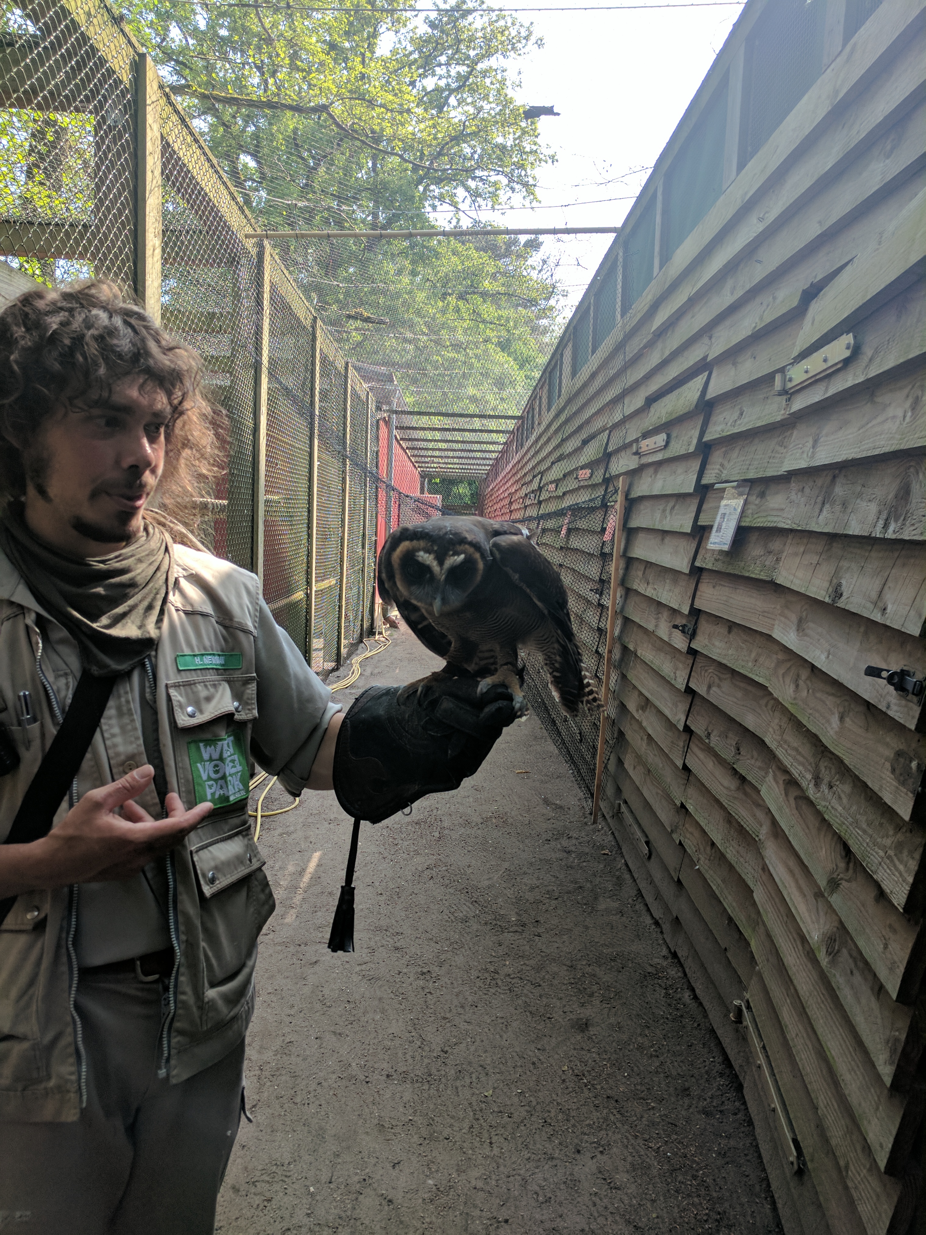 Not everything flew over us. They had a rubbish intransigent owl that wouldn't fly more than 50 centimetres, a toucan (which reminded us of that time we each held a toucan), and some other birds they ran around with. The way they put them away again was for one of the staff to wave lots of food at them, or dress and act in a way that made them give chase.