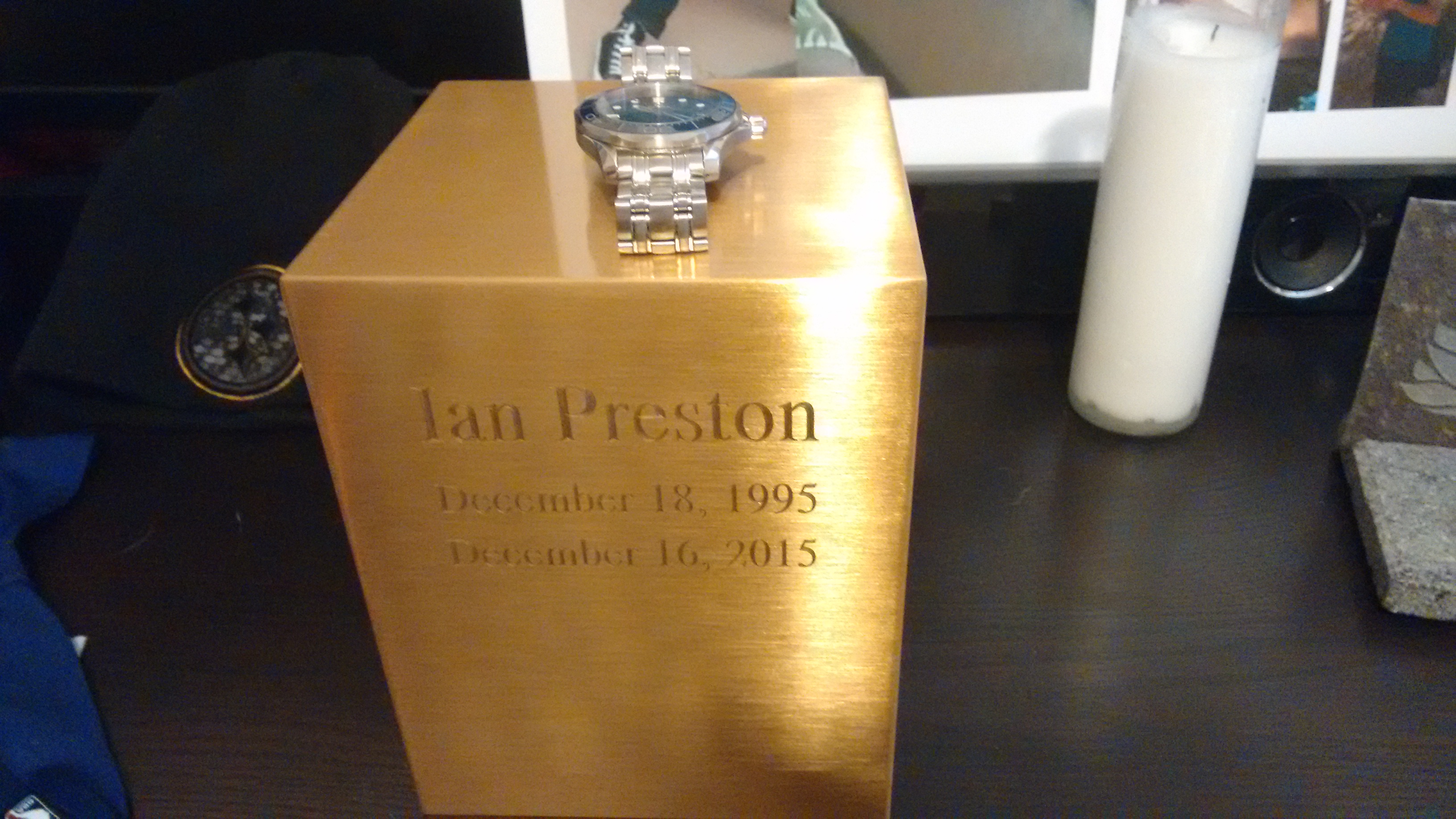 Ian's urn and his favorite watch. December 18, 1995 - December 16, 2015. Just two days before his 20th birthday and our father's 47th. They were planning on going to see Star Wars: The Force Awakens in a theater together (we went to see it together instead).
