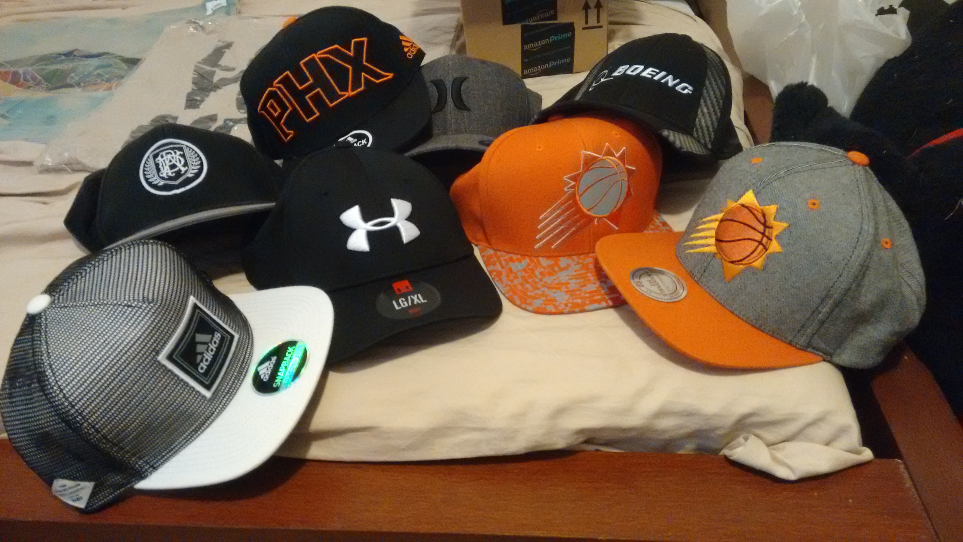 Most of Ian's hats. He was a fan of baseball caps, as you can see. He wore one almost every time we saw him. He also had a ski cap which he liked and wore often. I stole one of his hats as a memento, it's on my bedside table.