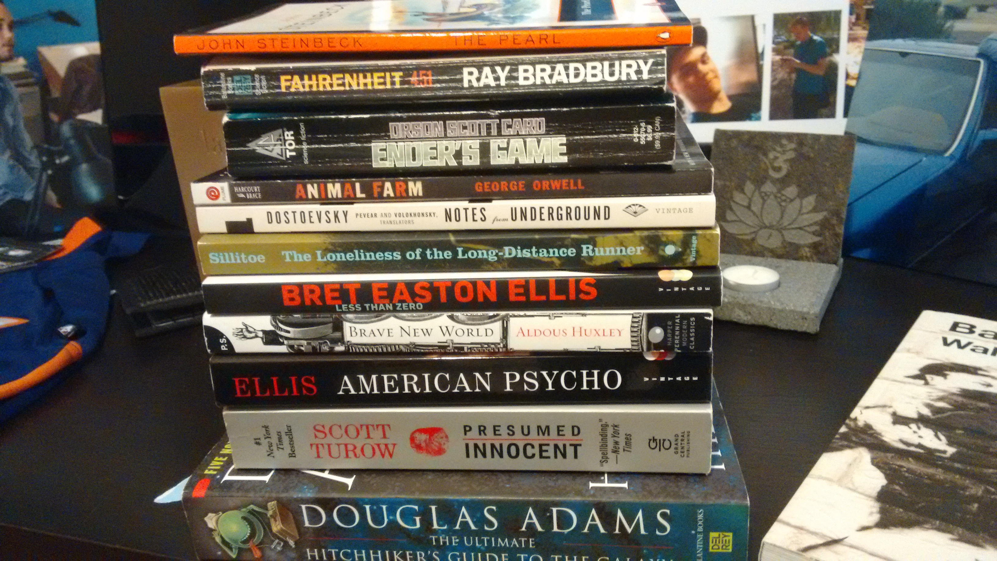Ian's favorite books (taken from his Goodreads account). From top to bottom: John Steinbeck - The Pearl; Ray Bradbury - Fahrenheit 451; Orson Scott Card - Ender's Game; George Orwell - Animal Farm; Fyodor Dostoyevsky - Notes from Underground; Alan Sillitoe - The Loneliness of the Long-Distance Runner; Bret Easton Ellis - Less Than Zero; Aldous Huxley - Brave New World; Bret Easton Ellis - American Psycho; Scott Turow - Presumed Innocent; Douglas Adams - The Ultimate Hitchhiker's Guide to the Galaxy (all 5 books in one).