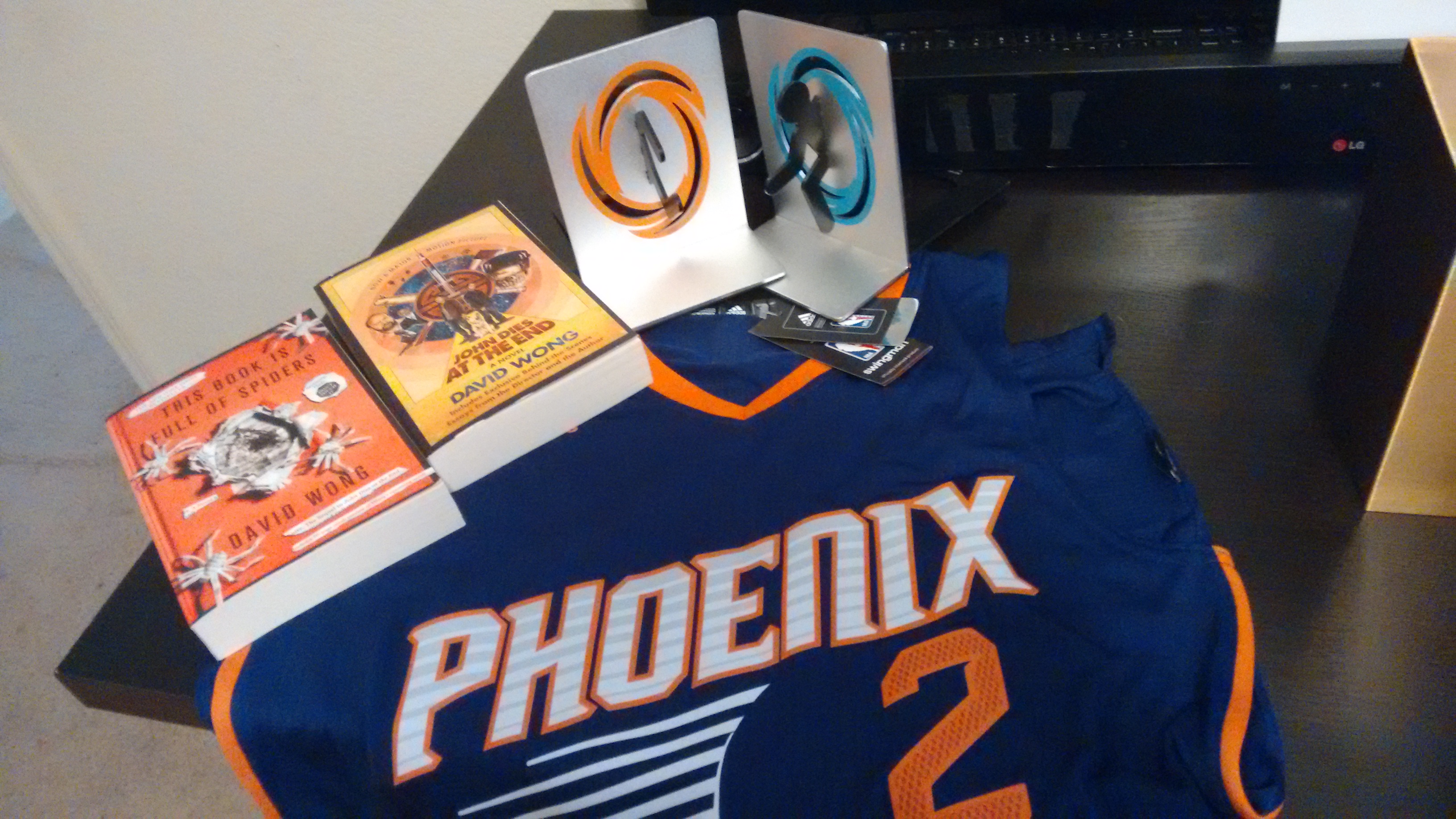 The birthday gifts meant for Ian that he never got to open. From Mom and Dad, a Phoenix Suns jersey that he requested and Portal bookends. He loved the Phoenix Suns (his friend Matt later told us that his favorite player was Brandon Knight), and we watched part of a game as a family the last day we saw him. From me (his sister), the books "John Dies at the End" and "This Book is Full of Spiders." I wasn't sure what to get him, since he's such a pain to buy for (he's rich), so I was really looking forward to seeing what he thought of these. I read them after and actually quite liked them, even though they are very dirty!