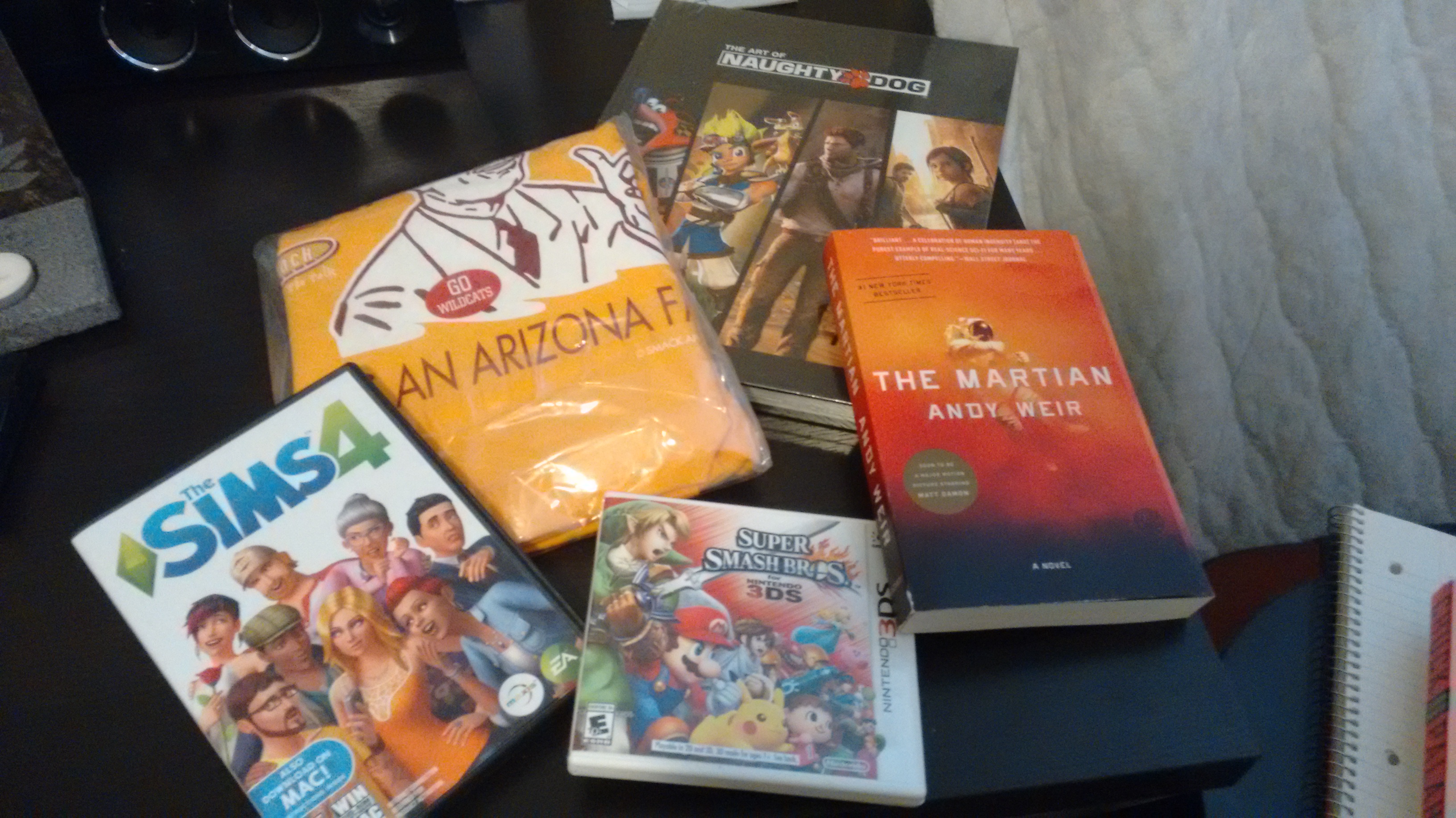 Ian's gifts to his family that he never got to give us. (Since our mom's birthday was the last time we saw him, he gave her gift to her then in person) For Dad, the "Art of Naughty Dog" book, because our dad loves the Jak and Daxter series (we named our dog Daxter, and it is literally the only video game he will play), and the yellow T-Shirt. For his little sister (me), The Sims 4 (I already owned this, but Origin was giving me trouble and I couldn't install it. Unfortunately the disk didn't work either, but it was so sweet of him!), Super Smash Bros 4 (he also gave me the original for the Nintendo 64 along with the console itself, so thanks to him I own every single edition of this game!), and The Martian (I'm not 100% sure it was for me, but I read it and loved it anyway.)