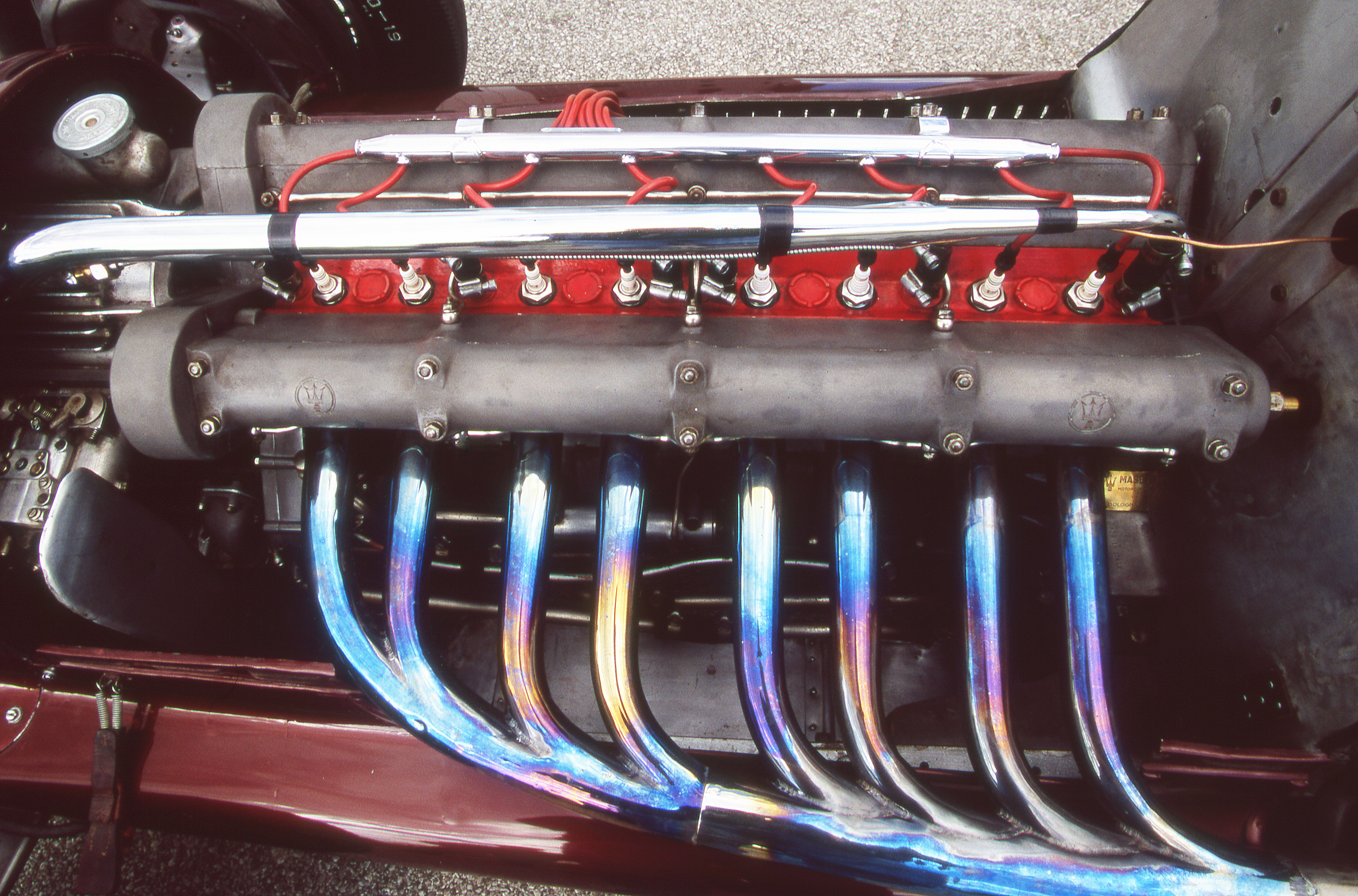 Maserati’s 3.0-liter twin-cam straight-8 had two blocks of four cylinders and two superchargers. Its cylinder head was a Testa Fissa, meaning it was fixed to the blocks. This did away with the head gasket and allowed for higher boost pressures. Horsepower was said to be 350-365.