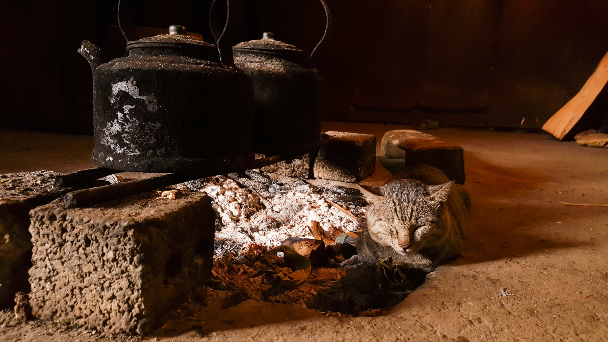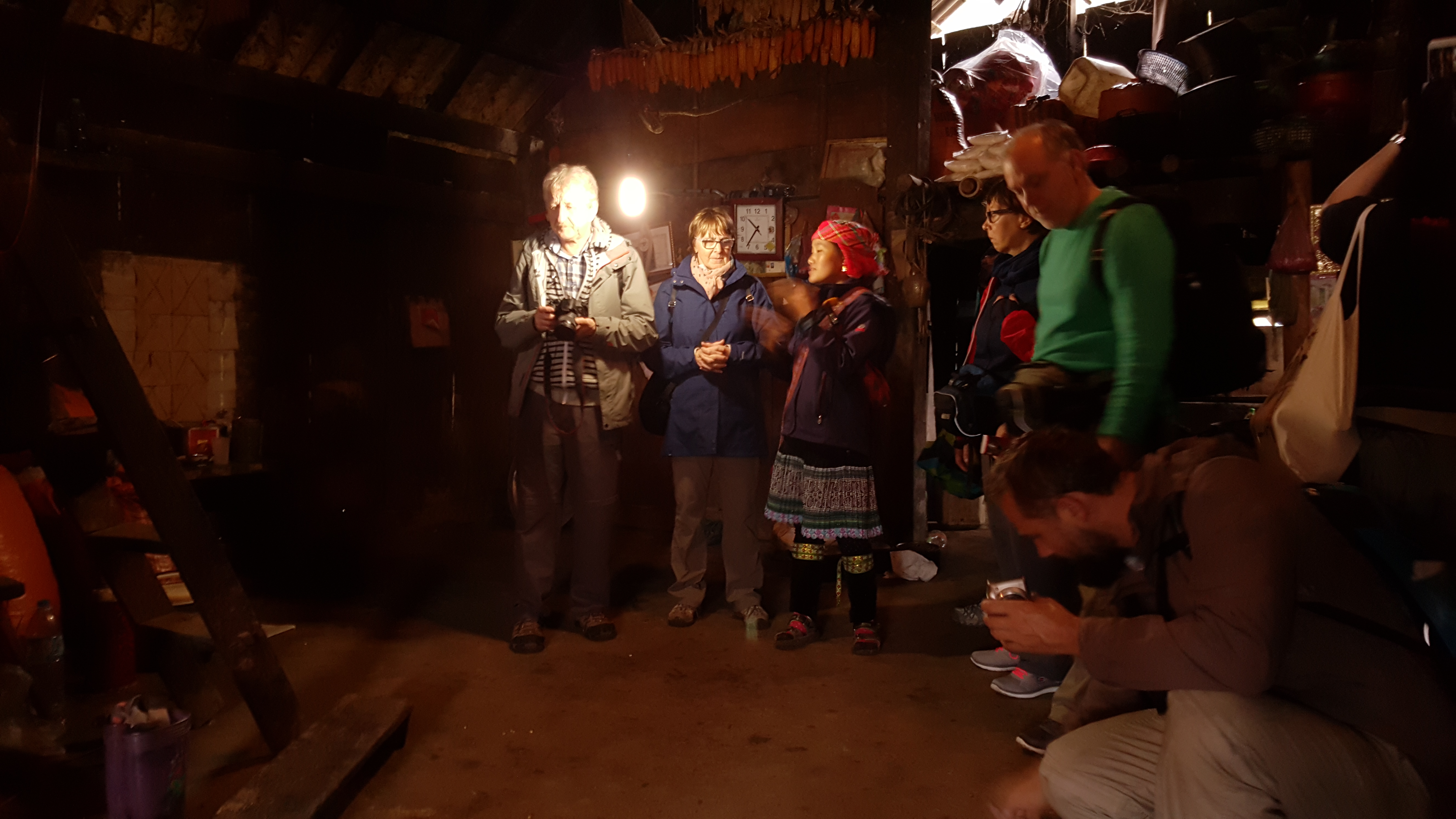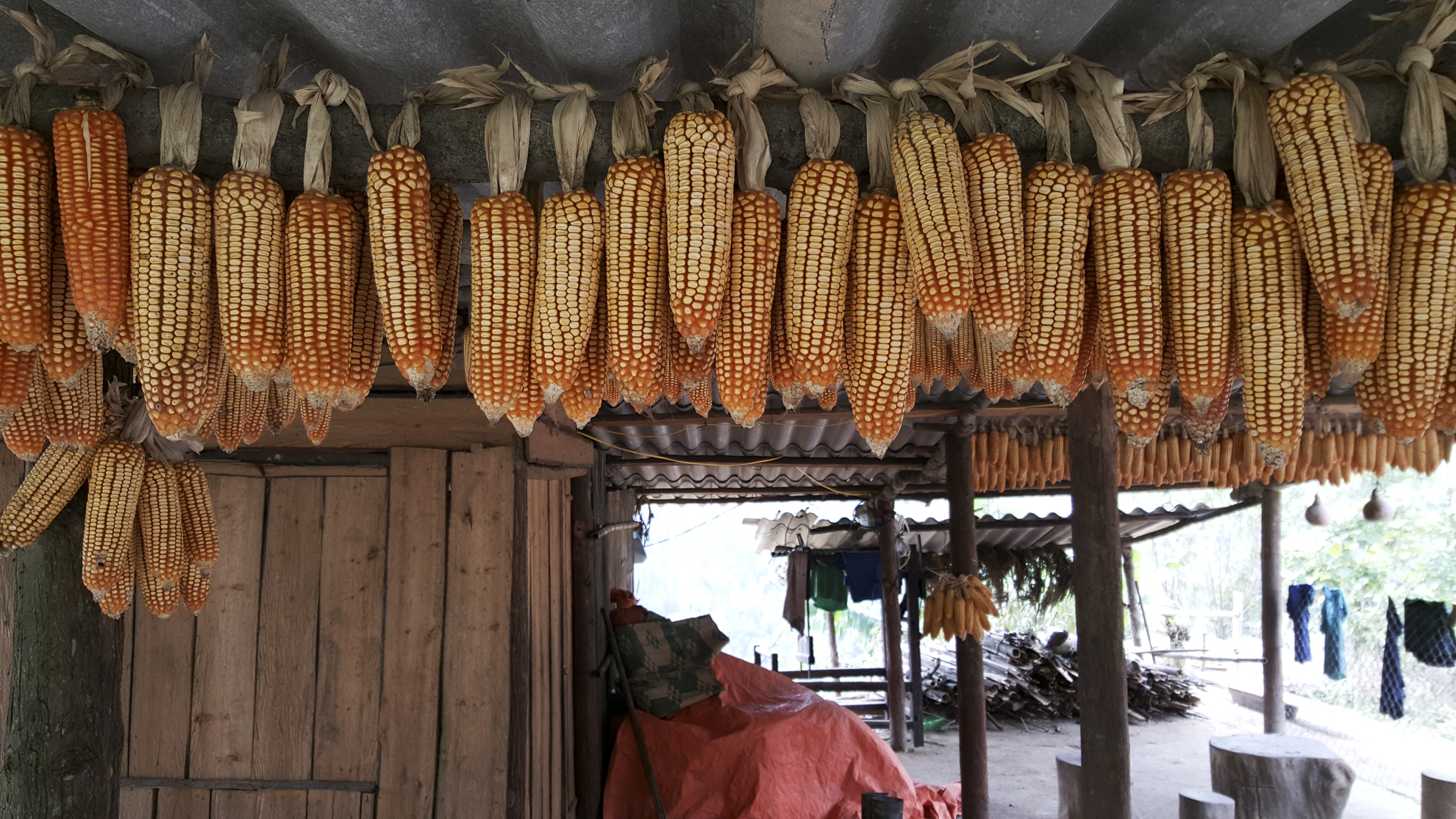 Bau welcomed us into her home. Inside, a single light bulb lit up the living area. It was extremely dark. A rice cooker, a radio and a small TV sat on the earthen floor in the corner of the living room. I guess I could call it a loft apartment, as it is has a smaller second floor area for storage of food stuff such as rice and corn. In the kitchen, a few pots of left over food were left on the floor. "For pig food," she explained.