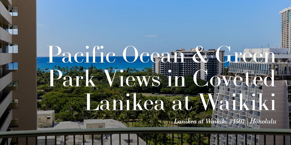 ワイキキで最も人気が高く大変希少なラグジュアリー・コンドミニアム・レジデンス ”Lanikea at Waikiki”のご紹介です。15階に位置する本ユニットのリビングエリアと両ベッドルーム、そして併設された屋根付きラナイからの雄大なパシフィック・オーシャン・ヴューと美しい緑地公園の眺望は正に圧巻。