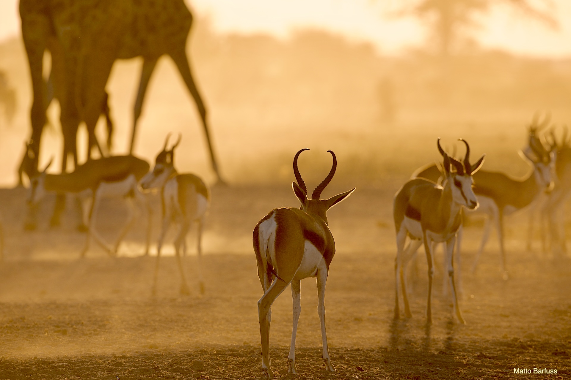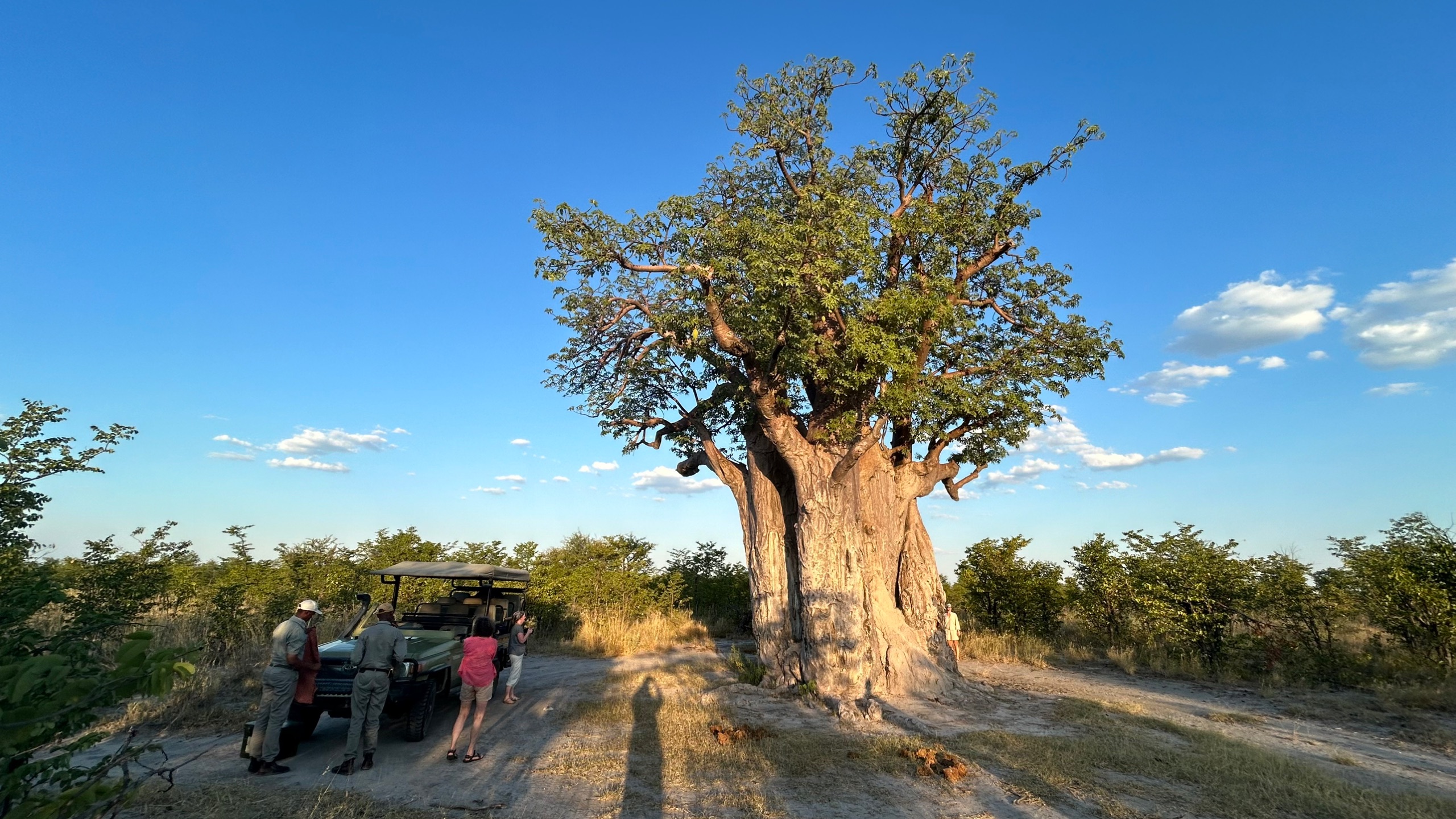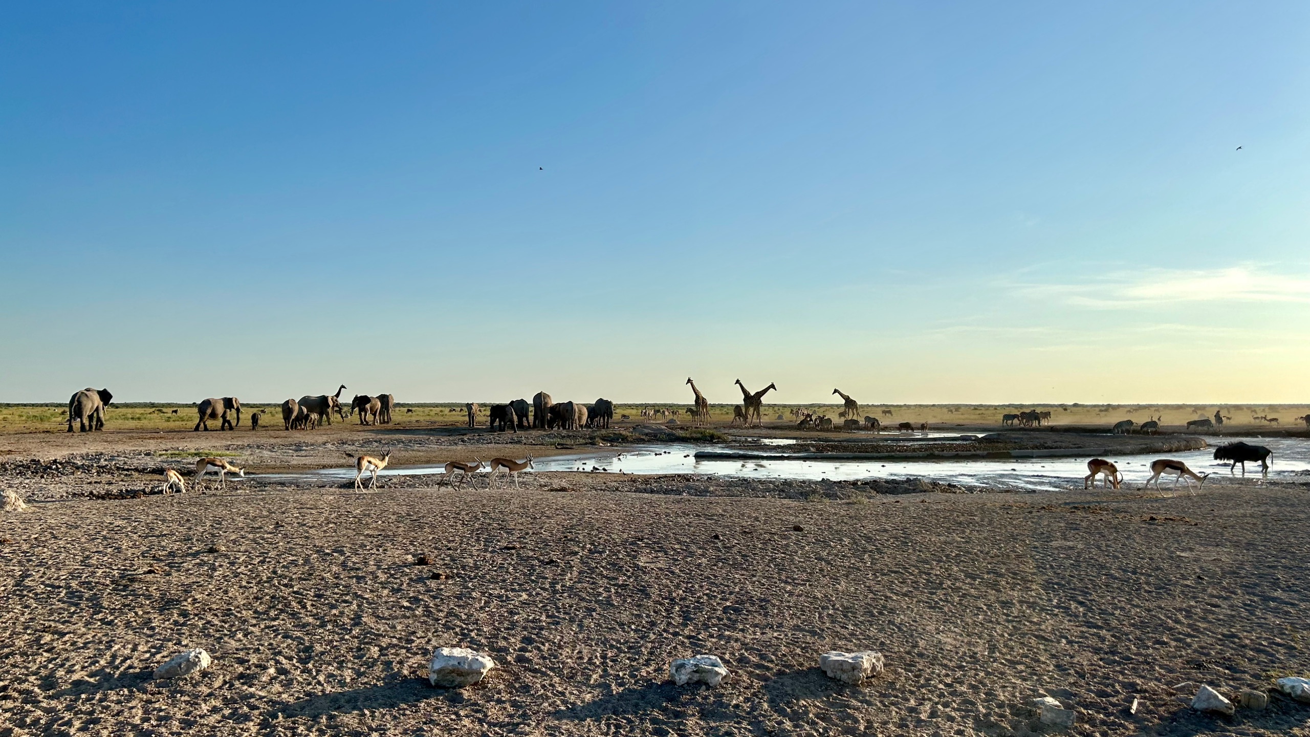 Trotz internationalen Flug geht es am ersten Abend gleich auf die erste Pirschfahrt. Ziel ist das gepumpte Wasserloch. Trotz Regenzeit ist aber nicht viel Wasser da. Eher Schlamm und das gibt schon den Hinweis: Die Kalahari steht auf der Schwelle einer großen Dürre. Wir alle sind froh, dass wir nun wenigstens noch den feuchteren Teil des Jahres erleben dürfen.