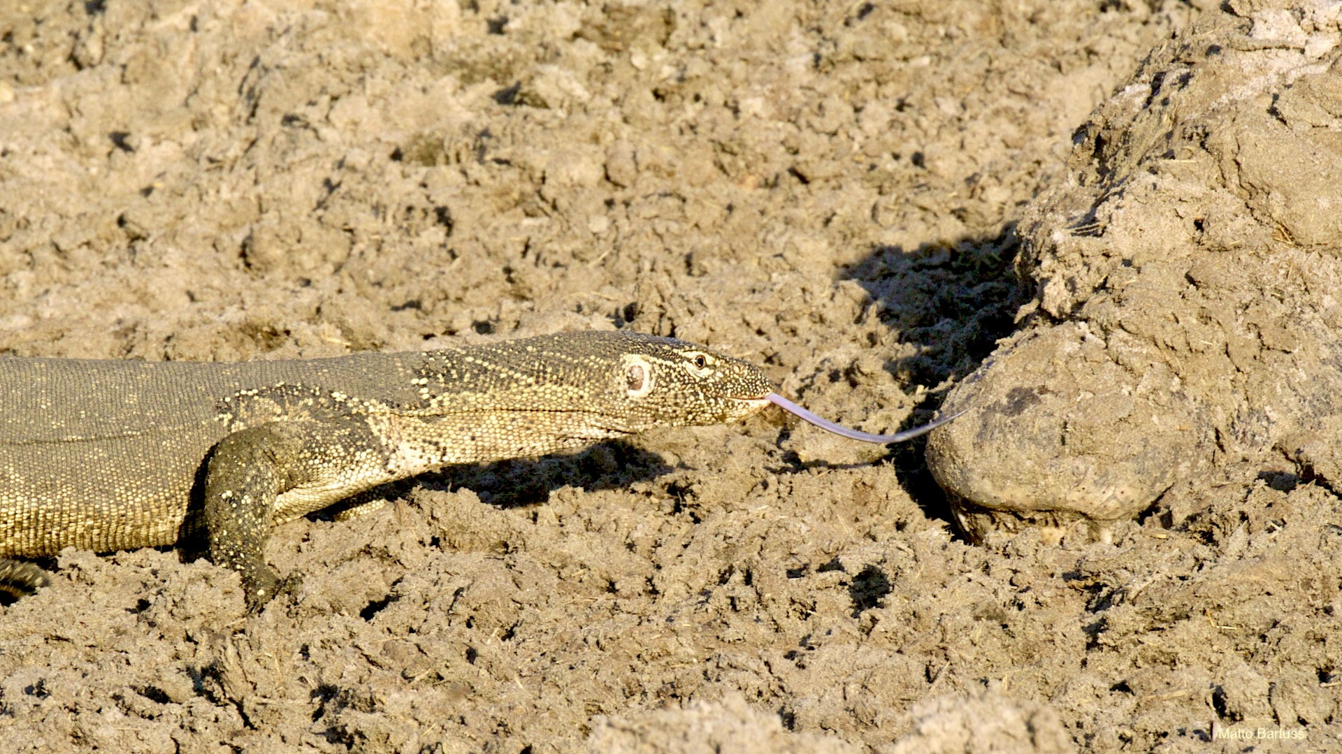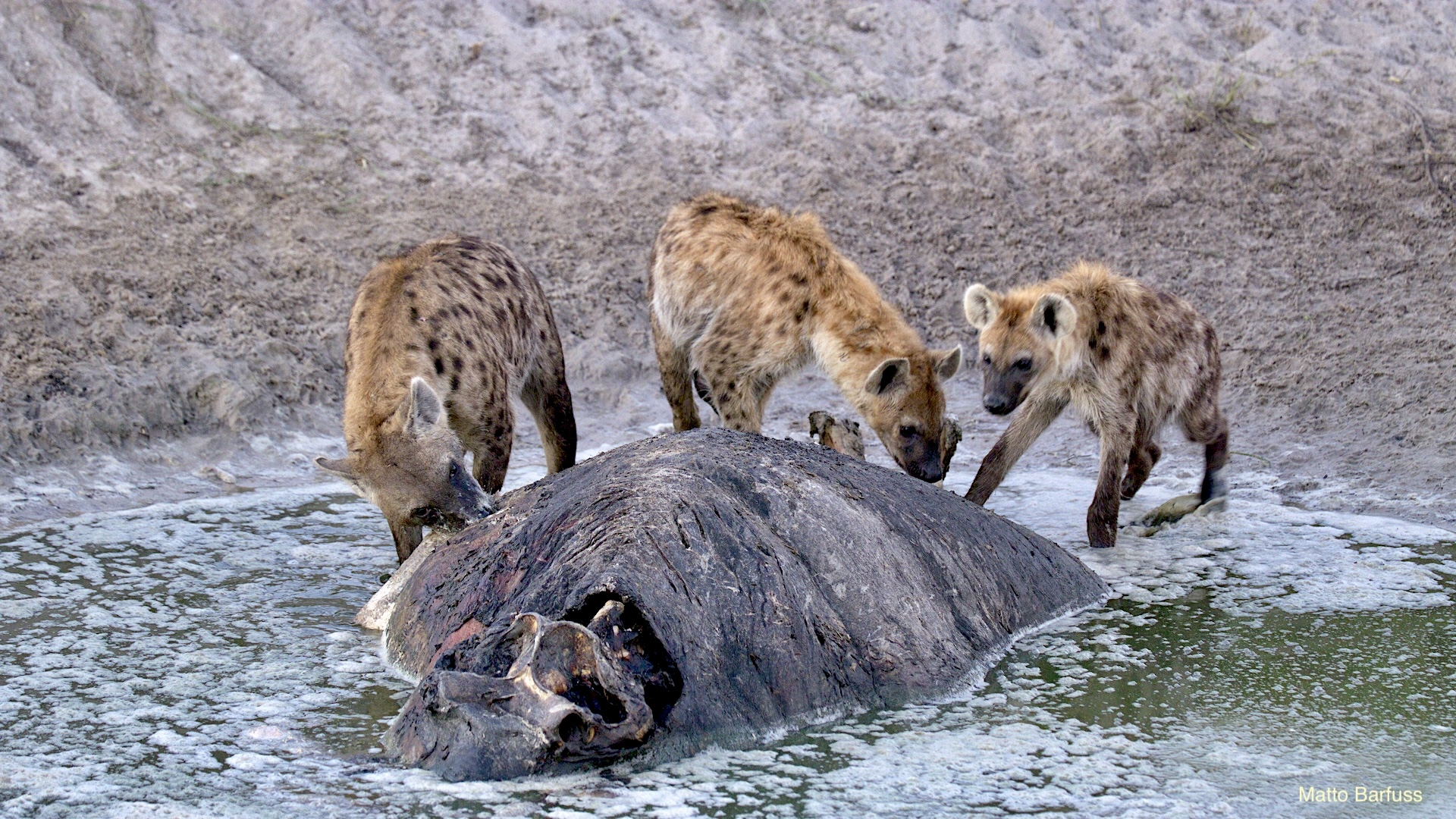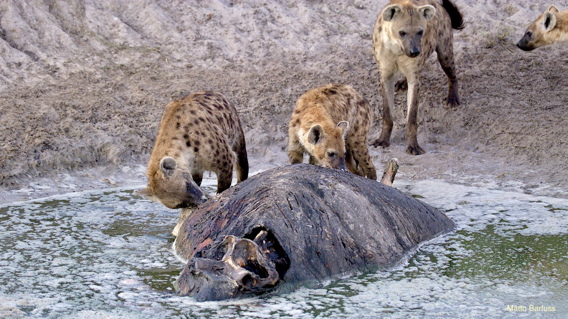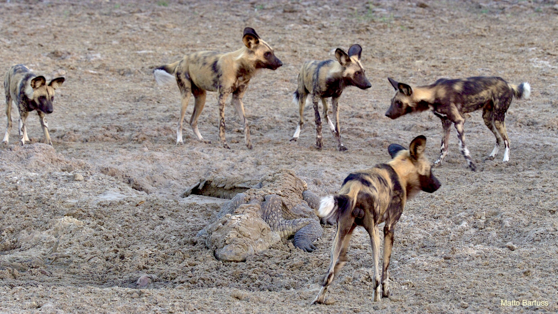 Dieses Krokodil hat schlicht seinen Tümpel an ‚Sonne&Hitze‘ verloren. Kein Problem. Das Krokodil „fährt sein System runter“ und wartet auf bessere Zeiten. Komisch, meinen die Wildhunde. Das Krokodil jedenfalls findet es nicht lustig, von hungrigen Hunden angegafft zu werden.