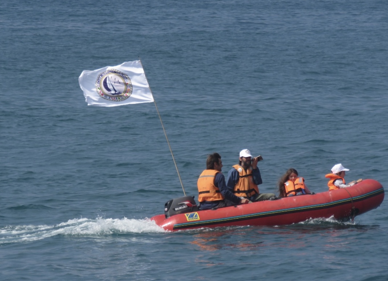 Una vez reunidos en la playa el Claron se procede a la maniobra de embarque, todos los participantes se ponen sus chalecos salvavidas y abordamos un bote Zodiac que nos llevará al velero que se encuentra a 200 metros.