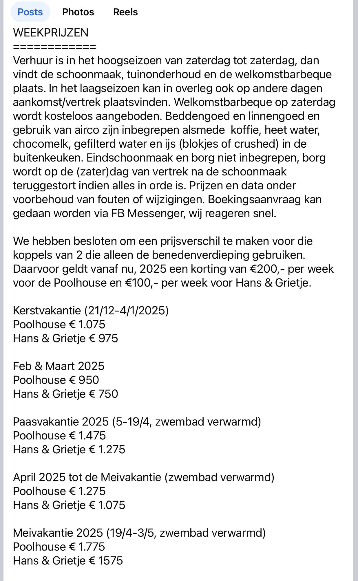 Verhuur is in het hoogseizoen van zaterdag tot zaterdag, dan vindt de schoonmaak, tuinonderhoud en de welkomstbarbeque plaats. In het laagseizoen kan in overleg ook op andere dagen aankomst/vertrek plaatsvinden. Welkomstbarbeque op zaterdag wordt kosteloos aangeboden. Beddengoed en linnengoed en gebruik van airco zijn inbegrepen alsmede koffie, heet water, chocomelk, gefilterd water en ijs (blokjes of crushed) in de buitenkeuken. Eindschoonmaak en borg niet inbegrepen, borg wordt op de (zater)dag van vertrek na de schoonmaak teruggestort indien alles in orde is. De eindschoonmaak voor de Poolhouse bedraagt € 115, voor Hans & Grietje €95. Borg €500 en wordt meteen teruggestort op de zaterdag van vertrek na de eindschoonmaak. Prijzen en data onder voorbehoud van fouten of wijzigingen. Boekingsaanvraag kan gedaan worden via FB Messenger, wij reageren snel.