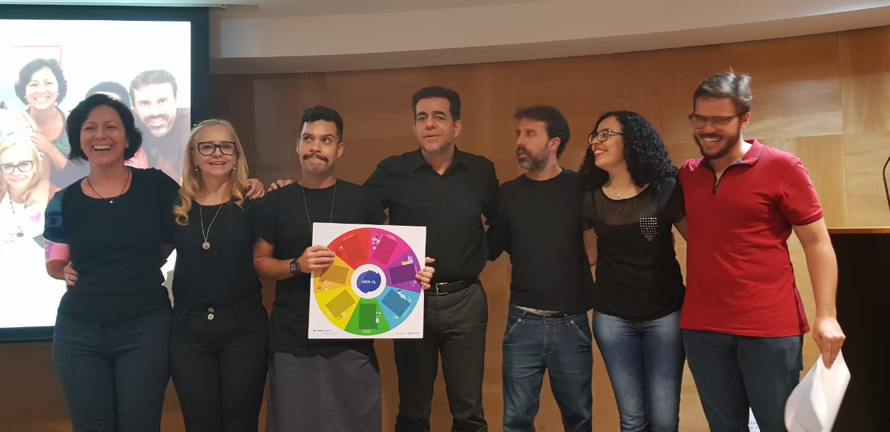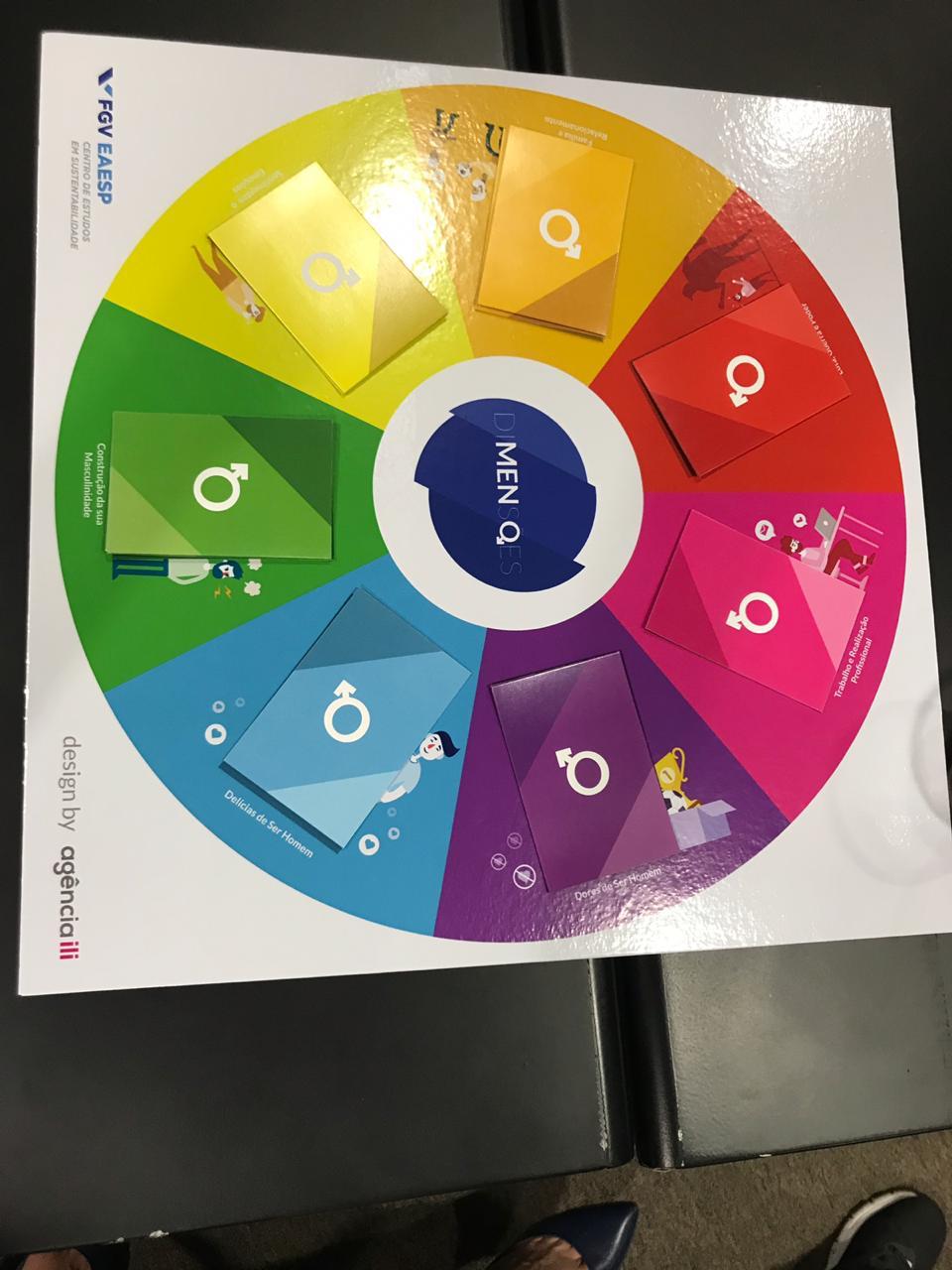 Dessa forma, co-criamos um jogo lúdico para sensibilizar homens no ambiente empresarial sobre as dimensões do masculino. Para elaborar o jogo, escolhemos 7 dimensões que o grupo entendeu ser as mais importantes para o universo do homem no mundo corporativo e começamos a pensar no conteúdo a ser inserido no jogo. Para trazer esse conteúdo bebemos muito nas fontes da bibliografia consultada. Para elaborar o jogo, contamos com o apoio do Fabiano Onça, um especialista que nos trouxe noções básicas da gameficação e ajudou muito. Aprendemos também que esse mundo de jogos é fascinante e também complexo, mas tem muito potencial para sensibilizar pessoas. O jogo se materializou mesmo depois dos dois momentos de prototipagem propostos em sala de aula: matriz disciplinar e o momento de ouvir pessoas da turma, porém de outros grupos. Assim nosso produto ganhou vida!