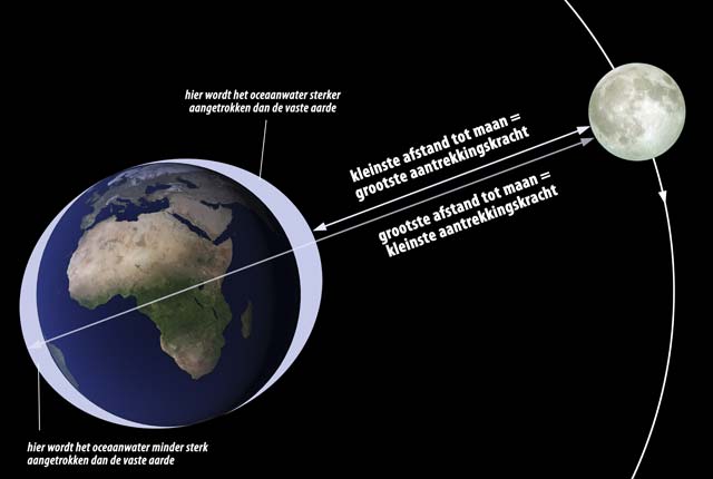 Per dag is het 2 keer eb en 2 keer vloed. Bij vloed is het water hoog en dicht bij de duinen. Eb betekent dat het water laag staat en verder weg. Soms vallen hele gebieden droog als het eb is. Het strand is dus groter als het eb is en kleiner als het vloed is. Je zou niet verwachten als je op het strand staat, maar de maan heeft veel te maken met eb en vloed. De aarde, zon en maan werken namelijk als magneten op elkaar. De maan trekt het water op aarde naar zich toe. Daardoor ontstaat vloed. De aarde draait langzaam rond, waardoor de maan steeds een ander stuk water naar zich toetrekt. Als het water niet wordt aangetrokken door de maan wordt het eb.