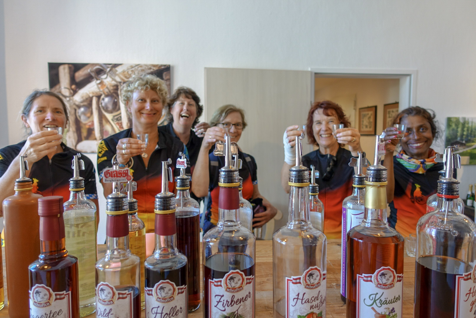 It was then time to head into Salzburg, along a most beautiful route following the aqua marine river as it wound its way through the glorious country side. Before long passports in hand we reached the boarder from Germany into Austria expecting a maned checkpoint, but it wasn’t to be. Instead just down the road we were met by our personal local escort, Kristian and Gabi who kicked off our celebratory proceedings with a visit to a distillery with an informative video, tastings, and a number of purchases!