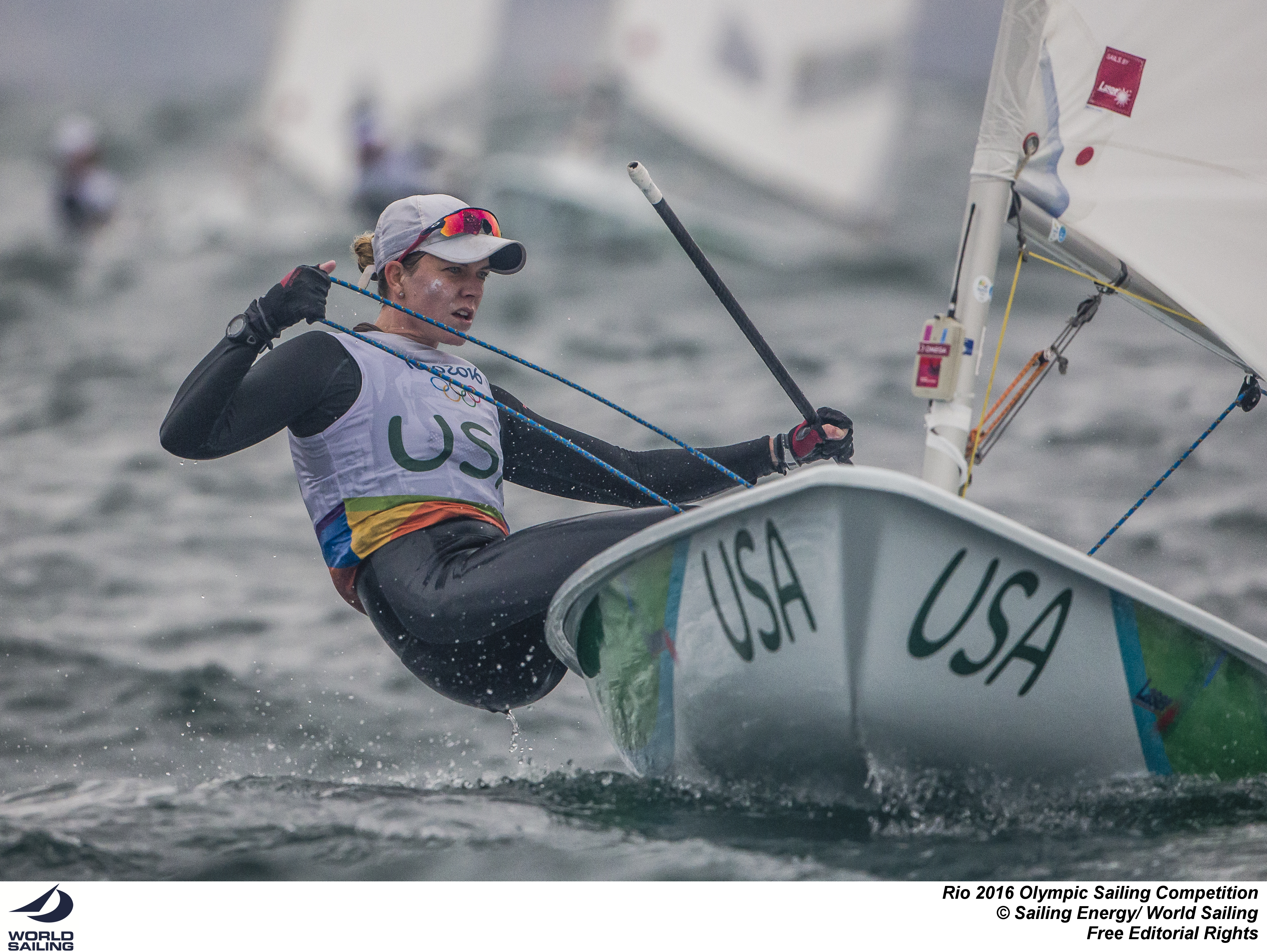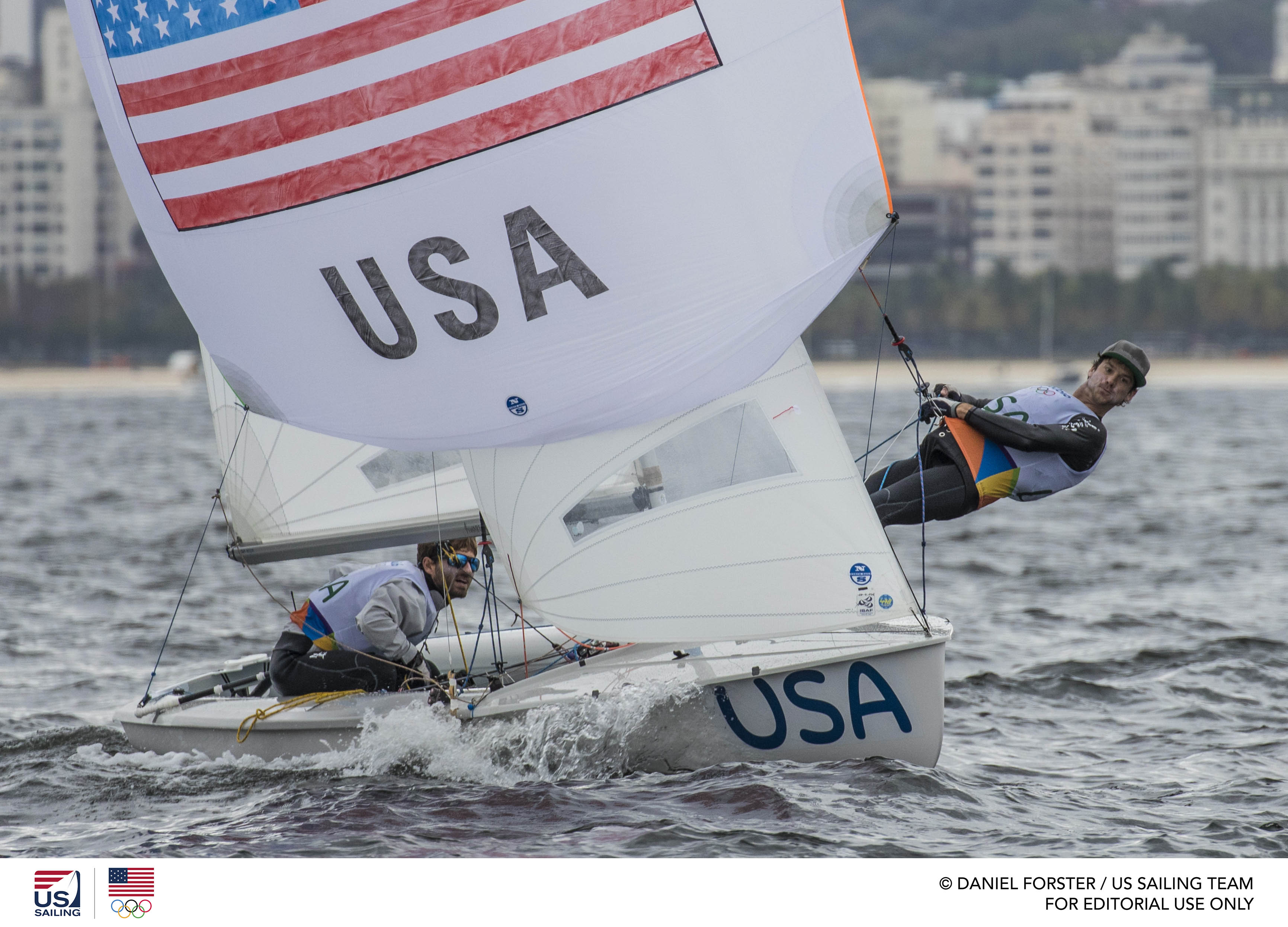 Rio de Janeiro, Brazil – The sailing venue at the Rio 2016 Olympic Games continues to surprise and challenge hundreds of the world’s best athletes and coaches with unpredictable weather, and the third day of competition featured the toughest racing yet. Light winds in the early afternoon gave way to rain on the “Pao” (Nacra 17) and “Escola Naval” (470) race courses on Guanabara Bay, which also brought heavier and shiftier breezes. Meanwhile, Laser, Laser Radial and Finn sailors competing on the Copacabana and Niteroi open-ocean courses battled consistent 25-knot winds with waves over eight feet in height. Despite the challenges, Team USA submitted strong scores throughout the day and is in the top ten overall in five of the eight active classes.
