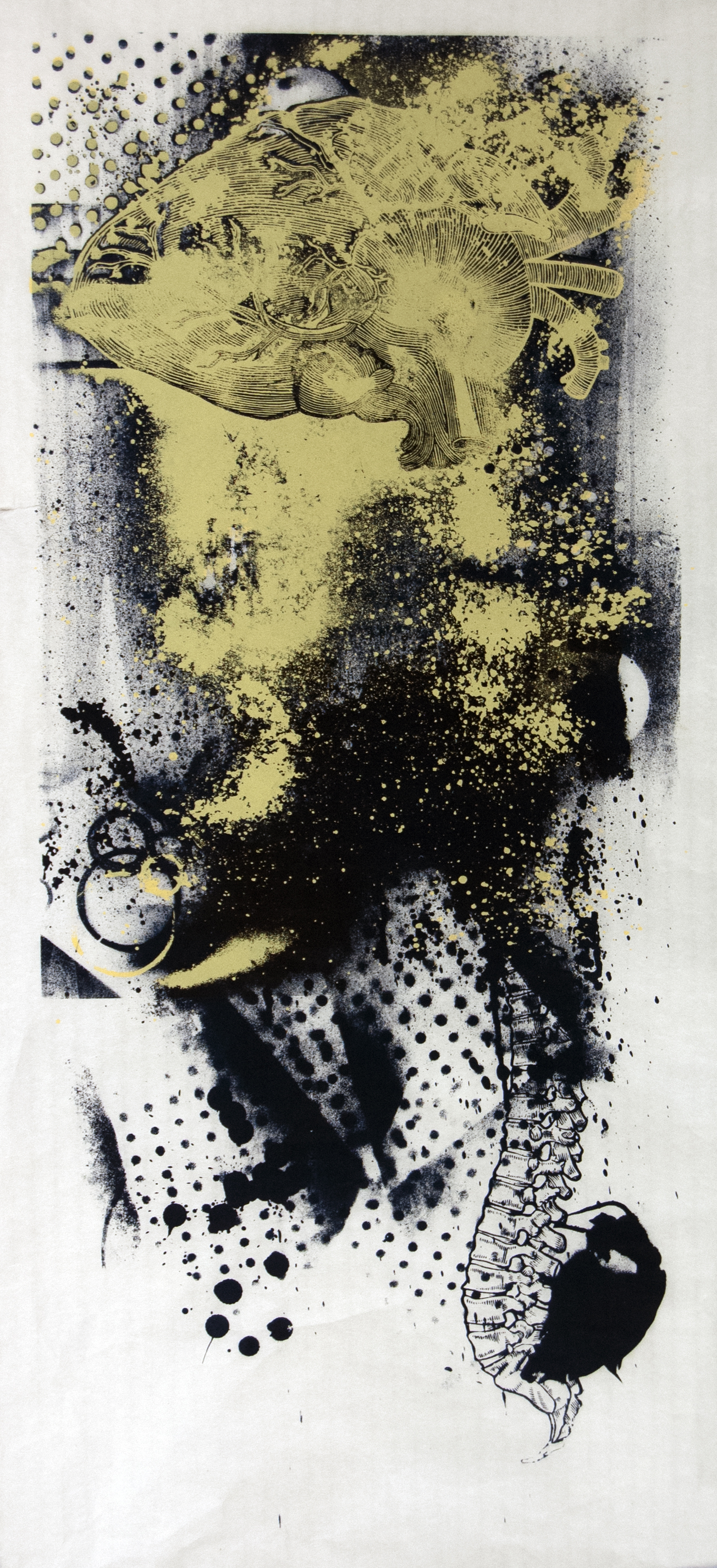 - si versa il colore sul telaio e con la racla si esercita la pressione necessaria per far passare l’inchiostro da un lato al lato opposto della matrice facendolo depositare sul supporto;