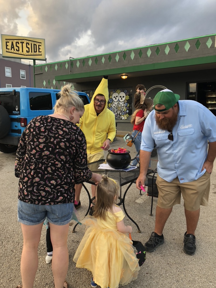 6:36 p.m.: John Williams, owner of East Side, and manager Kregg Ross enjoy passing out treats. Ross, in the banana suit, says this year’s Trick or Treat fest has been busy. #halloween #denton #untmojof18